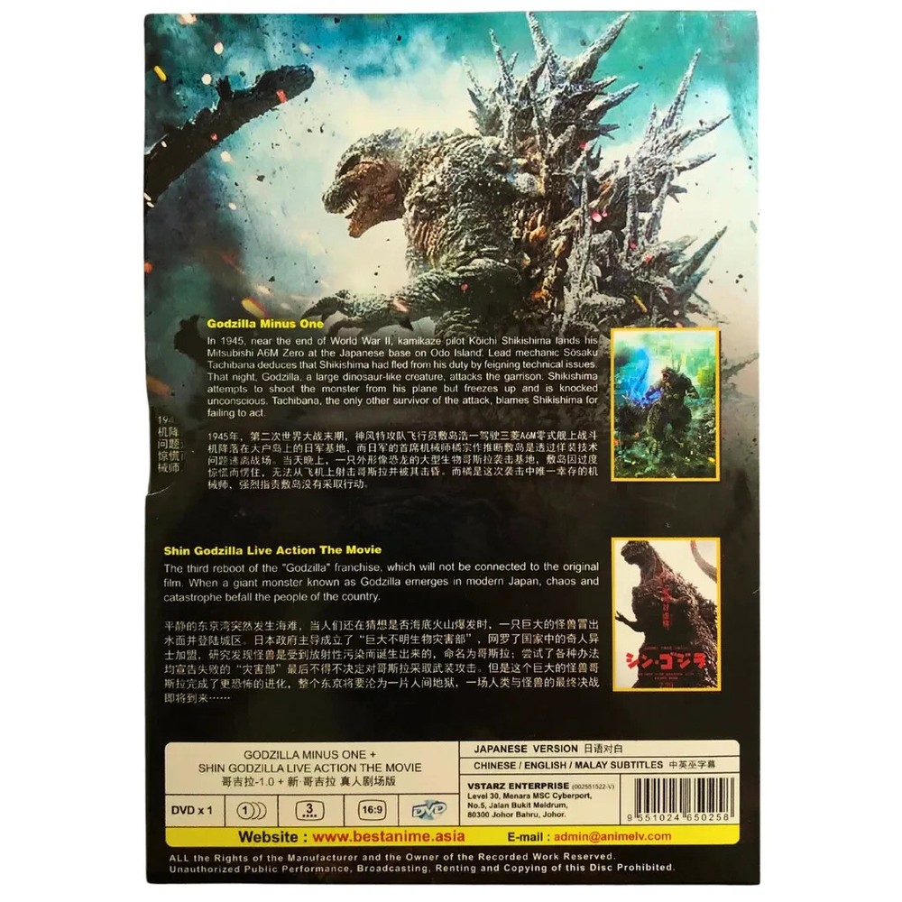 Free eBay listing template designed by dewiso.com DVD Movie Godzill Minus One (2023) + Shin Live Action Movies(2016) English Dubbed All Region Item description from the seller: DVD Movie: GODZILLA SHIN MINUS ONE (2023) + GODZILLA LIVE ACTION THE MOVIES (2016) Product Description: Language : Japanese Subtitles : English / Chinese / Malay Format : All Region Condition : 100% Original & Brand NEW Numbers of episode : Movies Numbers of Discs : 1 Discs Contact us We can be contacted at any time through eBay messages if you have any questions, comments or product requests. We will respond to you within 24 hours and do our best to help you out! We encourage our customers to contact us with any questions or concerns! We'd like to be sure you are completely satisfied with your purchase. Payment Currently we accept payment through eBay manage payment. Shipping We are using different shipping courier USPS Media Mail, DHL Express & other Standard Shipping based on specific product. Handling time is 3-5 working days. Your goods will be shipped with valid tracking number. Returns If you have problem with the order, please contact us via eBay message. We will respond as soon as possible. Every purchased entitled 30 days returns under Return Policy. Buyer pays for return shipping.