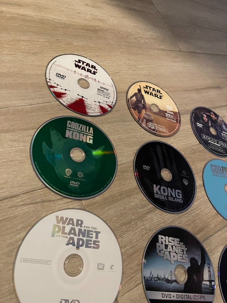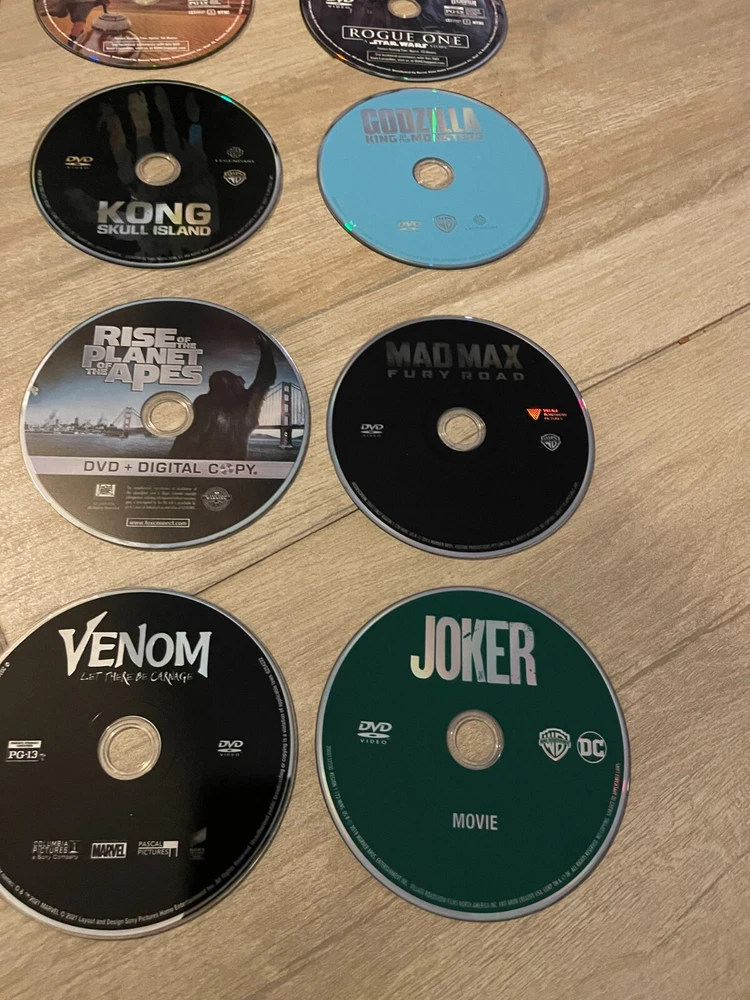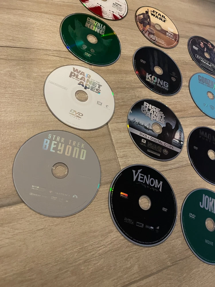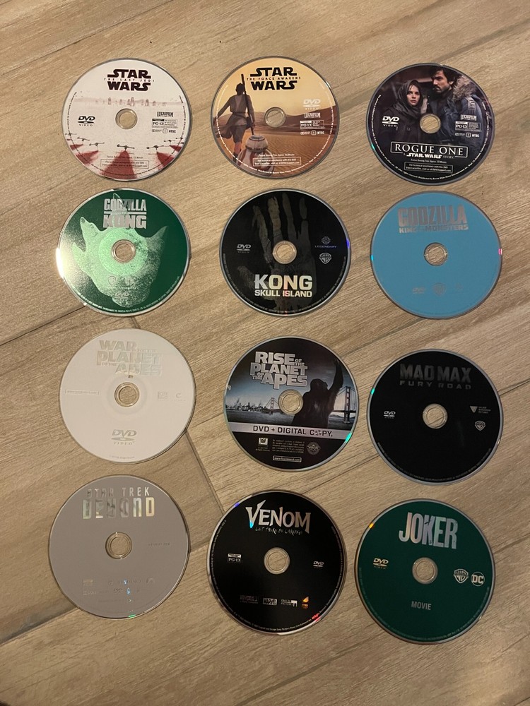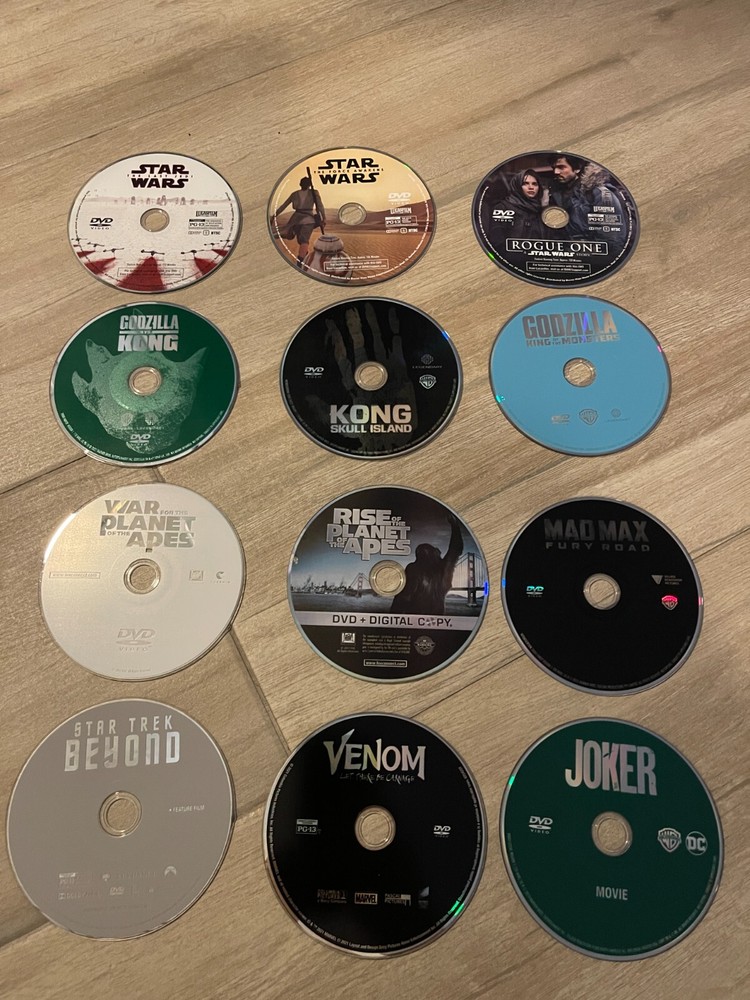 Original store purchased movies, kept in a album. No Cases, DVDS only . All Tested and Working. Any digital copies are expired. -Star Wars The Force Awakens -Star Wars The Last Jedi -Rouge One A Star Wars Story -Godzilla vs. Kong -Kong Shull Island -Godzilla King of the Monsters -War for the Planet of the Apes -Rise of the Planet of the Apes -Mad Max - Fury Road -Star Trek Beyond -Venom -Joker