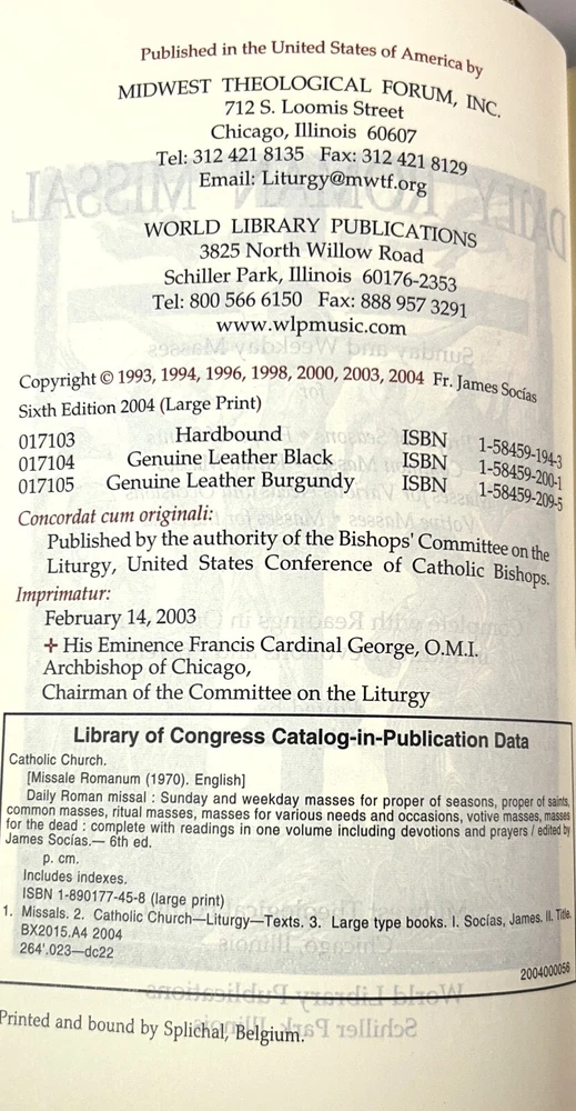 Near fine, full leather, softcover book with all edges gilt (see photos) in near fine box; the book is clean, tight, square, and free of any markings showing little to no evidence of having been previously read; box shows very light shelf wear, including very light scratching/scuffing to the cover (see photos) but remains in near fine condition; published 2004 by Midwest Theological Forum; large print; purchaser signature may be required upon delivery.