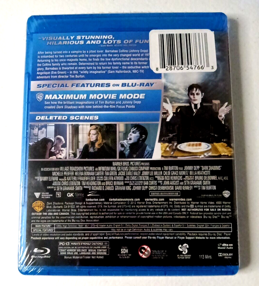 Experience the perfect blend of horror and comedy with this Blu-ray disc of "Dark Shadows" starring the legendary Johnny Depp. This 2012 release is a must-have for movie enthusiasts who love to indulge in the sub-genre of comedy video. The storyline, characters, and cinematography make this Warner Home Video production worth your time and money. Join the mysterious journey of Barnabas Collins, a vampire who returns to his ancestral home in Maine after being buried alive for two centuries. The film is rated PG-13 and is a great addition to your movie collection. Get your hands on this Blu-ray disc now and relive the dark and humorous world of "Dark Shadows." Bonus DVD - Godzilla. See photos and zoom in.