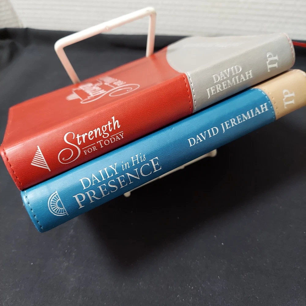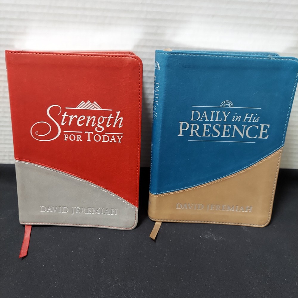 Lot 2 Daily Devotionals by David Jeremiah Strength For Today Daily In His Presence Soft cover Leather Bound Approximately 7.5" x 5.5" Ribbon Marker Silvery Gilt Page Edges Beautiful Books! Like-new Condition Thanks very much for your interest!