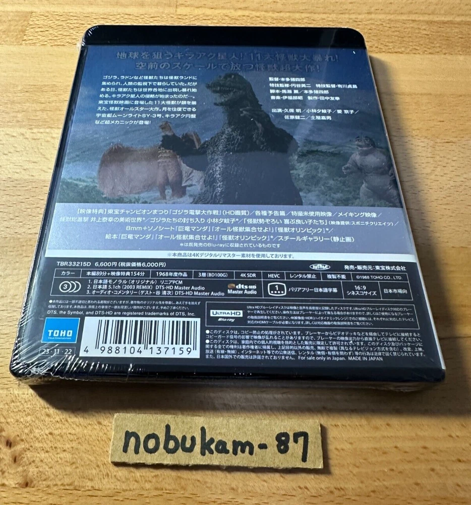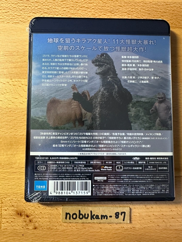 Description Title: Destroy All Monsters (Kaiju So Shingeki) 4K Remastered Format: 4K Ultra HD Blu-ray (Region: free) Number of Discs: 1 Director: Ishiro Honda Writers: Ishiro Honda, Takeshi Kimura Starring: Akira Kubo, Yoshio Tsuchiya, Kyoko Ai, Yukiko Kobayashi, Jun Tazaki, Kenji Sahara Producer: Tomoyuki Tanaka Color: Color Running Time: 94 Minutes Original Release Year:1968 Aspect Ratio(s) Cinemascope Subtitles: Japanese Subtitles for the Hearing Impaired Audio Track: Japanese 5.1ch Surround, Japanese Linear PCM Monaural Kilaak are after the earth! Eleven great monsters go on the rampage! A monster blockbuster on an unprecedented scale! Bonus Video - Champion Festival "Godzilla Dengeki Daisakusen" (HD quality) - Making of 8mm - Trailers - Unused special effects footage - Still Gallery - Godzilla invasion Yukiko Kobayashi * - Destroy All Monsters The Art World of Yasuyuki Inoue * - 8mm + flexi disc “Kyoryu Manda” “Kaiju Olympics” “All Kaijju Shugo Seyo” * - Picture book “Kyoryu Manda” “Kaiju Olympics” “All Kaijju Shugo Seyo” * * is from the previously released Blu-ray Audio Commentary (Guest: Seiji Tani) [STORY] Godzilla, Rodan, and other monsters were gathered in Monster Land and lived under the watchful eye of mankind. One day, however, the monsters appear in various parts of the world and begin to rampage. The invasion of the Kilaak has begun... *Ultra HD Blu-ray player is necessary to play this Ultra HD Blu-ray disc. Please note that it will not play on regular Blu-ray player. For optimal viewing experience of 4K UltraHD content, 4K/HDR TV is recommended, although it is also compatible with 4K TV and HV TV. [About 4K UltraHD] 4K UHD boasts high resolution of 3840 pixels x 2160 lines (8.3 megapixels, aspect ratio 16:9), which is twice the horizontal and vertical resolution compared to the 1080p HDTV format, with four times as many pixels overall. Shipping We ship using FedEx, DHL and Japan Post. Terms of Sale Your order will be shipped within 1~10 business days (excluding Saturday, Sunday & Japan's Holiday) after the payment is confirmed. International Buyers - Please Note: Import duties, taxes,VAT and charges are not included in the item price or shipping cost. These charges are the buyer's responsibility. Please check with your country's customs office to determine what these additional costs will be prior to bidding or buying.