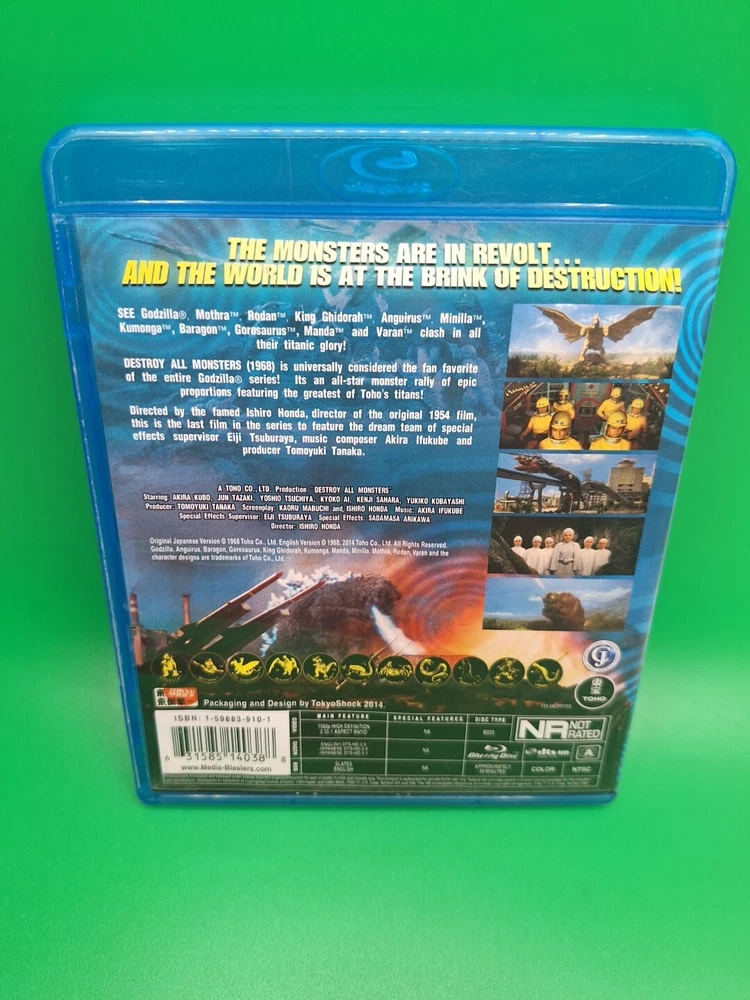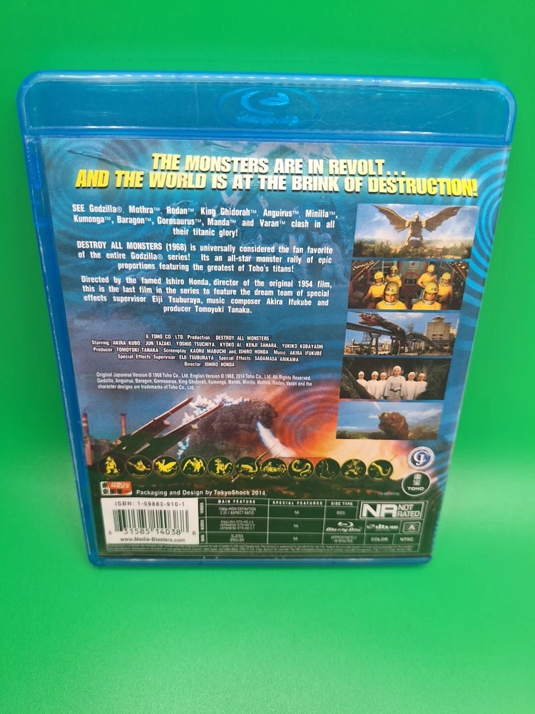 Great condition. See pics for details. Please message with any questions. This Blu-ray Disc features the 2014 movie "Destroy All Monsters" directed by Ishiro Honda and Inoshiro Honda. The film stars Yukiko Kobayashi, Akira Kubo, Kyoko Ai, and Jun Tazaki and is a must-watch for fans of Japanese cinema. The disc is in the standard edition format and is rated NR. The movie is a foreign language genre and was released in 2014 by Media Blasters. The disc is compatible with Blu-ray players and is categorized under "Movies & TV" and "DVDs & Blu-ray Discs." Get ready to embark on a thrilling adventure with Godzilla and his son in this Japanese cl