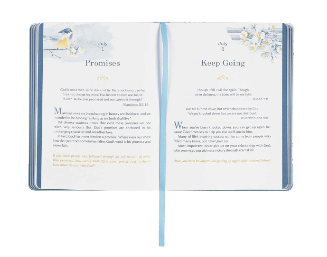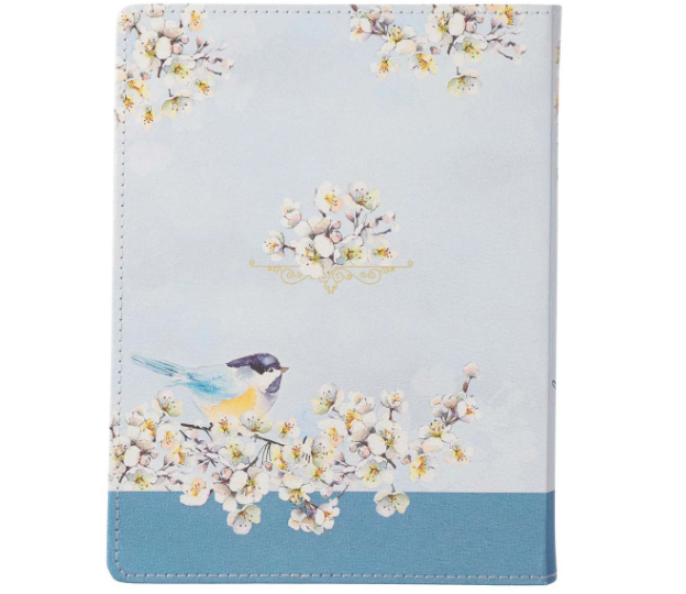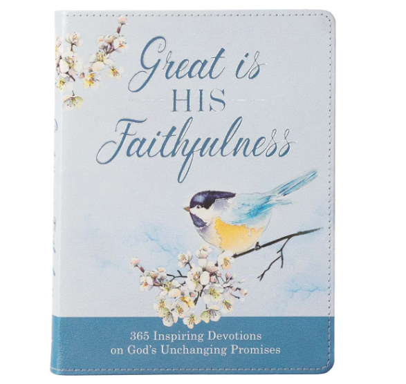 Great Is His Faithfulness Daily Devotional cover is decorated with a pretty Bluebird perched on a branch in full bloom. The branches display blossoms wrapped around the spine spilled onto the back cover displaying another little Bluebird. The title appears on the front cover foiled in blue with silver foil outlining the letters in the title accenting the white blossoms. The title of the Great Is His Faithfulness Daily Devotional appears on the spine of the book displaying cream-colored topstitching around the edges with rounded corners to add durability to the cover. The silver gilt-edged pages add a soft sheen to the design with a soft blue satin ribbon marker included to mark your page and match the overall blue theme of the devotional perfectly. The end pages in the back and the front of the devotional repeat the white blossom motif in an elegant array and the front set of end pages feature a small framed section to write your name or give as a gift to a loved one or friend. Great Is His Faithfulness Daily Devotional content is organized by month, as indicated by the sidebars on each page that are colored in different shades of blue. Each of the 365 entries focus on God's promise in Scripture. The full-color pages are decorated in blues, golden accents and feature the same Bluebird and blossom design as the cover. The text is printed in an easy to read blue accented in gold. Be inspired by the promises of God. Each daily entry offers a promise from Scripture, followed by a short devotional ending with a question to help you make this promise a part of your life. A Topical Index, arranged by topic and date placed in the back of the devotional make it easy to look up a specific entry. Great Is His Faithfulness Devotional is a meaningful and encouraging gift to give as a Christmas gift or purchase several copies to gift them as a Secret Santa gift to friends, co-workers or stuff them in stockings for all the women in your family. ♥ Title: Great Is His Faithfulness Daily Devotional For Women ♥ Pearlized Cover Design With Birds And Flowers ♥ Faux Leather ♥ Blue Foil Title With Silver Foiled Accents ♥ Full-Color Print ♥ Two Color Interior ♥ Flexcover ♥ Blue Ribbon Marker ♥ Page(s): 388 Gilt Edged Pages ♥ Devotional Reading(s): 365 ♥ Height and Width: 7.8" x 6.1" x 0.9” ADDITIONAL INFORMATION *********************************** PROCESSING & SHIPPING ♥ ALL items are “MADE TO ORDER” ♥ FULFILLMENT TIME 2 to 7 BUSINESS days ♥ STANDARD SHIP TIMES (if NO delays) 3-5 BUSINESS days AFTER fulfillment ♥ If devotionals are needed by a specific date please notify us BEFORE placing your order to ensure you will receive the item in a timely manner RETURN(S) / EXCHANGE(S) ♥ Returns, Exchanges and Cancellations are NOT ACCEPTED ♥ Contact us with ALL questions BEFORE purchasing ♥ We will NOT Refund/Replace items marked as delivered (if package has been marked as delivered but you have not received it, check with your local post office)