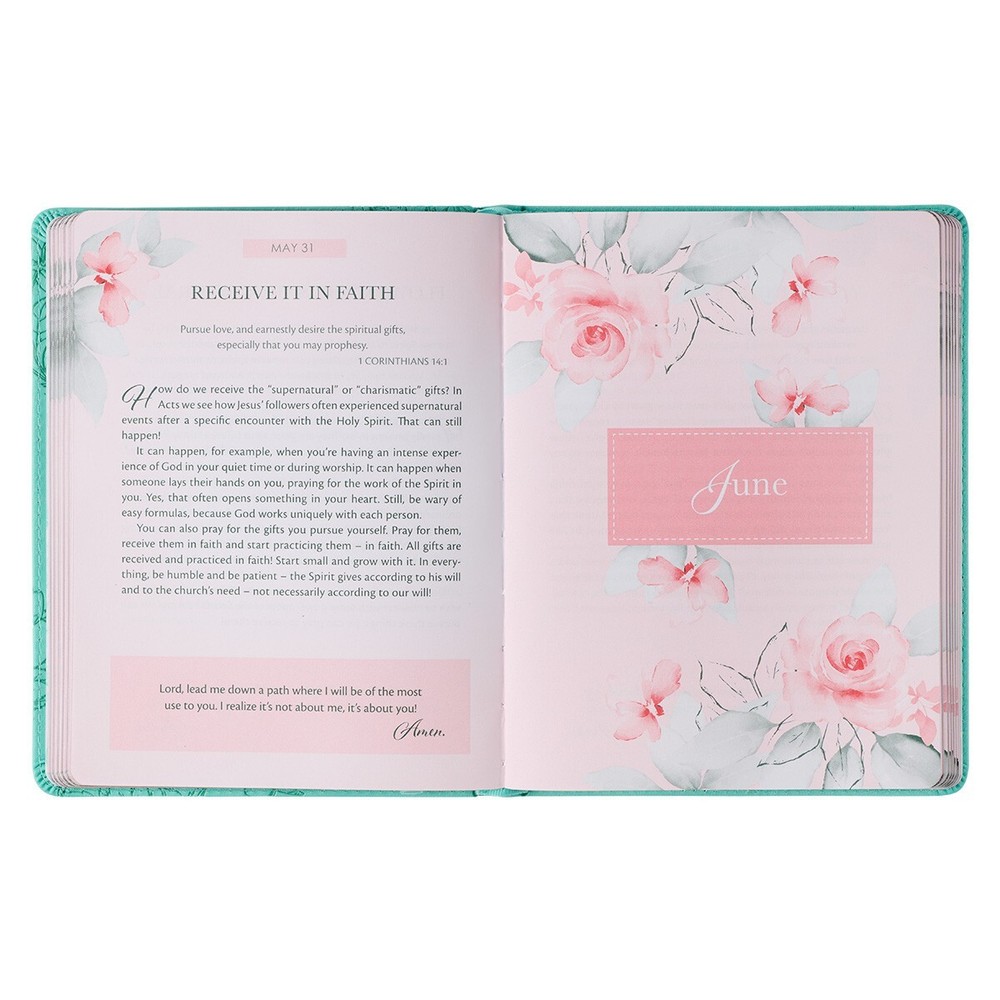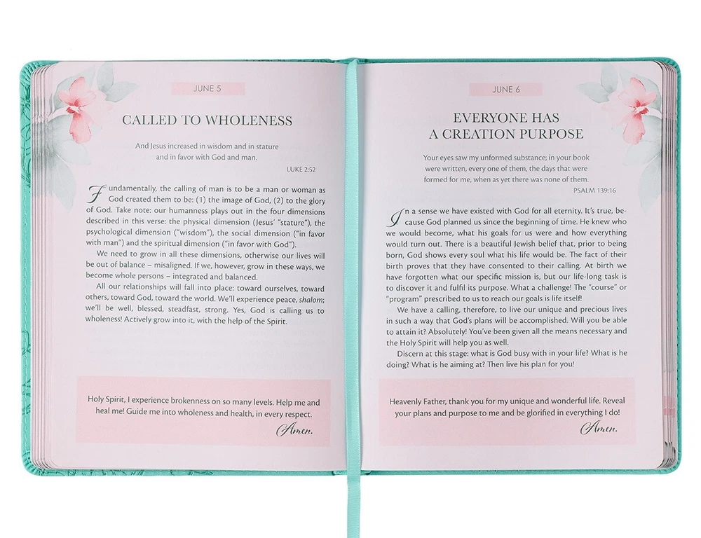The Here I Am, LORD Teal Faux Leather Devotional displays a teal faux leather cover of the devotional is heat debossed with large rose designs placed in opposing corners. A few rosebuds peek out from behind the double-framed label that holds the heat debossed and silver foiled title. Here I Am, LORD subtitle sets the theme for the devotional and is placed directly below the title. The two-color interior pages are decorated with peach colored floral designs in the top corners and gilt-edged in silver. Each daily reading includes the day, title, Scripture verse and short devotional passage. The day's reading concludes with a prayer that is highlighted by a peach colored box. A teal ribbon marker is attached to the spine and will let you mark your page. The Here I Am, LORD Teal Faux Leather Devotional serves as a meaningful Mother's Day Gift, Christmas Gift or Birthday Gift, particularly for a friend who is new to the faith, providing her with valuable support and guidance along their spiritual journey. ♥ Title: Here I Am, LORD Teal Faux Leather Devotional ♥ Teal Cover Design with ♥ Heat-Debossed Roses ♥ Heat-Debossed And Silver Foiled Title ♥ Gold Foiled Title Accent ♥ Flex-Cover ♥ Two-Color Interior Pages ♥ Teal Ribbon Marker ♥ Presentation Page For Gift Giving ♥ Gilt Edged Page(s): 388 ♥ Devotional Reading(s): 365 ♥ Height and Width: 7.8” x 6.1” x 0.9” (198 x 155 x 23 mm) ADDITIONAL INFORMATION *********************************** PROCESSING & SHIPPING ♥ ALL items are “MADE TO ORDER” ♥ FULFILLMENT TIME 2 to 7 BUSINESS days ♥ STANDARD SHIP TIMES (if NO delays) 3-5 BUSINESS days AFTER fulfillment ♥ If devotionals are needed by a specific date please notify us BEFORE placing your order to ensure you will receive the item in a timely manner RETURN(S) / EXCHANGE(S) ♥ Returns, Exchanges and Cancellations are NOT ACCEPTED ♥ Contact us with ALL questions BEFORE purchasing ♥ We will NOT Refund/Replace items marked as delivered (if package has