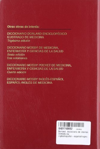 Diccionario de inglés/español - español/inglés, de la familia Dorland, realizado a partir de la 30.ª edición del "Diccionario Dorland Enciclopédico Ilustrado de Medicina", que durante más de 100 años ha sido y es la referencia más importante en el campo de la terminología médica. Con más de 100.000 entradas que recogen todos los términos fundamentales de Medicina y Ciencias de la Salud que estudiantes y profesionales de estas áreas necesitan conocer si quieren leer en inglés o preparar algún trabajo en este idioma. También es una herramienta fundamental para traductores profesionales especializados en estas disciplinas al tratarse, probablemente, del diccionario de idiomas más completo disponible. Para facilitar la tarea, existe una correspondencia exacta, conceptual y gramatical, entre los términos de cada uno de los dos idiomas. Realizado a partir de la 30.ª edición del "Diccionario Dorland En… condition info: Has a sturdy binding with some shelf wear. May have light markings on pages.