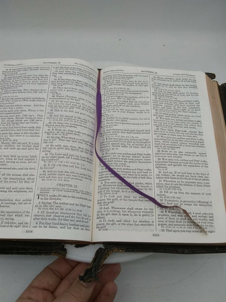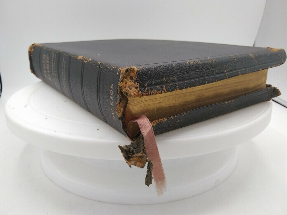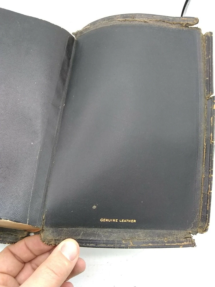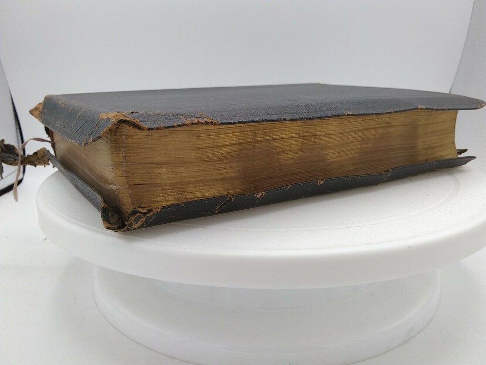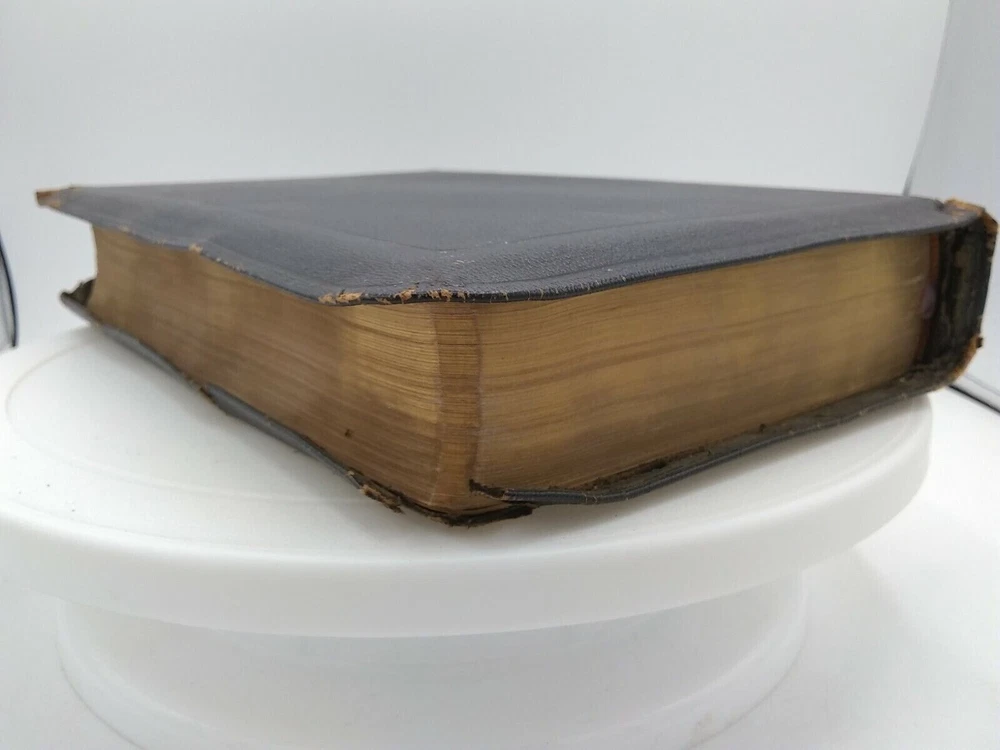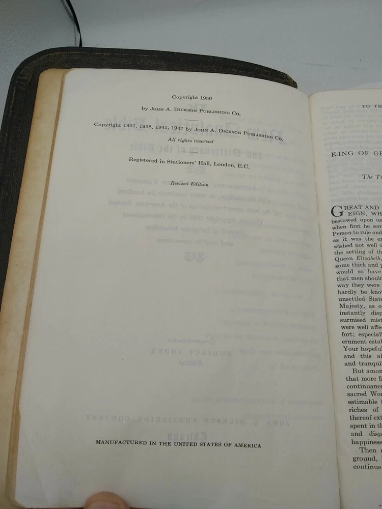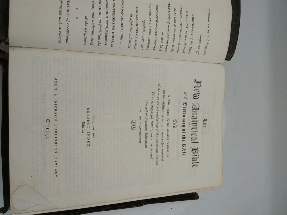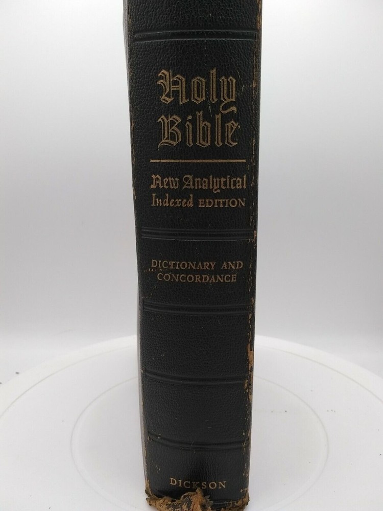 1950 Genuine Morocco Leather edition of the Dickson NEW ANALYTICAL INDEXED BIBLE KJV The New Analytical Bible Indexed Edition (Authorized King James Version) Author/Printing Date: this is the 1950 revision tracing back to the First 1931 Edition by John A. Dickson Format: Black Morocco (goatskin) leather wraps, The page edges are an attractive gold gilt. Leather lined. The page is set in two columns, black letter edition. Contents: Unusual Helps and Features comprised of: A Dictionary of the Bible, Introduction to each book, A Chart Outline of each book, Analysis of the entire Bible, Treatment of outstanding facts of each book, Contemporaneous History, A Harmony of the Gospels specially arranged, The Teachings of Jesus in alphabetical order, Concordance, Maps, and a Comprehensive Index to important Subjects, Persons, Places, and Things to facilitate the study and understanding of the scriptures This Bible uses is the Authorized King James Version, “with the addition, in many instances, {in brackets} of the more correct renderings of the American Revised Version, copyright 1929 by the International Council of Religious Education and used by permission.” It is black letter (no red lettering) “Orders placed before 11AM will be shipped the same business day. Orders placed after 11AM will be shipped the next business day. Orders are shipped daily Monday through Friday"