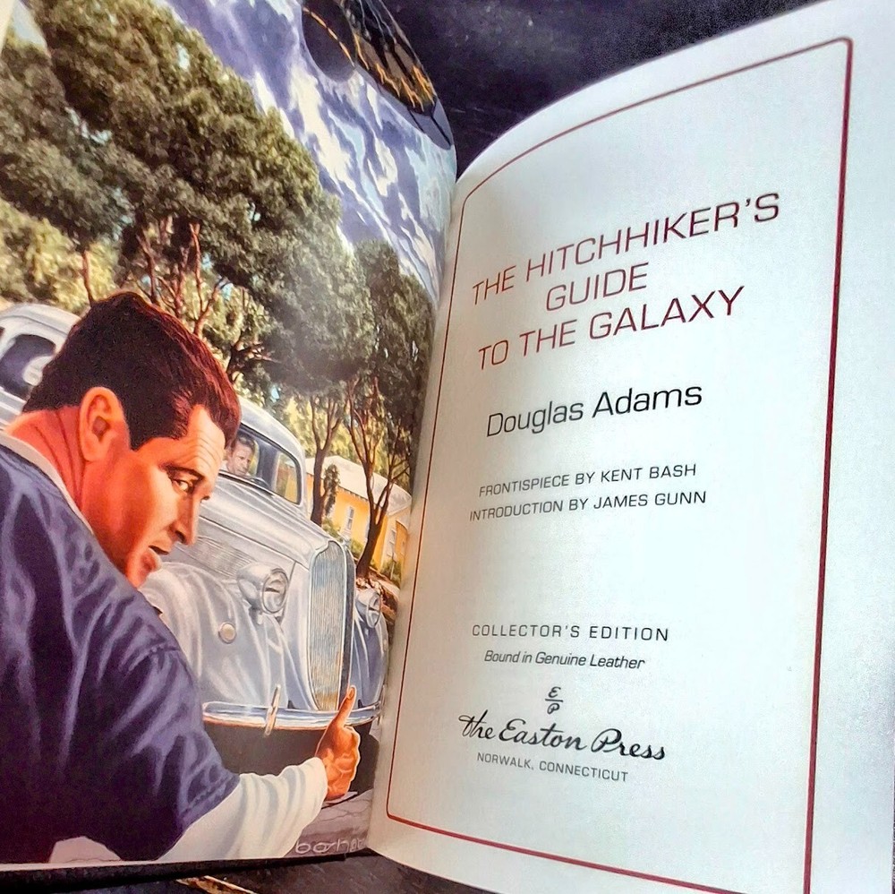 HITCHHIKER'S GUIDE TO THE GALAXY is part of Easton Press's Masterpieces of Science Fiction Collection. Features include: Fully bound in genuine leather. A separate Collector's Notes letter. A blank, unattached book plate ready for you to personalize. A specially commissioned full-color frontispiece. 22kt gold deeply inlaid on the "hubbed" spine. Superbly printed on acid-neutral paper that lasts for generations. Sewn pages, not just glued like ordinary books. Satin-ribbon page marker. Gilded page ends. THE STORY The Hitchhiker's Guide to the Galaxy is the first book in the Hitchhiker's Guide to the Galaxy comedy science fiction "trilogy of five books" by Douglas Adams, with a sixth book written by Eoin Colfer. The novel is an adaptation of the first four parts of Adams's radio series of the same name, centering on the adventures of the only man to survive the destruction of Earth; while roaming outer space, he comes to learn the truth behind Earth's existence. [Wikipedia] THE AUTHOR Douglas Noel Adams (11 March 1952 – 11 May 2001) was an English author, humourist, and screenwriter, best known as the creator of The Hitchhiker's Guide to the Galaxy (HHGTTG). Originally a 1978 BBC radio comedy, The Hitchhiker's Guide to the Galaxy developed into a "trilogy" of five books which sold more than 15 million copies in his lifetime. It was further developed into a television series, several stage plays, comics, a video game, and a 2005 feature film. [Wikipedia]