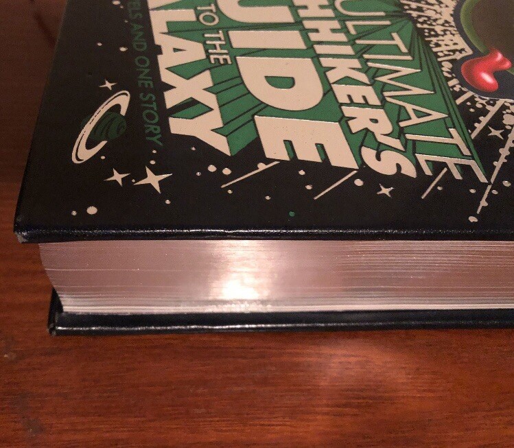 This is an original Douglas Adams The Ultimate Hitchhikers Guide to the Galaxy from Barnes & Noble’s Collectible Classics Omnibus Edition. It features silver leaf on the pages, and is in great condition.