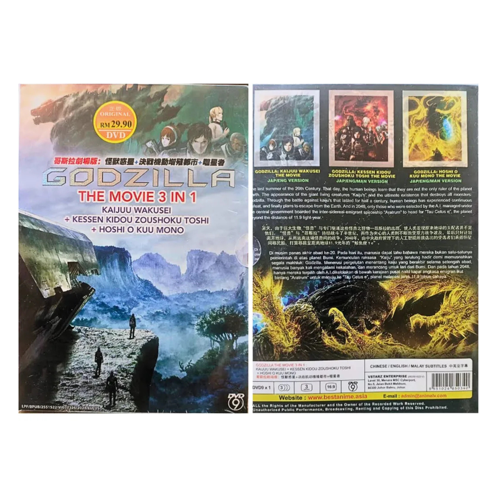 Title: DVD Godzilla The Movie 3in1 Kaijuu Wakusei+Kessen Kidou+Hoshi O Kuu Mono Weight: 163g SKU: SKCT 17012503 ✨ Description: Experience the epic sci-fi anime trilogy in this complete DVD set featuring Godzilla: Planet of the Monsters, City on the Edge of Battle, and The Planet Eater. Follow humanity’s desperate battle to reclaim Earth from a monstrous Godzilla after 20,000 years. With stunning CGI animation, intense battles, and philosophical themes, this 3-in-1 set is a must-have for Godzilla and anime fans alike. Japanese audio with English subtitles. Approx. 279 minutes total runtime. 🛒 Product Overview: Title: DVD: Godzilla The Movie 3-in-1 Collection Movie: Godzilla : Planet of the Monsters (2017) Godzilla : City on the Edge of Battle (2018) Godzilla : The Planet Eater (2018) 📆 Release Dates: Godzilla: Planet of the Monsters: November 17, 2017 (Japan) Godzilla: City on the Edge of Battle: May 18, 2018 (Japan) Godzilla: The Planet Eater: November 9, 2018 (Japan) 📀 Format: DVD 🔢 Episodes: 3 Movie 📦 Region Code: All Region 🗣️ Audio Language: Japanese / English 📜 Subtitles: English / Chinese / Malay Number of Discs: 1 ⏱️ Runtime: Approximately 279 minutes (~93 minutes per episode) Genre : Science Fiction, Action, Animation, Kaiju (Giant Monster), Adventure Aspect Ratio: 16:9 Condition: Brand NEW 🔞 Movie Rating: PG-13 / TV-14 (Strong language, violence, and mature themes) 🎬 Production Details 🎬 Director: Kōbun Shizuno, Hiroyuki Seshita ✒️ Screenplay: Gen Urobuchi, Sadayuki Murai, Tetsuya Yamada 🧑💼 Producers: Takashi Yoshizawa 🎼 Music Composer: Takayuki Hattori 🎥 Studio: Polygon Pictures, Toho Animation 👥🎙️ Main Voice Cast Haruo Sakaki: Mamoru Miyano (Japanese), Chris Niosi (English) Metphies: Takahiro Sakurai (Japanese), Lucien Dodge (English) Yuko Tani: Kana Hanazawa (Japanese), Cristina Vee (English) Martin Lazzari: Tomokazu Sugita (Japanese), Edward Bosco (English) Adam Bindewald: Yuki Kaji (Japanese), Robbie Daymond (English) 🎥 Synopsis The trilogy presents a futuristic reimagining of the Godzilla franchise. Set in a world where humanity has been driven from Earth by Godzilla and other kaiju, the remnants of human civilization, along with alien allies, seek to reclaim their home planet. Over the course of the three films, they confront not only the monstrous Godzilla but also the existential challenges of survival, identity, and the consequences of technological advancement. 🎬 Plot Summary 1. Godzilla: Planet of the Monsters In the late 20th century, giant monsters, including Godzilla, appear and wreak havoc on Earth. After decades of defeat, humanity, along with alien races Exif and Bilusaludo, evacuate Earth. Twenty years later (due to time dilation, 20,000 years have passed on Earth), they return to find a planet dominated by Godzilla. A young man named Haruo Sakaki leads a mission to defeat the monster and reclaim Earth. 2. Godzilla: City on the Edge of Battle Following the initial confrontation, Haruo and his team discover the remnants of Mechagodzilla, a weapon developed before Earth's evacuation. The Bilusaludo propose using its advanced nanometal technology to combat Godzilla. As the plan unfolds, ethical dilemmas arise regarding the loss of humanity in the face of technological assimilation. 3. Godzilla: The Planet Eater The final installment introduces the Exif's deity, Ghidorah, a transdimensional entity summoned to defeat Godzilla. As Ghidorah's influence spreads, Haruo confronts the Exif's true intentions and faces a choice between continued reliance on destructive technology or forging a new path for humanity. 🎭 Key Themes: Survival and Identity: Explores humanity's struggle to maintain its essence in the face of overwhelming odds and technological integration. Technological Ethics: Questions the morality of using advanced technology that may compromise human values. Faith and Manipulation: Examines how belief systems can be used to control populations, as seen with the Exif's worship of Ghidorah. Environmental Consequences: Reflects on humanity's impact on Earth and the resulting retaliation by nature, embodied by Godzilla. 🎨 Visual Tone & Style: Animation: Utilizes 3D computer-generated imagery (CGI) to create detailed environments and dynamic action sequences. Art Direction: Features a dark, dystopian aesthetic with a focus on desolate landscapes and futuristic technology. Character Design: Combines traditional anime styles with realistic textures, providing a unique visual experience. Soundtrack: Composed by Takayuki Hattori, the music blends orchestral arrangements with electronic elements to enhance the sci-fi atmosphere. Return Policy Returns are accepted within 30 days. I tem is unopened and in original condition. Please include proof of purchase. Refunds go to the original payment method. Important Notes: Import duties, taxes and additional charges (if applicable) are the buyer’s responsibilities. These charges are non-refundable. Feedback: Your satisfaction is our priority! If you love your purchase, we’d truly appreciate your positive feedback. Should you encounter any issues, please contact us directly – we are here to help and will assist you promptly. 😊