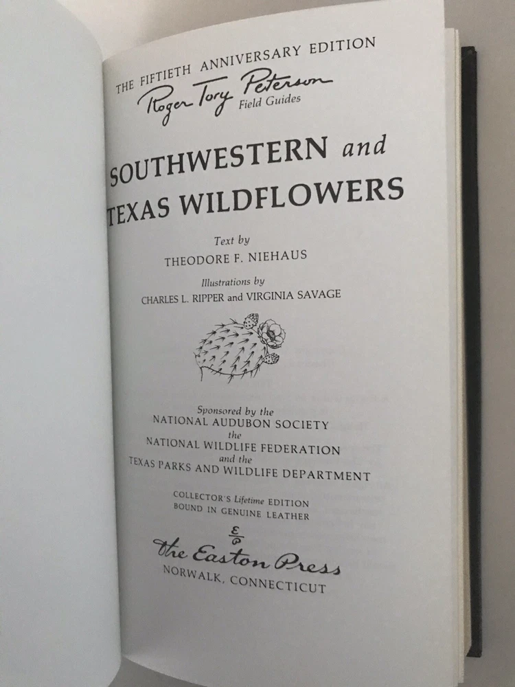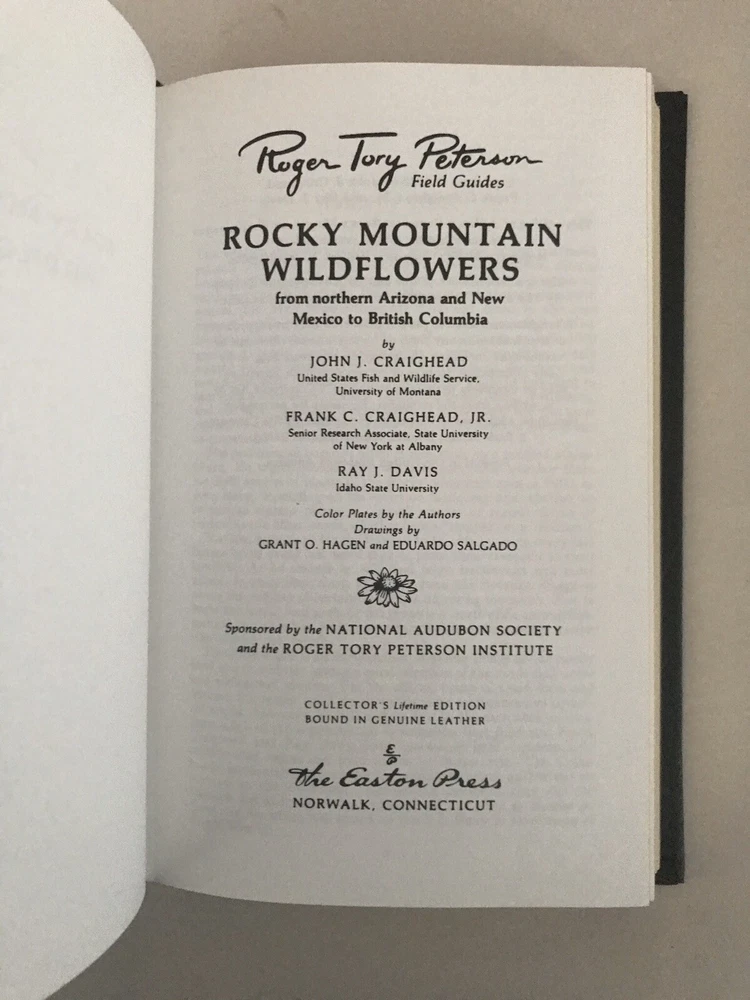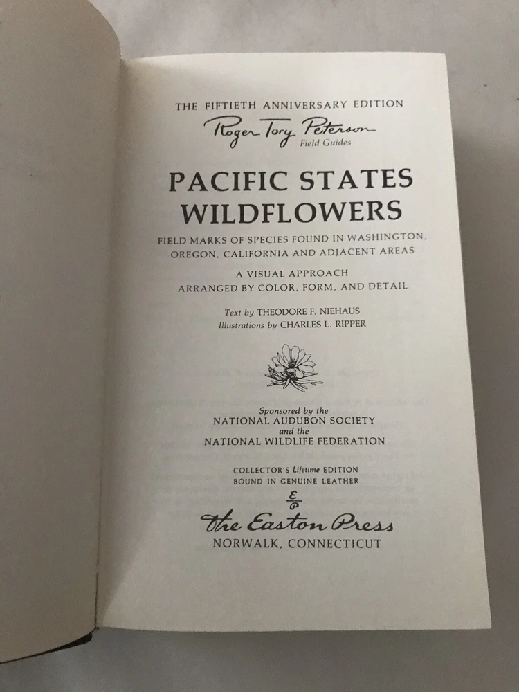 Four EASTON PRESS Roger Tory Peterson Field Guides Pacific States Wildflowers Northeastern Wildflowers Southwestern Wildflowers Rocky Mountain Wildflowers Easton Press books are bound in premium, hand-selected leather and have decorative accents stamped of 22kt. gold. They also feature hubbed spines, archival paper, and satin ribbon page markers. Books are in near fine condition (faint edgewear, faint wear to gilt on page edges--including a scratch to gilt on top page edges of NORTHEASTERN WILDFLOWERS, no writing inside, no highlighting, no attached bookplates, and no embossed seals). Three of the books include unattached unused bookplates issued by the Easton Press laid in (PACIFIC STATES WILDFLOWERS is missing its bookplate).