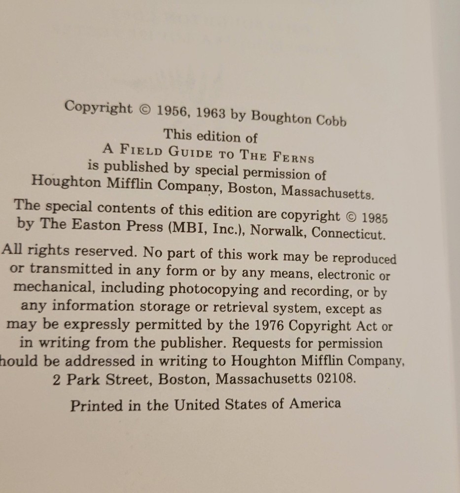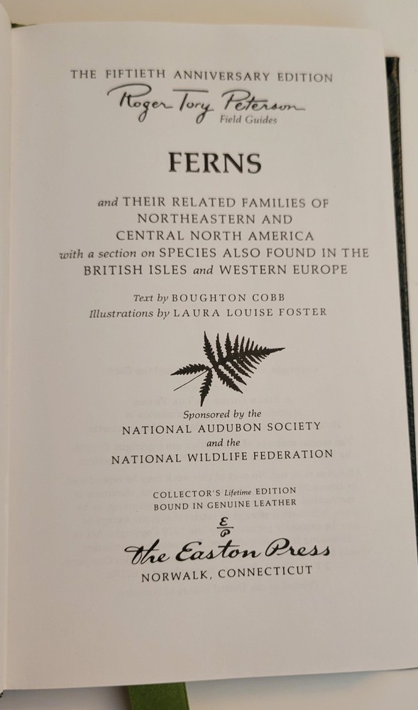 This book is in Like New Condition. It seems to have been purchased as a gift in 2015, but obviously rarely handled. Please see all pictures which are part of the description of this item. The Easton Press Roger Tory Peterson 50th Anniversary Edition Book "Ferns Field Guide" is a rare collectible item with a beautiful genuine leather binding. Published in 1985 by Easton Press, this limited edition book features illustrations by the renowned author Roger Tory Peterson. Focused on the topic of ferns, this field guide is perfect for outdoor enthusiasts and nature lovers interested in identifying and learning more about different species of ferns. Written in English, this special edition book celebrates the legacy of a beloved author in the field of natural history and botanical literature.