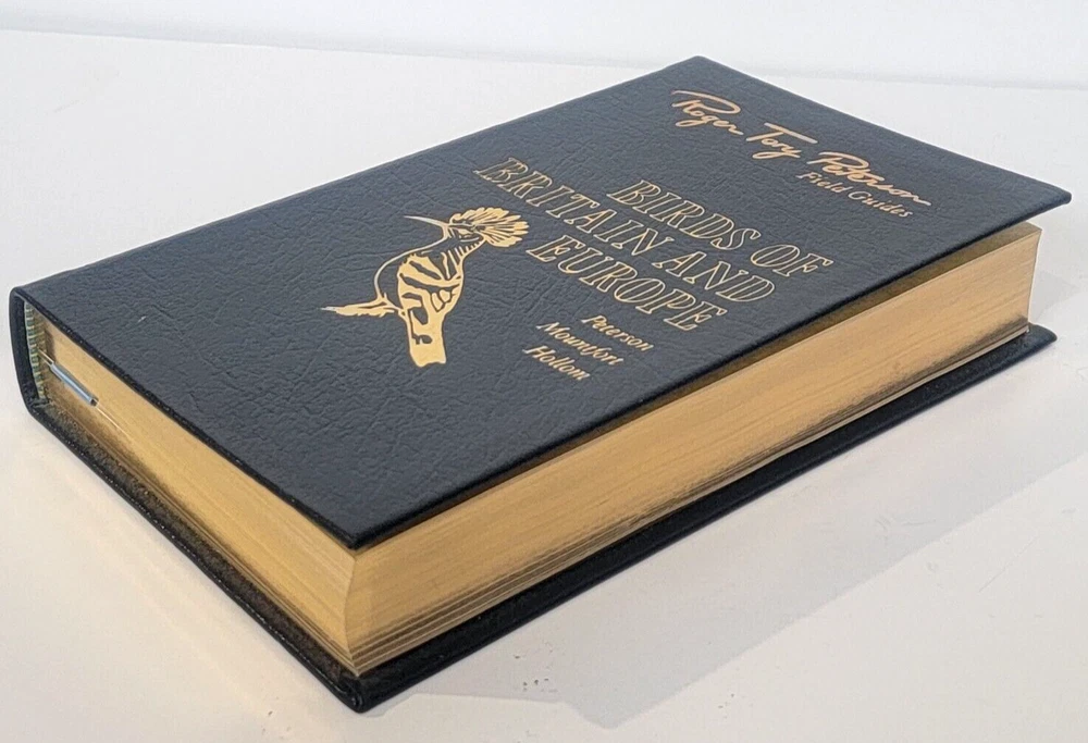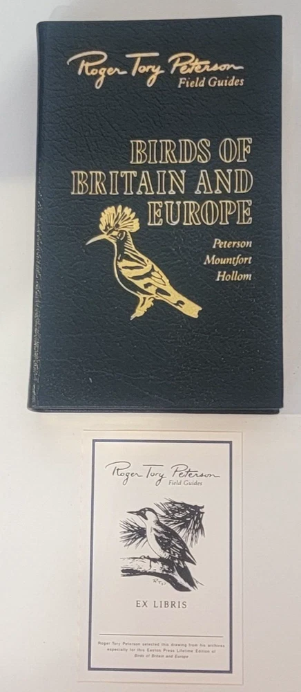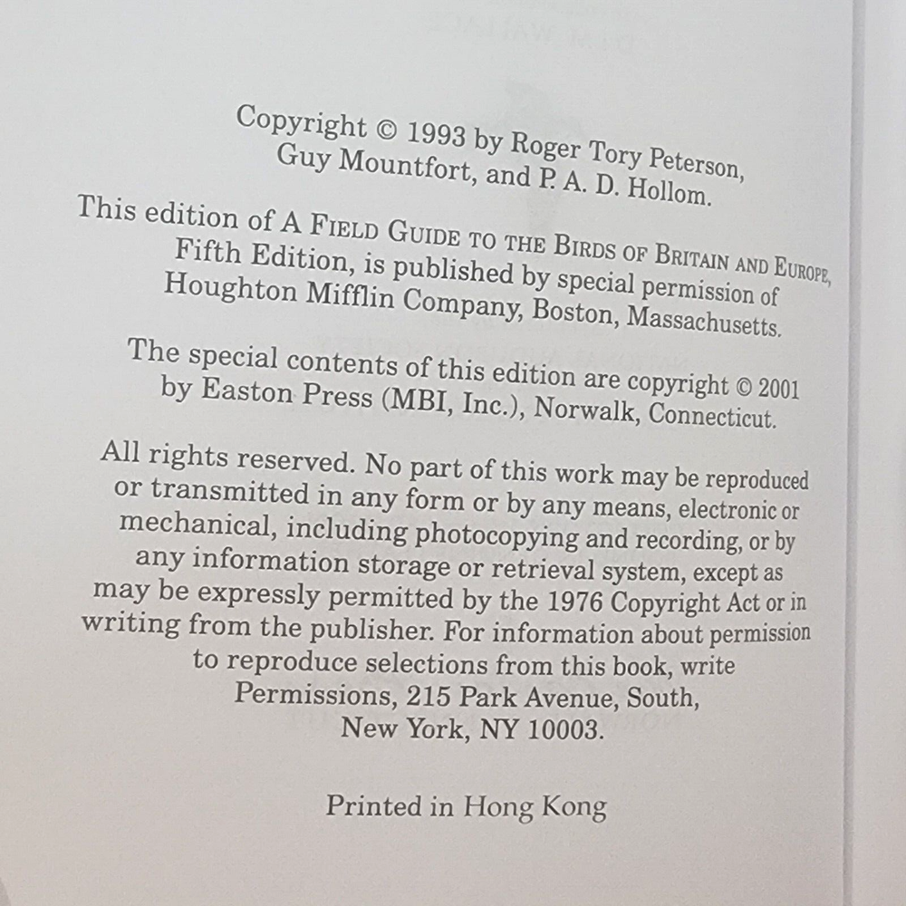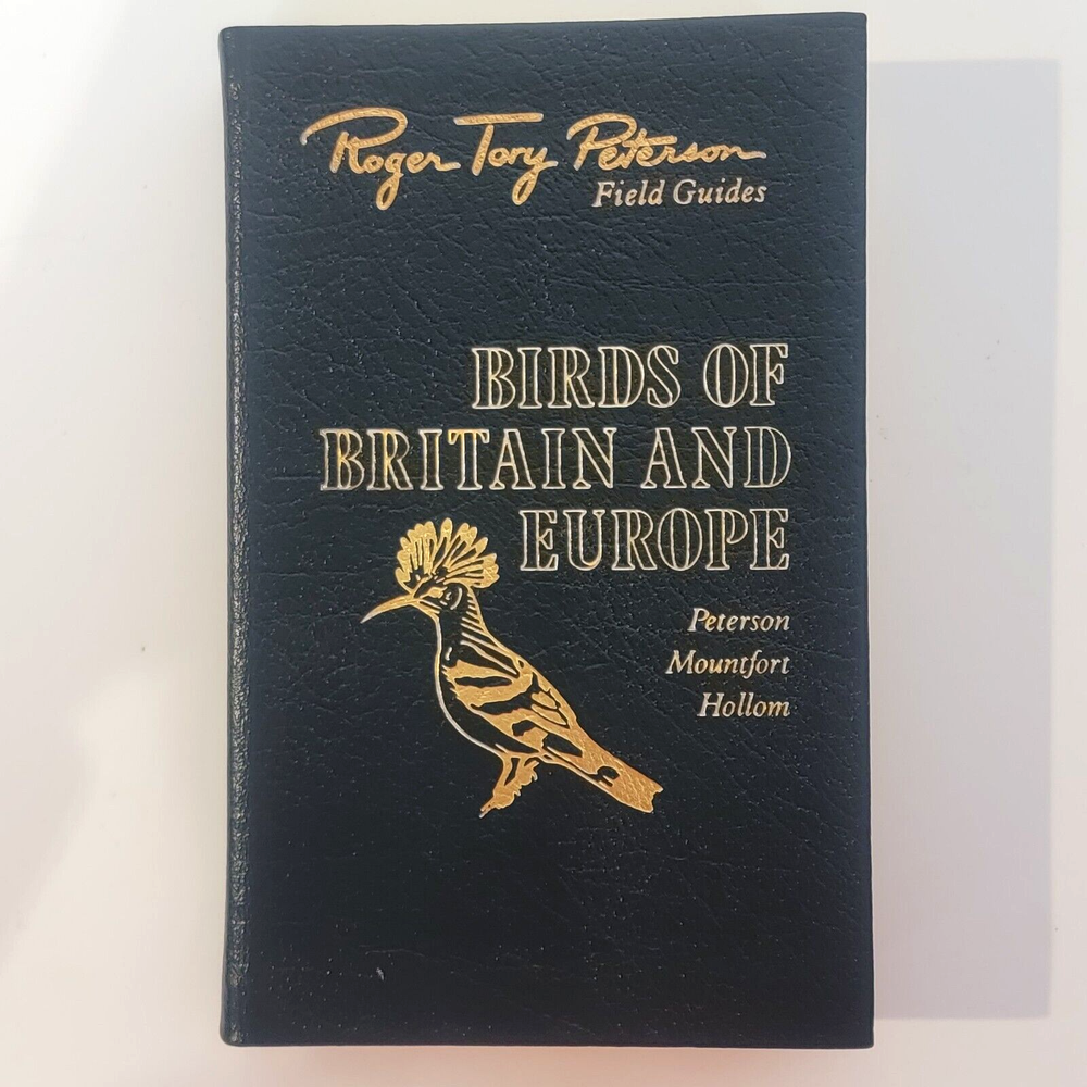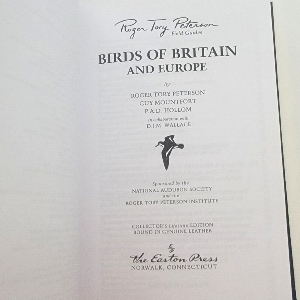 Birds of Britain and Europe by Roger Tory Peterson, Guy Mountfort & P.A.D. Hollom EASTON PRESS Collector's Lifetime Edition bound genuine leather Sponsored by the National Audubon Society and the Roger Tory Peterson Institute Blank/loose nameplate Easton Press, 1993. Minor shelf wear and rubbing. Beautifully decorated boards with gold gilt and satin ribbon. A solid, collectible copy.