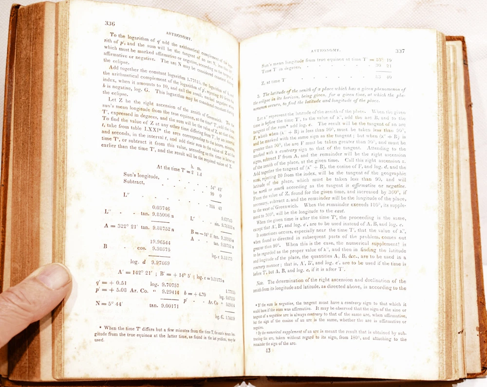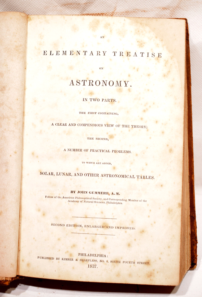 Rare early Philadelphia imprint on astronomy with an important autograph and also an association copy with a prominent American astronomer. Book in fair condition overall. by John Gummere, p: Kimber & Sharpless 1837 373 pp., + 104 pp. astronomical tables, +7 fold out plates. This being a presentation copy with an 1841 handwriiten inscription signed by Rev. Jeremiah Day (1173-1867) 9th President of Yale University in office 1817-1846 to Joseph Stillman Hubbard (1823-1863) astronomer . Covers rubbed and worn with front fold separating, foxed mostly front and rear sections including plates, with some scattered foxing throughout, toning to eps and facing pages. A very desirable autograph. PLEASE CHECK MY FEEDBACK AND BUY WITH CONFIDENCE. The photos are considered to be part of the description. Please view them carefully. Please write with any questions before buying or bidding. SHIPPING: Purchasers of multiple items please wait for my combined invoice before paying in order to allow for full insurance and combined shipping reduction. Failure to comply may result in items being sent separately & without combined shipping. No handling fees added. RETURNS: We strive to provide quality images, detailed informative descriptions and take special care to note or show any imperfections and damage. Returns will be accepted only in the event that an item has been misrepresented. FEEDBACK: We always leave positive feedback upon completion of a satisfactory and hope you will do the same.