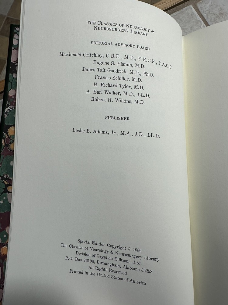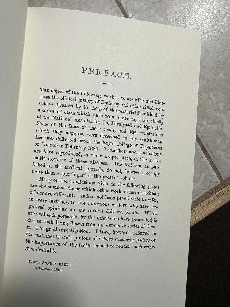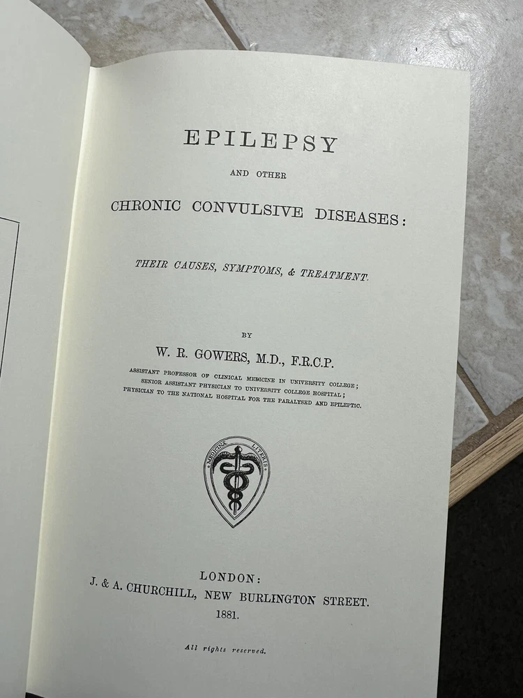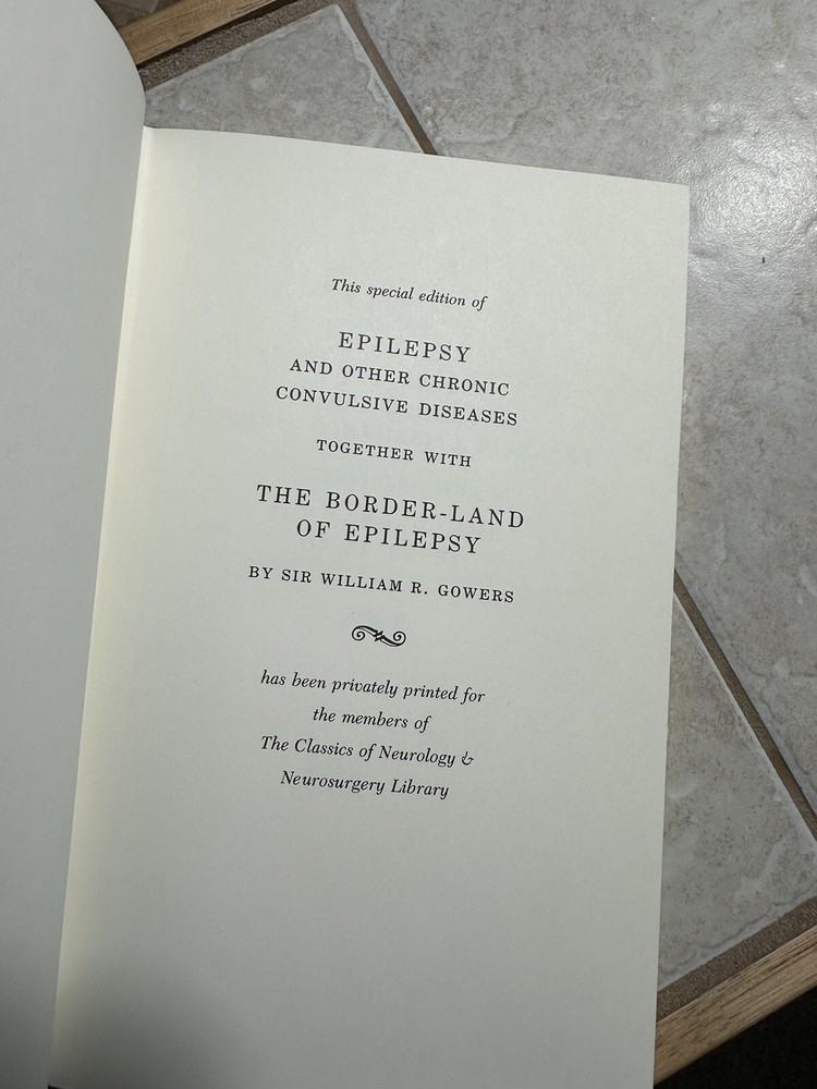 The beautiful, leather-bound, limited edition (#908/1000) textbook by Sir William R. Gowers is divided into two sections: Epilepsy and Other Convulsive Diseases, & The Border-Land of Epilepsy. It has a total of 427 pp. plus indexes, with gold sprayed page edges. It is appx. 9”x6”x2”, complete ith author’s info. insert. A great addition to any medical book collection, and has that wonderful leather smell! Please see pictures. From a non-smoking home.