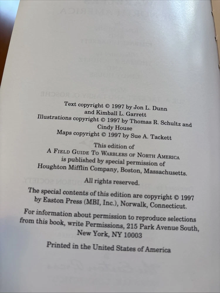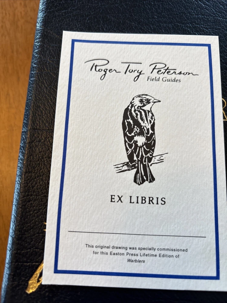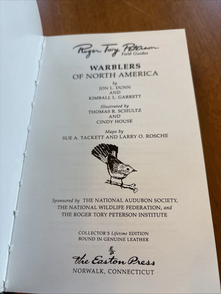 This is an Easton Press Roger Tory Peterson book Warblers from the Field Guides series. This is the Collector's Lifetime Edition. The book has a genuine leather cover and edge gilding. The leather is dark blue and binding is very good like it’s never been opened much. Beautiful book!