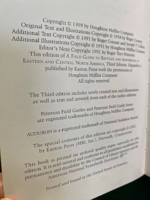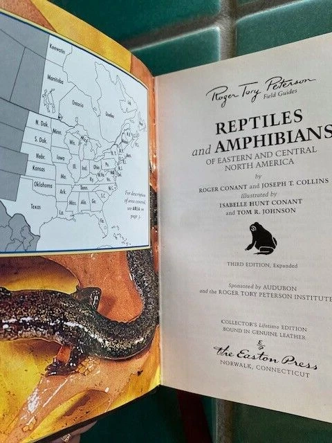 This is ROGER TORY PETERSON FIELD GUIDES: EASTERN REPTILES AND AMPHIBIANS by Conant and Collins, published by Easton Press! Collector's Edition leather hardcover with gilt edge/ribbon, PO's label on inside cover, some spotting to gilt. Ships securely.