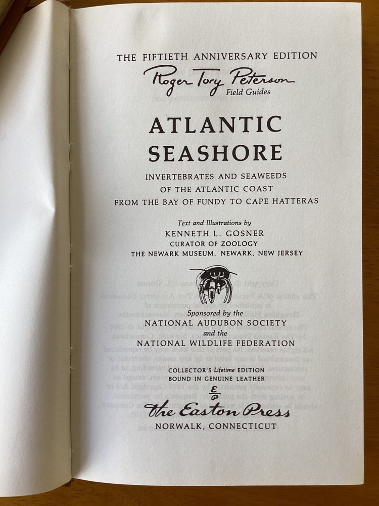 This vintage Easton Press book from 1985 is the Roger Tory Peterson Field Guide - Atlantic Seashore: Invertebrates and Seaweeds by Gosner. Leather bound with gold tinged pages. Collectors Edition. Please see photos. I have many other Easton Press listings, including many other field guides, if you are interested. Please message me for a list.