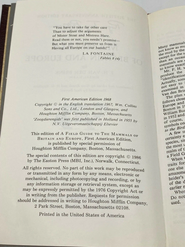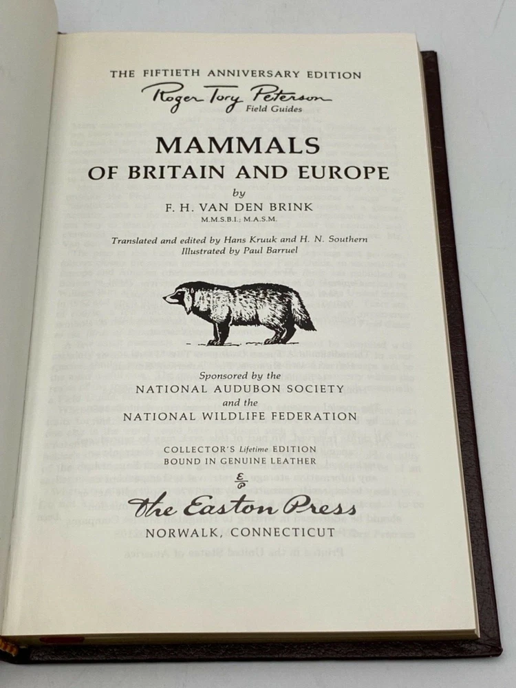 MAKES THE PERFECT GIFT FOR FAN OF EUROPEAN WILDLIFE ** PLEASE READ : Mahalo for taking the time to look at our listing. We truly appreciate it. We always do our BEST to give you the most accurate description of these beautiful books. If, however, you have any SPECIFIC questions about the SIZE of the book, NUMBER of pages, TYPE of leather, SMELL or FEEL of the book, PLEASE email us through EBay’s mail system BEFORE you bid, and we will be HAPPY to give you more information. We want you to be completely happy with your purchase and keep you as our customers for years to come!** DESCRIPTION: Easton Press’s FULL LEATHER edition, LONG out of print. THIS IS AN HEIRLOOM EASTON EDITION WITH BEAUTIFUL ILLUSTRATIONS. IT IS ONE OF THE MOST DESIRABLE EDITIONS OF THIS GREAT WORK. 🍍 NOT INCLUDED… 😃 ABOUT THE BOOK: The first comprehensive field guide to mammals of Great Britain and the rest of Europe, bound in genuine leather. The Cadillac Peterson Field Guide. Description CONDITION: Book is in LIKE NEW condition for its age with no discernible flaws (SEE PICS FOR FURTHER DETAILS). NO ATTACHED BOOKPLATES, WRITING FROM PREVIOUS OWNER, ETC. It is a BEAUTIFUL EDITION. SHIPPING: FREE to US ADDRESSES ONLY. INTERNATIONAL $ based on location. WE SHIP PRIORITY MAIL & PACK VERY WELL. Please check out our other listings of Easton Press, Franklin Library, and Limited Editions Club, First Edition Library, Heritage Press, International Collectors Library, and Folio Society editions. WE DO COMBINE SHIPPING IF YOU PURCHASE MORE THAN ONE COPY. Mahalo for looking at our listings! By bidding/purchasing this item, you are helping a very grateful family who sends you our WARMEST ALOHA & MAHALO!