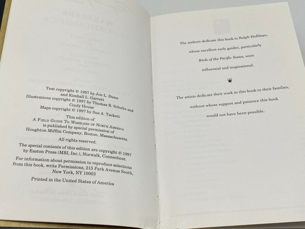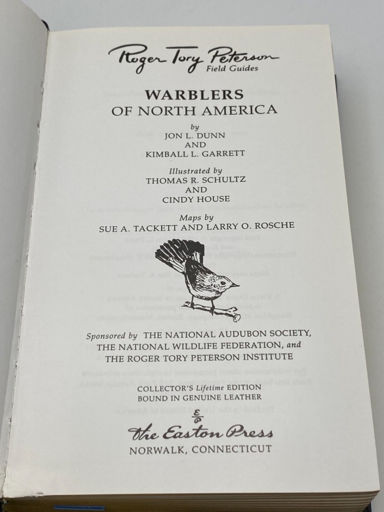 MAKES THE PERFECT GIFT FOR ANY BIRD WATCHER ** PLEASE READ : Mahalo for taking the time to look at our listing. We truly appreciate it. We always do our BEST to give you the most accurate description of these beautiful books. If, however, you have any SPECIFIC questions about the SIZE of the book, NUMBER of pages, TYPE of leather, SMELL or FEEL of the book, PLEASE email us through EBay’s mail system BEFORE you bid, and we will be HAPPY to give you more information. We want you to be completely happy with your purchase and keep you as our customers for years to come!** DESCRIPTION: Easton Press’s FULL LEATHER edition, LONG out of print. THIS IS AN HEIRLOOM EASTON EDITION WITH LAVISH GILT IMPRESSIONS TO THE BOARDS AND SPINE with BEAUTIFUL PHOTOS/ILLUSTRATIONS. THIS IS ONE OF THE MOST HIGHLY-PRIZED EDITIONS OF THIS FIELD GUIDE. ORIGINAL UNUSED BOOKPLATE IS INCLUDED. 🍍 NOT INCLUDED… 😃 ABOUT THE BOOK: The first comprehensive field guide to North American warblers describes all 60 species in detail, from field marks and vocalizations to mating habits and preferred habitats. The 32 color paintings use the unique Peterson Identification System to indicate what distinguishes one bird from another. 141 color photographs show various plumages for each species, and 60 large color maps show species' ranges. Description CONDITION: Book is in PRISTINE condition for its age — STILL IN PUBLISHER’S ORIGINAL SHRINKWRAP. Open/interior pictures from a previous listing (SEE PICS FOR BETTER DETAILS). NO ATTACHED BOOKPLATES, WRITING FROM PREVIOUS OWNER, ETC. It is a BEAUTIFUL EDITION. SHIPPING: FREE to US ADDRESSES ONLY. INTERNATIONAL $ based on location. WE SHIP PRIORITY MAIL & PACK VERY WELL. Please check out our other listings of Easton Press, Franklin Library, and Limited Editions Club, First Edition Library, Heritage Press, International Collectors Library and Folio Society editions. WE DO COMBINE SHIPPING IF YOU PURCHASE MORE THAN ONE COPY. Mahalo for looking at our listings! By bidding/purchasing this item, you are helping a very grateful family who sends you our WARMEST ALOHA & MAHALO!