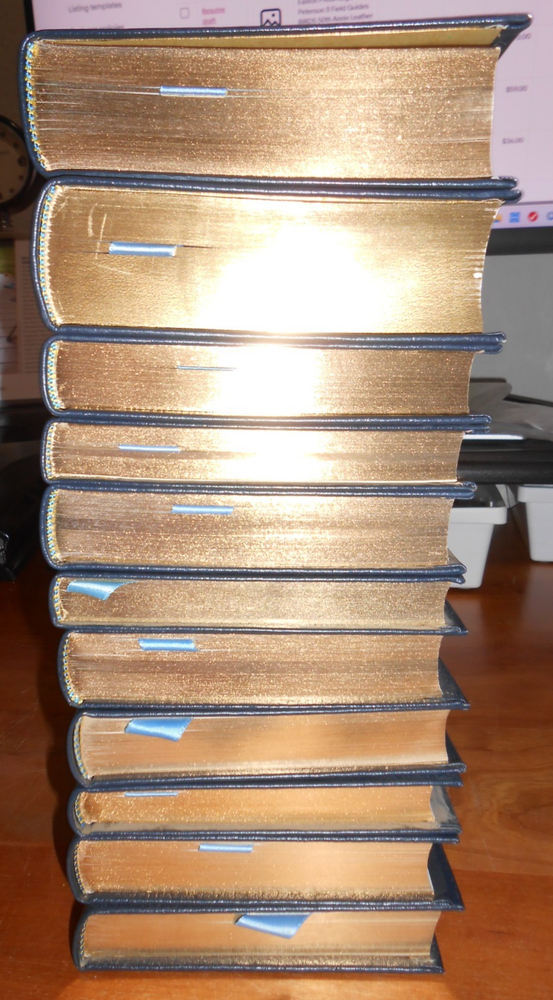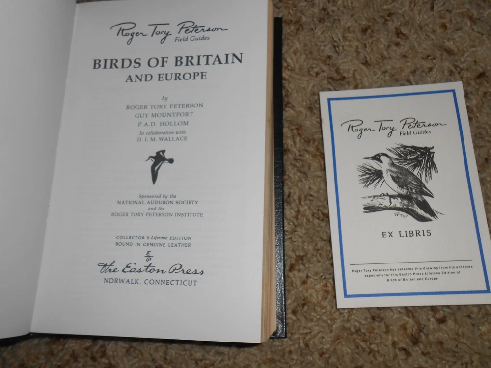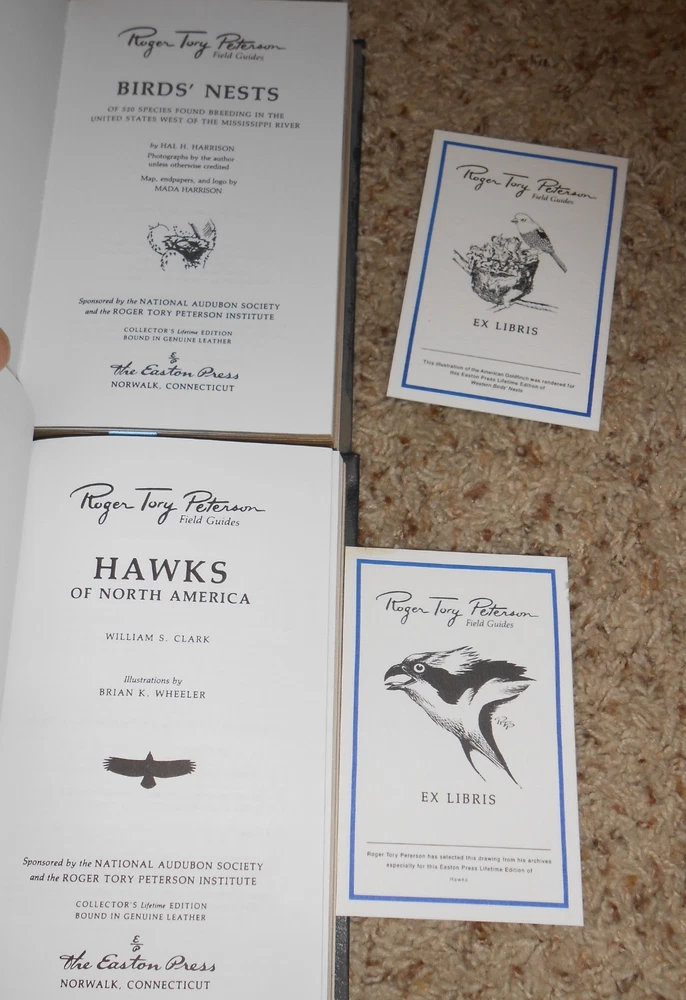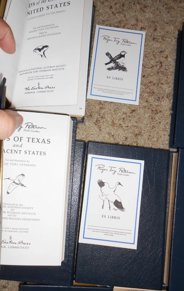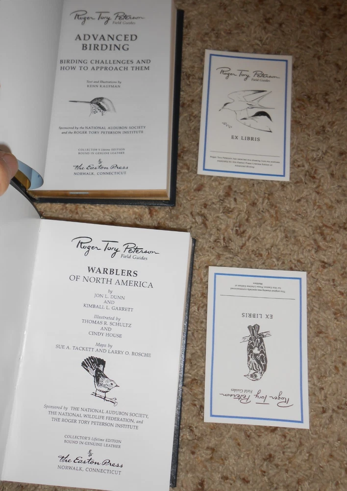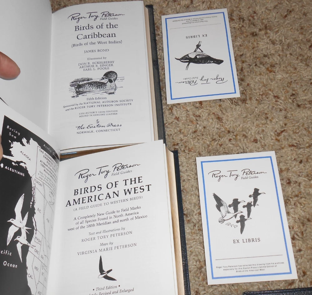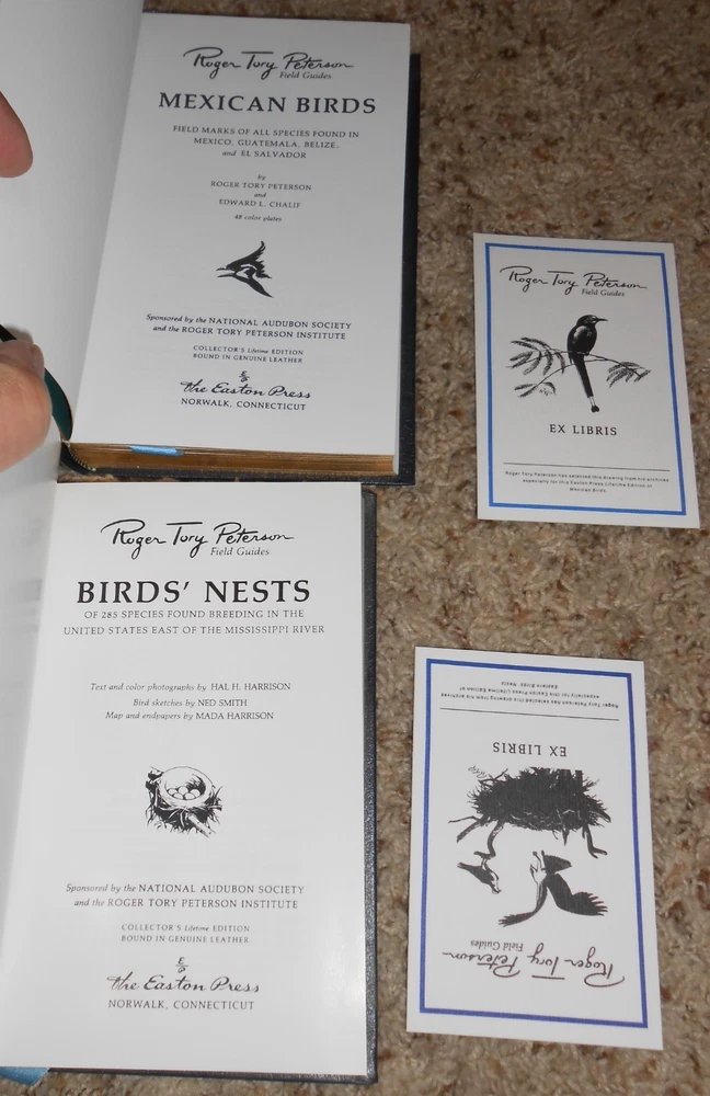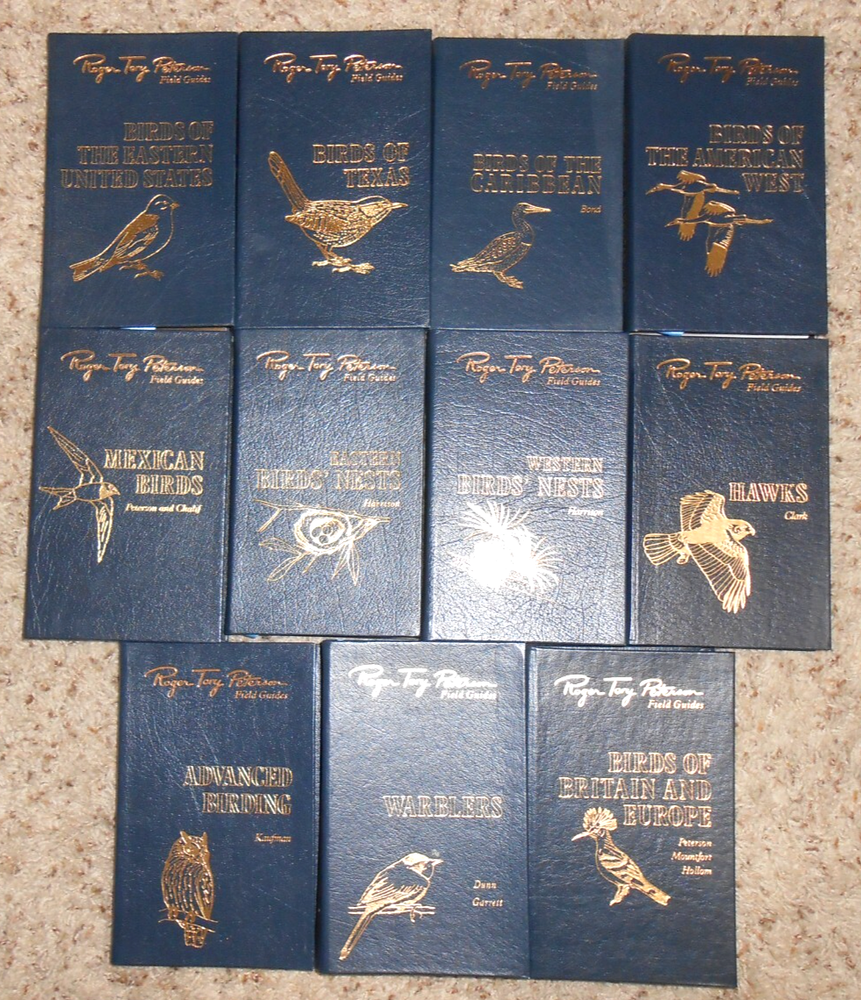 Easton Press Special 50th Anniversary Edition. Leather bindings, gilded page edges, attached bookmark and unused bookplates. This Lot of 11 Birds is listed with the spine label and the original PFG (Pacific Field Guide) number: Blue (Birds) BIRDS OF THE EASTERN US PFG 1: A Field Guide to the Birds: A Completely New Guide to All the Birds of Eastern and Central North America Fourth edition (1980):, by Roger Tory Peterson BIRDS OF TEXAS PFG 13: A Field Guide to Birds of Texas and Adjacent States (1960), by Roger Tory Peterson; Illustrations by Roger Tory Peterson (some light spots on top edge) BIRDS OF THE CARIBBEAN PFG 18 "Birds of the Caribbean". [9] Birds of the West Indies (1999), by James Bond BIRDS OF THE AMERICAN WEST PFG 2:A Field Guide to Western Birds: A Completely New Guide to Field Marks of All Species Found in North America West of the 100th Meridian and North of Mexico Third edition (1990):, by Roger Tory Peterson and Virginia MEXICAN BIRDS PFG 20: Mexican Birds: Mexico, Guatemala, Belize, and El Salvador (1973), by Roger Tory Peterson and Edward L. Chalif EASTERN BIRDS' NESTS PFG 21: Eastern Birds’ Nests: The United States East of the Mississippi River (1975), by Hal H. Harrison, Mada Harrison and Ned Smith WESTERN BIRDS' NESTSPFG 25: Western Birds’ Nests: The United States West of the Mississippi River (1979), by Harrison HAWKS PFG 35: A Field Guide to the Hawks of North America (1987), by William S. Clark and Brian K. Wheeler ADVANCED BIRDING PFG 39: Advanced Birding (1990), by Kenn Kaufman WARBLERS PFG 49: A Field Guide to Warblers of North America (1997), by Jon Dunn, Kimball Garrett, Sue A. Tackett and Larry O. Rosche BIRDS OF BRITAIN AND EUROPE PFG 8: A Field Guide to the Birds of Britain and Europe Fifth edition (1993) , by Roger Tory Peterson, Guy Mountfort, and P.A.D. Hollom Leather Hardcovers Condition: RATED: USED: Very Good to Like New condition. See Condition Description for details. Please review all photos. Dimensions: 7.5” (H) x 4.75” (W) x 11.125” (Shelf Width). Will be shipped in one box. (Shipping approximately 13 lbs. total weight) Local Pickup (Sacramento, CA): Our store hours are 9am to 3pm, Wednesdays, Fridays and Saturdays. Pickup date must be pre-arranged. International shipping is with eBay’s Global Shipping Program only. International Buyers - Please Note: Import duties, taxes, and charges are not included in the item price or shipping cost. These charges are the buyer's responsibility. Please check with your country's customs office to determine what these additional costs will be prior to bidding or buying. Please visit the Sacramento Book Den eBay store for other great books. Click here for the Sacramento Book Den eBay store All proceeds go to the Sacramento Public Library. Thank you for your consideration of this lot of 11 Easton Press Roger Tory Peterson Field Guides to Birds. Locator: 26653JB