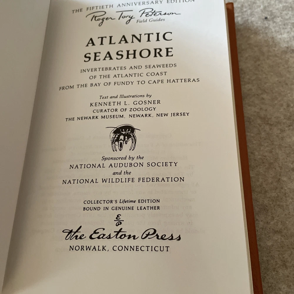 Easton Press Roger Tory Peterson Field Guides Atlantic Seashore The book is full leather. This book is in mint condition with no wear. The gold on the covers looks like new. The end pages show no fading. The gilt on the edge of the pages is in perfect condition. Please see photos. We try to describe as accurately as possible so you will be satisfied with your purchase. We have more books from this set on eBay and we would be happy to combine on shipping to save you money. All books are sent with insurance via USPS Media Mail.