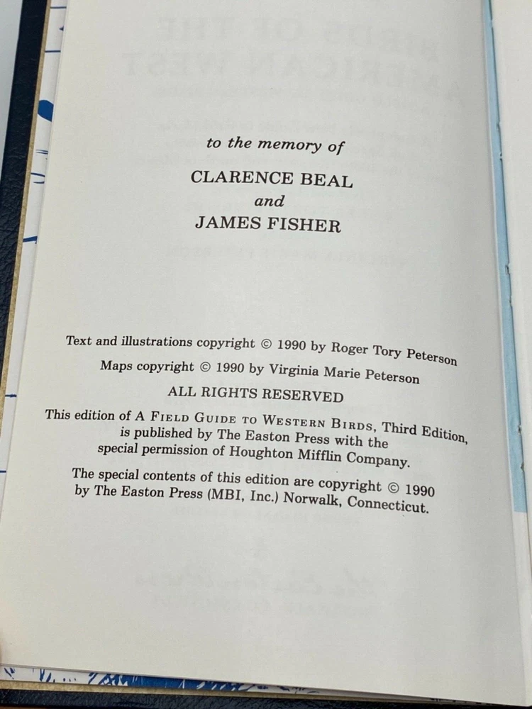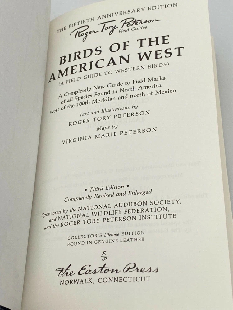 MAKES THE PERFECT GIFT FOR ANY BIRD LOVER ** PLEASE READ : Mahalo for taking the time to look at our listing. We truly appreciate it. We always do our BEST to give you the most accurate description of these beautiful books. If, however, you have any SPECIFIC questions about the SIZE of the book, NUMBER of pages, TYPE of leather, SMELL or FEEL of the book, PLEASE email us through EBay’s mail system BEFORE you bid, and we will be HAPPY to give you more information. We want you to be completely happy with your purchase and keep you as our customers for years to come!** DESCRIPTION: Easton Press’s FULL LEATHER edition, LONG out of print. THIS IS AN HEIRLOOM EASTON EDITION WITH BEAUTIFUL ILLUSTRATIONS. ABOUT THE BOOK: T he Peterson Field Guide to Western Birds covers nearly 600 species on 176 color plates, with 588 comprehensive range maps, now included with the illustrations. Every bird watcher in western North America will want to own this. Description CONDITION: Book is in EXCELLENT condition for its age with only a few rubs to the gilt endpages and bumps to the edges of the boards (SEE PICS FOR FURTHER DETAILS). NO WRITING FROM PREVIOUS OWNER, ETC. It is truly a SPECTACULAR EDITION. SHIPPING: $3.99 to US ADDRESSES ONLY. INTERNATIONAL $ based on location. WE SHIP PRIORITY MAIL & PACK VERY WELL. Please check out our other listings of Easton Press, Franklin Library, and Limited Editions Club, First Edition Library, and Folio Society editions. WE DO COMBINE SHIPPING IF YOU PURCHASE MORE THAN ONE COPY. Mahalo for looking at our listings! By bidding/purchasing this item, you are helping a very grateful family who sends you our WARMEST ALOHA & MAHALO!