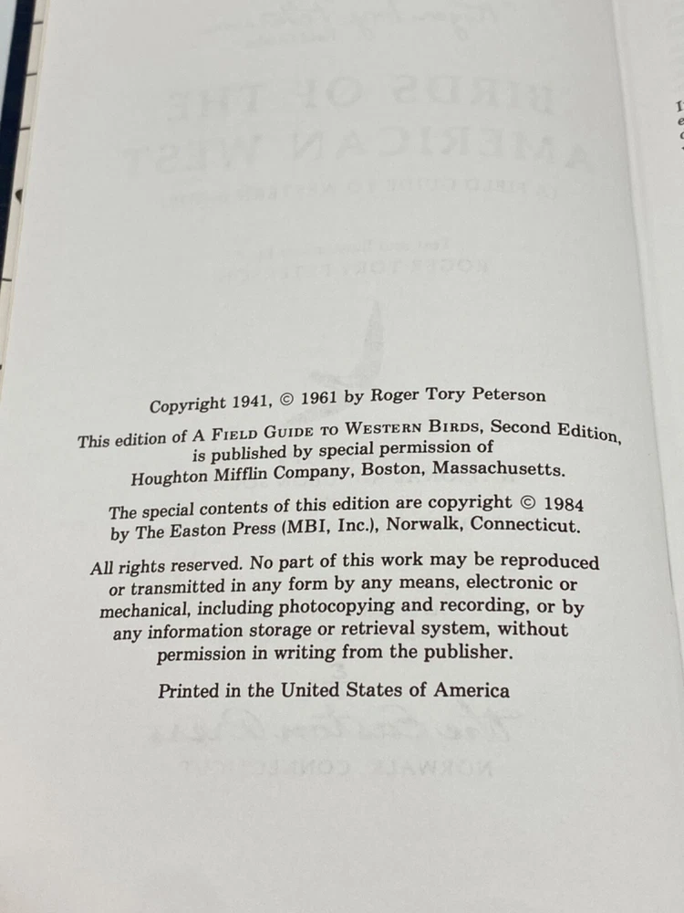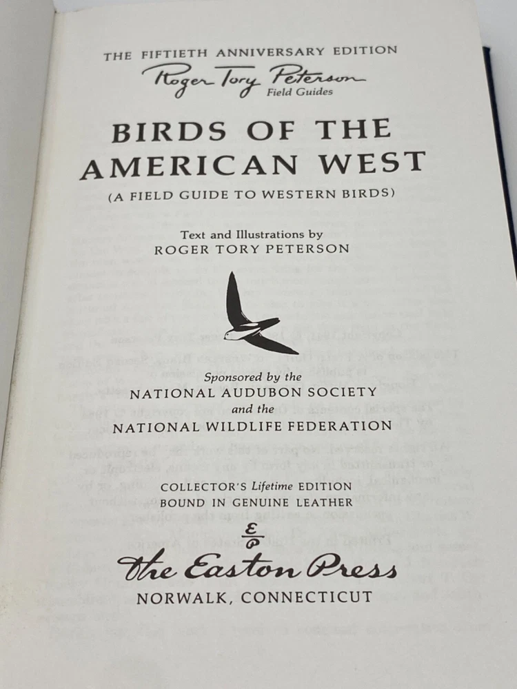MAKES THE PERFECT GIFT FOR ANY BIRD WATCHER ** PLEASE READ : Mahalo for taking the time to look at our listing. We truly appreciate it. We always do our BEST to give you the most accurate description of these beautiful books. If, however, you have any SPECIFIC questions about the SIZE of the book, NUMBER of pages, TYPE of leather, SMELL or FEEL of the book, PLEASE email us through EBay’s mail system BEFORE you bid, and we will be HAPPY to give you more information. We want you to be completely happy with your purchase and keep you as our customers for years to come!** DESCRIPTION: Easton Press’s FULL LEATHER edition, LONG out of print edition of BIRDS OF THE AMERICAN WEST . THIS IS VINTAGE HEIRLOOM EASTON EDITION WITH LAVISH GILT IMPRESSIONS TO THE BOARDS AND SPINE with BEAUTIFUL COLOR PHOTOGRAPHS. ORIGINAL UNATTACHED, UNUSED BOOKPLATE IS INCLUDED. 🍍 NOT INCLUDED... 😃 ABOUT THE BOOK: T he Peterson Field Guide to Western Birds covers nearly 600 species on 176 color plates, with 588 comprehensive range maps, now included with the illustrations. Every bird watcher in western North America will want to own this. Description CONDITION: Book is in LIKE NEW condition for its age with only some faint negligible age spots to the gilt page ends (SEE PICS FOR BETTER DETAILS). NO ATTACHED BOOKPLATES, WRITING FROM PREVIOUS OWNER, ETC. It is a BEAUTIFUL edition. SHIPPING: FREE to US ADDRESSES ONLY. INTERNATIONAL $ based on location. WE SHIP PRIORITY MAIL & PACK VERY WELL. Please check out our other listings of Easton Press, Franklin Library, Heritage Press, Limited Editions Club, First Edition Library, and Folio Society editions. WE DO COMBINE SHIPPING IF YOU PURCHASE MORE THAN ONE COPY. Mahalo for looking at our listings! By bidding/purchasing this item, you are helping a very grateful family who sends you our WARMEST ALOHA & MAHALO!