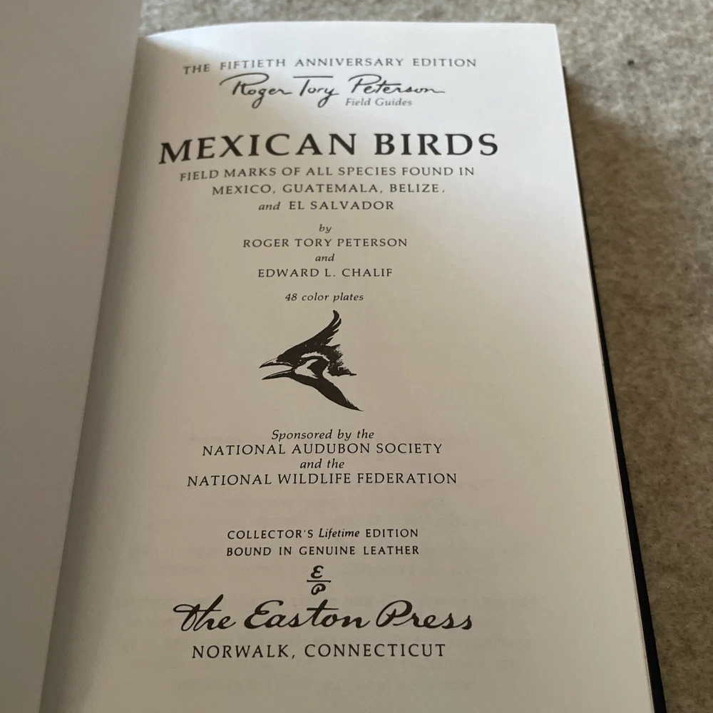 Easton Press Roger Tory Peterson Field Guides Mexican Birds The book is full leather. This book is in mint condition with no wear. The gold on the covers looks like new. The end pages show no fading. The gilt on the edge of the pages is in perfect condition. Please see photos. We try to describe as accurately as possible so you will be satisfied with your purchase. We have more books from this set on eBay and we would be happy to combine on shipping to save you money. All books are sent with insurance via USPS Media Mail.