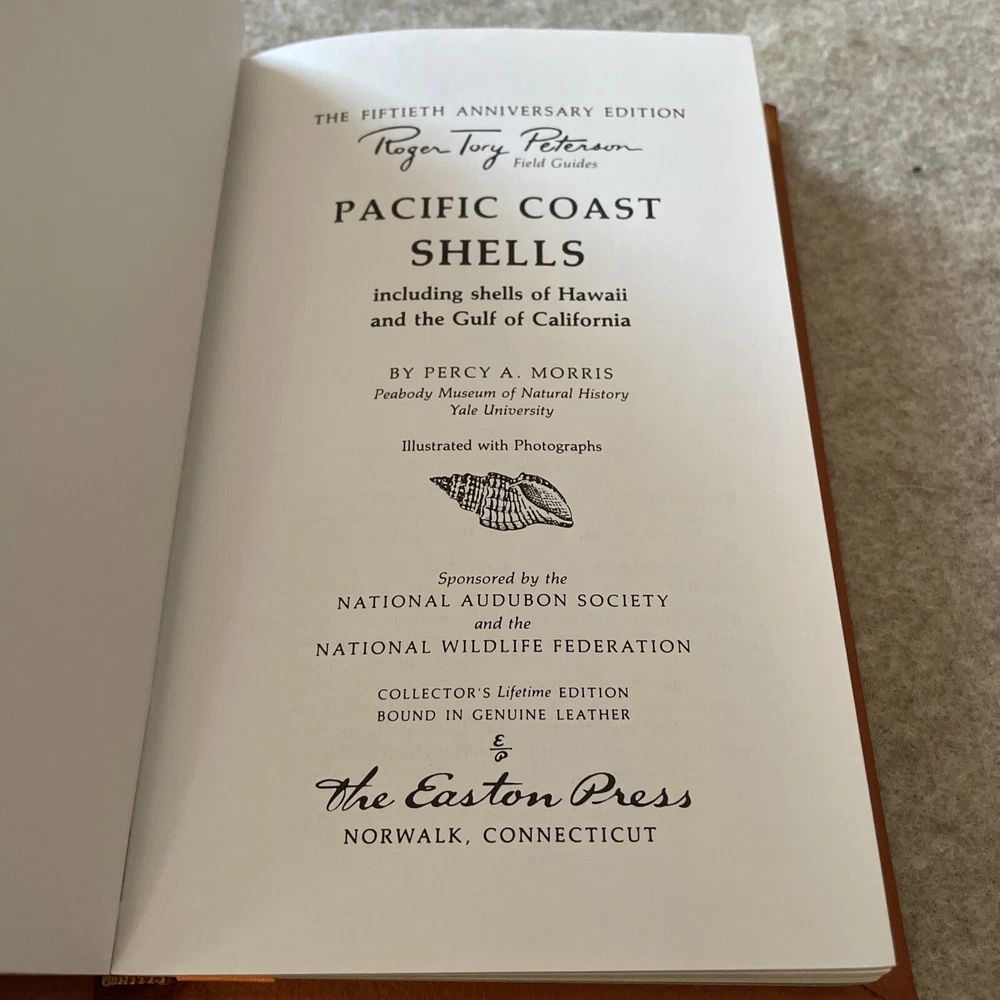 Easton Press Roger Tory Peterson Field Guides Pacific Shells The book is full leather. This book is in mint condition with no wear. The gold on the covers looks like new. The end pages show no fading. The gilt on the edge of the pages is in perfect condition. Please see photos. We try to describe as accurately as possible so you will be satisfied with your purchase. We have more books from this set on eBay and we would be happy to combine on shipping to save you money. All books are sent with insurance via USPS Media Mail.