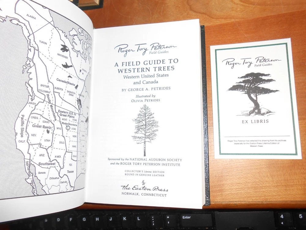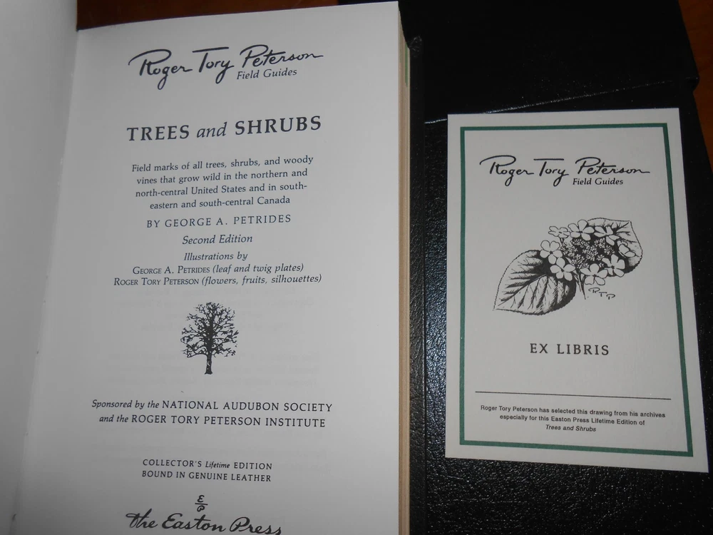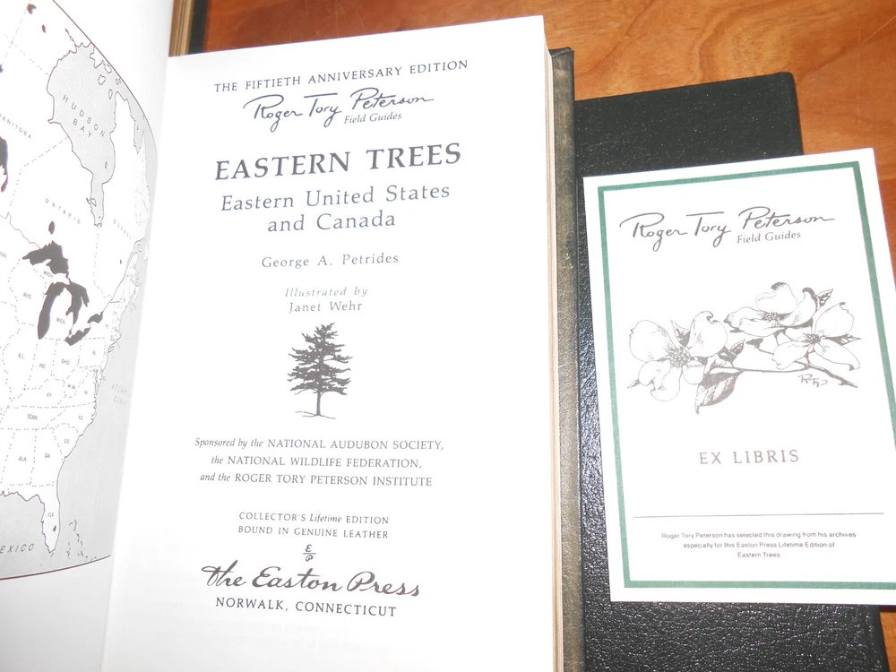 Easton Press Special 50th Anniversary Edition. Leather bindings, gilded page edges, attached bookmark and unused bookplates. This Lot of 4 focuses on Trees from the Plant series and is listed with the spine label and the original PFG (Pacific Field Guide) number:: Dark Green (Plants, etc.) TREES AMD SJRIBS PFG 11A: A Field Guide to Trees and Shrubs: Field Marks of All Trees, Shrubs, and Woody Vines That Grow Wild in the Northeastern and North-Central United States Second edition (1972), by George A. Petrides: EASTERN TREES PFG 11B: PFG 11A A Field Guide to Eastern Trees: Eastern United States and Canada (1988), by George A. Petrides; Illustrated by Janet Wehr EASTERN FORESTS PFG 37: A Field Guide to the Ecology of Eastern Forests: North America (1988), by John C. Kricher; Illustrated by Gordon Morrison WESTERN TREES PFG 44: A Field Guide to Western Trees: Western United States and Canada (1992), by George A. Petrides; Illustrated by Olivia Petrides Leather Hardcovers Condition: RATED: USED: Like New condition. See Condition Description for details. Please review all photos. Dimensions: 7.5” (H) x 4.75” (W) x 4.5” (Shelf Width). Will be shipped in one box. (Shipping approximately 5 lbs. total weight) Local Pickup (Sacramento, CA): Our store hours are 9am to 3pm, Wednesdays, Fridays and Saturdays. Pickup date must be pre-arranged. International shipping is with eBay’s Global Shipping Program only. International Buyers - Please Note: Import duties, taxes, and charges are not included in the item price or shipping cost. These charges are the buyer's responsibility. Please check with your country's customs office to determine what these additional costs will be prior to bidding or buying. Please visit the Sacramento Book Den eBay store for other great books. Click here for the Sacramento Book Den eBay store All proceeds go to the Sacramento Public Library. Thank you for your consideration of this lot of 4 Easton Press Roger Tory Peterson Field Guides "Trees". Locator: 26658JB