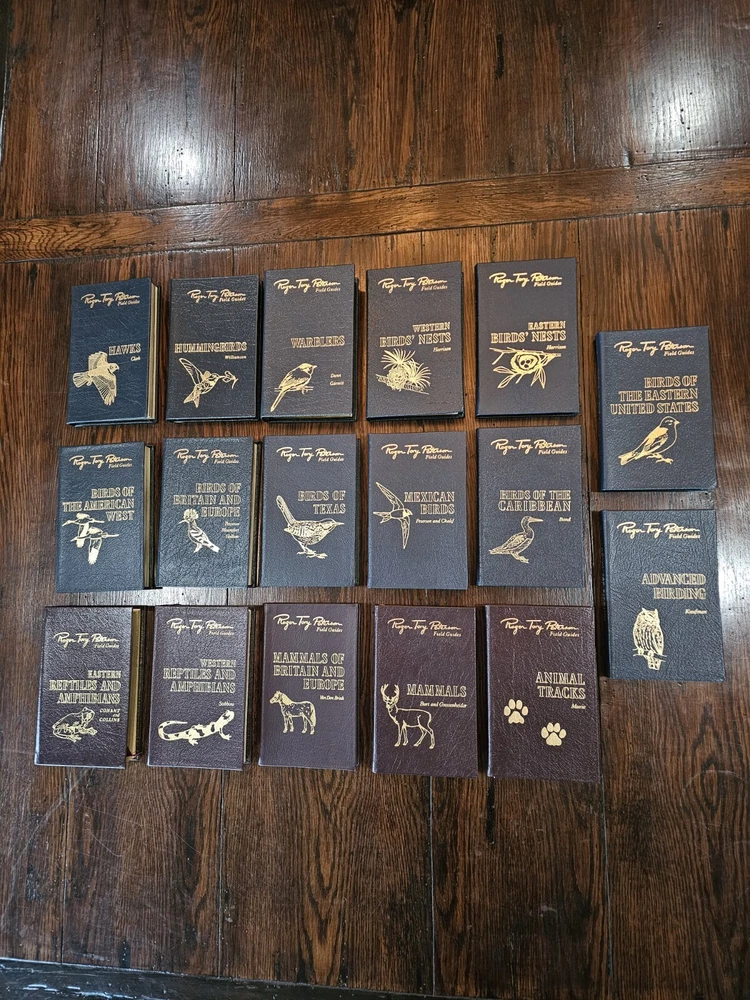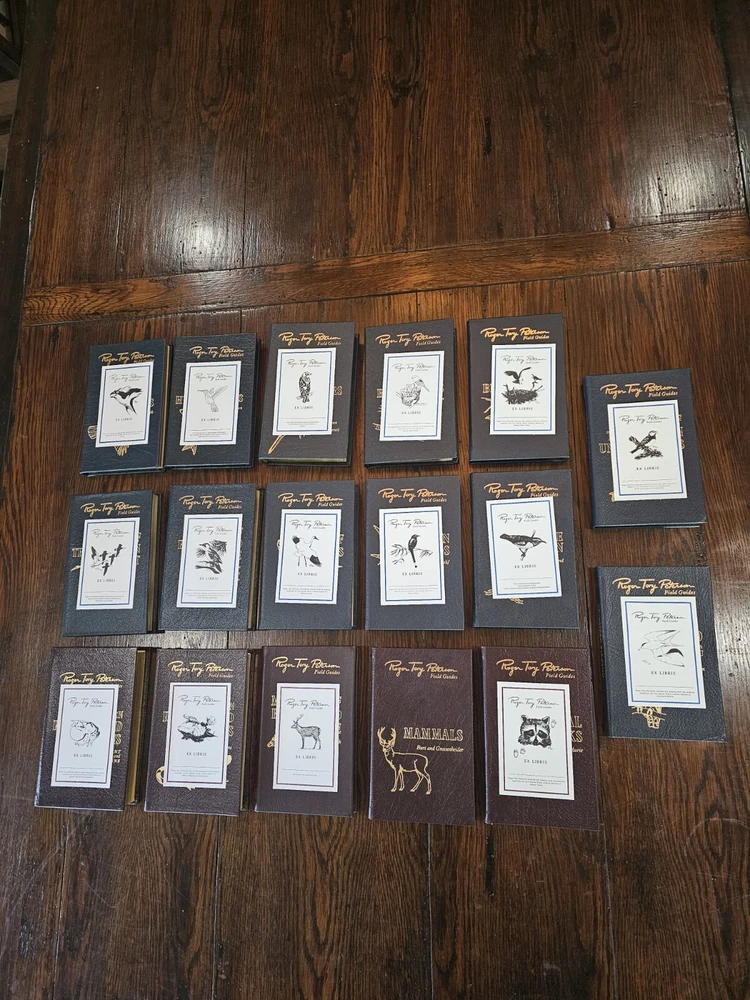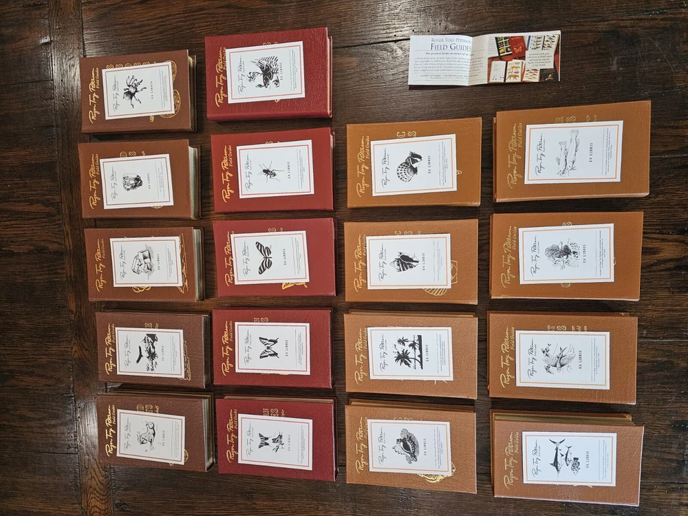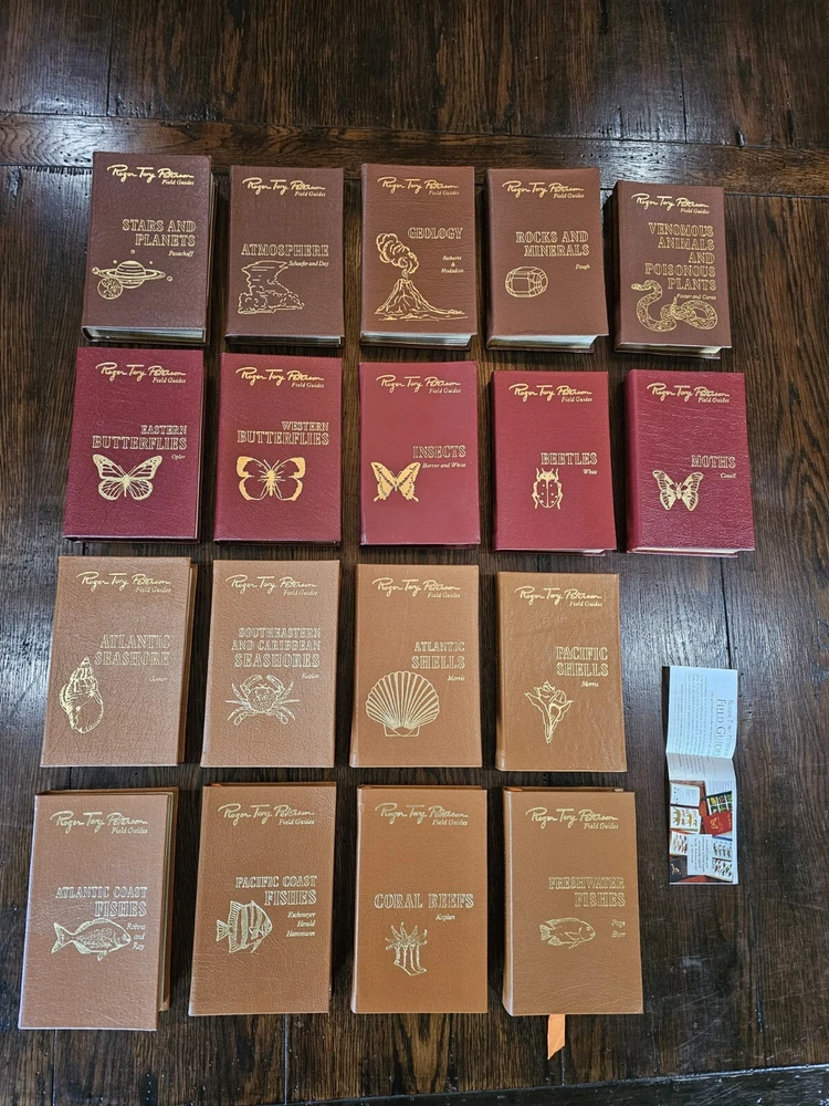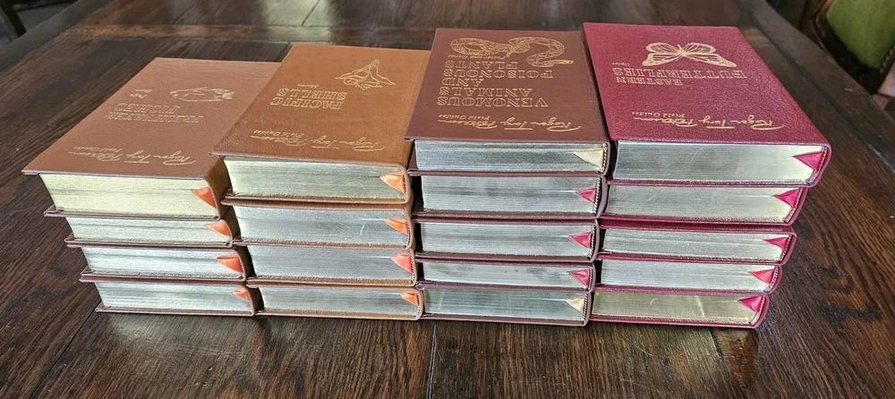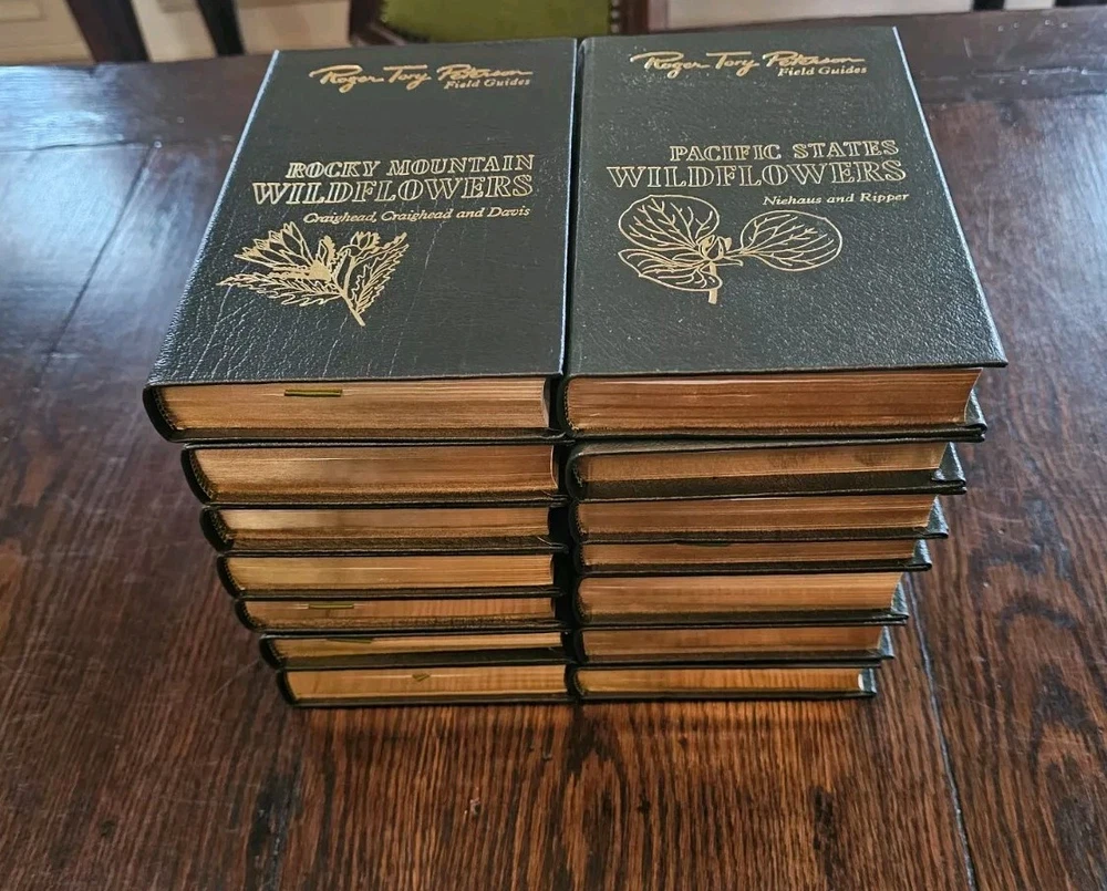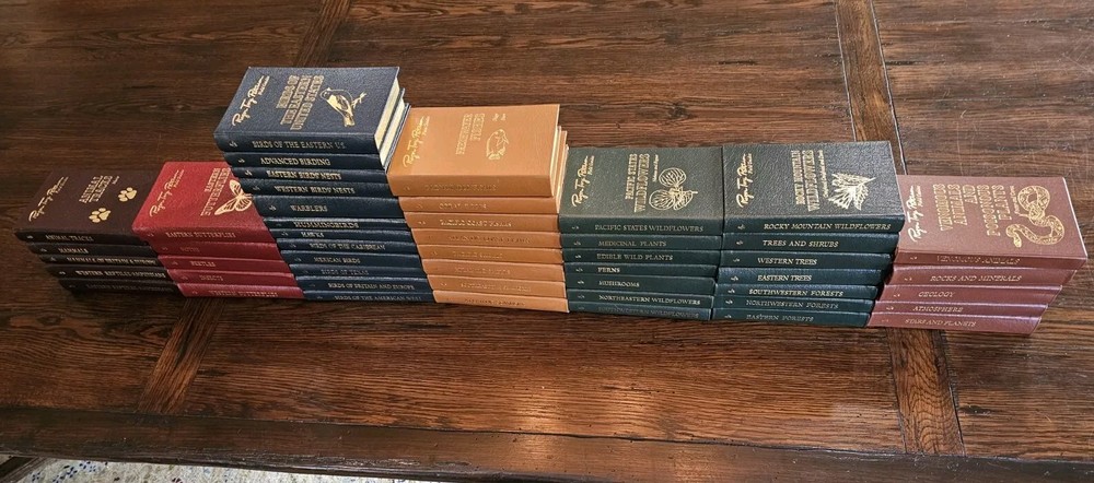 Explore the natural world with this lot of 49 volumes of Roger Tory Peterson's field guides, published by Easton Press. These leather-bound books are in their original state and come in English. The guides cover various topics related to outdoor and nature, making them perfect for collectors and enthusiasts alike. Whether you're an avid birdwatcher or a hiker, these field guides will be a valuable addition to your collection. This set has been stored since purchase. A few book plates are missing. See photos Below is a list of the original 50 volumes. The volume missing is #2 Western Forests 1. Eastern Forests by Kricher 2. WESTERN FORESTS by Kricher MISSING 3. Northwestern Forests by Kricher 4. Southwestern Forests by Kricher 5. Southwestern and Texas Wildflowers by Niehaus and Ripper and Savage 6. Rocky Mountain Wildflowers by Craighead, Craighead and Davis 7. Pacific States Wildflowers by Niehaus and Ripper 8. Northeastern Wildflowers by Peterson and McKenny 9. Eastern Trees by Petrides 10. Western Trees by Petrides 11. Ferns by Cobb 12. Edible Wild Plants by L.A. Peterson 13. Medicinal Plants by Foster and Duke 14. Mushrooms by McKnight 15. Trees and Shrubs by Petrides 16. Advanced Birding by Kaufman 17. Western Birds' Nests by Harrison 18. Eastern Birds' Nests by Harrison 19. Birds of the Caribbean by Bond 20. Birds of the American West by Peterson 21. Birds of Texas by Peterson 22. Birds of Britain and Europe by Peterson and Mountfort and Hollom 23. Birds of the Eastern U.S. by Peterson, personally hand-signed by Roger Tory Peterson 24. Mexican Birds by Peterson and Chalif 25. Hummingbirds by Williamson 26. Hawks by Clark 27. Warblers by Dunn and Garrett 28. Coral Reefs by Kaplan 29. Freshwater Fishes by Page and Burr 30. Pacific Coast Fishes by Eschmeyer and Herald and Hammann 31. Atlantic Coast Fishes by Robins and Ray 32. Pacific Shells by Morris 33. Atlantic Shells by Morris 34. Southeastern and Caribbean Seashores by Kaplan 35. Atlantic Seashore by Gosner 36. Rocks and Minerals by Pough 37. Atmosphere by Schaefer and Day 38. Stars and Planets by Pasachoff 39. Geology by Roberts and Hodsdon 40. Venomous Animals and Poisonous Plants by Foster and Caras 41. Animal Tracks by Murie 42. Eastern Reptiles and Amphibians by Conant 43. Western Reptiles and Amphibians by Stebbins 44. Mammals by Burt and Grossenheider 45. Mammals of Britain and Europe by Van Den Brink 46. Insects by Borror and White 47. Eastern Butterflies by Opler 48. Western Butterflies by Tilden and Smith 49. Moths by Covell 50. Beetles by White