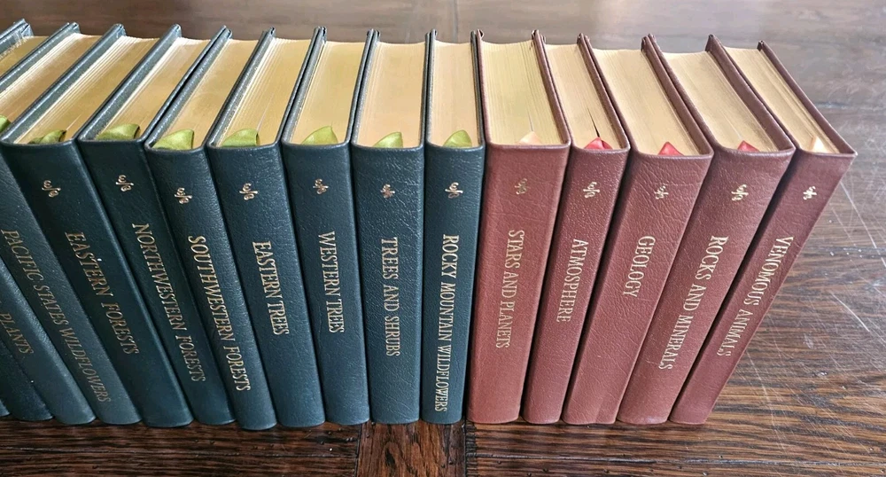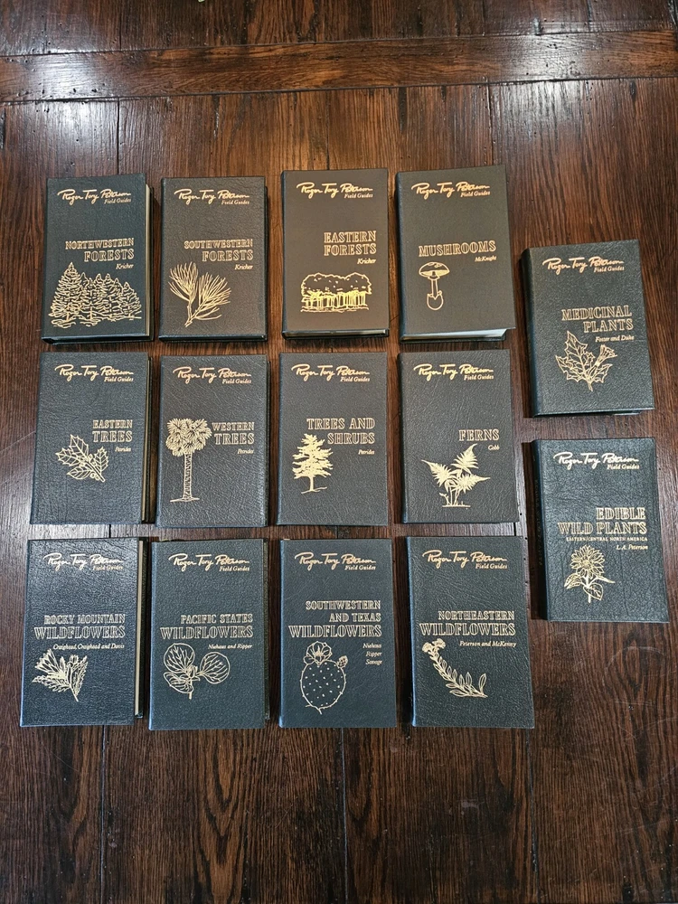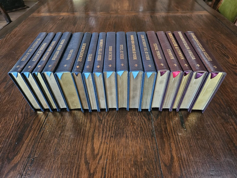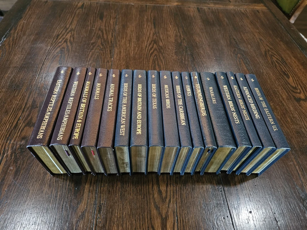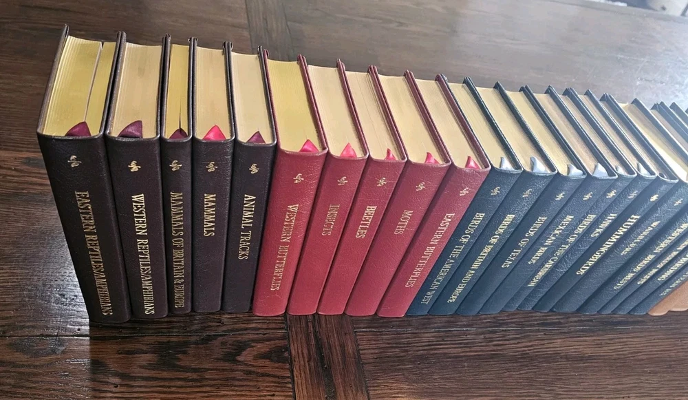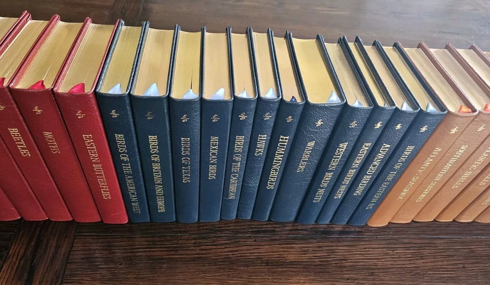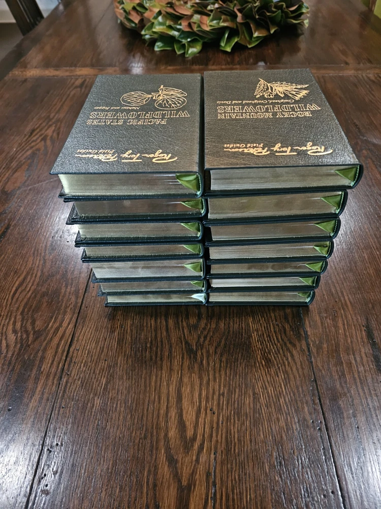 Explore the natural world with this lot of 49 volumes of Roger Tory Peterson's field guides, published by Easton Press. These leather-bound books are in their original state and come in English. The guides cover various topics related to outdoor and nature, making them perfect for collectors and enthusiasts alike. Whether you're an avid birdwatcher or a hiker, these field guides will be a valuable addition to your collection. This set has been stored since purchase. A few book plates are missing. See photos Below is a list of the original 50 volumes. The volume missing is #2 Western Forests 1. Eastern Forests by Kricher 2. WESTERN FORESTS by Kricher MISSING 3. Northwestern Forests by Kricher 4. Southwestern Forests by Kricher 5. Southwestern and Texas Wildflowers by Niehaus and Ripper and Savage 6. Rocky Mountain Wildflowers by Craighead, Craighead and Davis 7. Pacific States Wildflowers by Niehaus and Ripper 8. Northeastern Wildflowers by Peterson and McKenny 9. Eastern Trees by Petrides 10. Western Trees by Petrides 11. Ferns by Cobb 12. Edible Wild Plants by L.A. Peterson 13. Medicinal Plants by Foster and Duke 14. Mushrooms by McKnight 15. Trees and Shrubs by Petrides 16. Advanced Birding by Kaufman 17. Western Birds' Nests by Harrison 18. Eastern Birds' Nests by Harrison 19. Birds of the Caribbean by Bond 20. Birds of the American West by Peterson 21. Birds of Texas by Peterson 22. Birds of Britain and Europe by Peterson and Mountfort and Hollom 23. Birds of the Eastern U.S. by Peterson, personally hand-signed by Roger Tory Peterson 24. Mexican Birds by Peterson and Chalif 25. Hummingbirds by Williamson 26. Hawks by Clark 27. Warblers by Dunn and Garrett 28. Coral Reefs by Kaplan 29. Freshwater Fishes by Page and Burr 30. Pacific Coast Fishes by Eschmeyer and Herald and Hammann 31. Atlantic Coast Fishes by Robins and Ray 32. Pacific Shells by Morris 33. Atlantic Shells by Morris 34. Southeastern and Caribbean Seashores by Kaplan 35. Atlantic Seashore by Gosner 36. Rocks and Minerals by Pough 37. Atmosphere by Schaefer and Day 38. Stars and Planets by Pasachoff 39. Geology by Roberts and Hodsdon 40. Venomous Animals and Poisonous Plants by Foster and Caras 41. Animal Tracks by Murie 42. Eastern Reptiles and Amphibians by Conant 43. Western Reptiles and Amphibians by Stebbins 44. Mammals by Burt and Grossenheider 45. Mammals of Britain and Europe by Van Den Brink 46. Insects by Borror and White 47. Eastern Butterflies by Opler 48. Western Butterflies by Tilden and Smith 49. Moths by Covell 50. Beetles by White