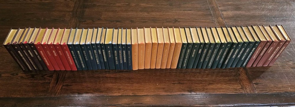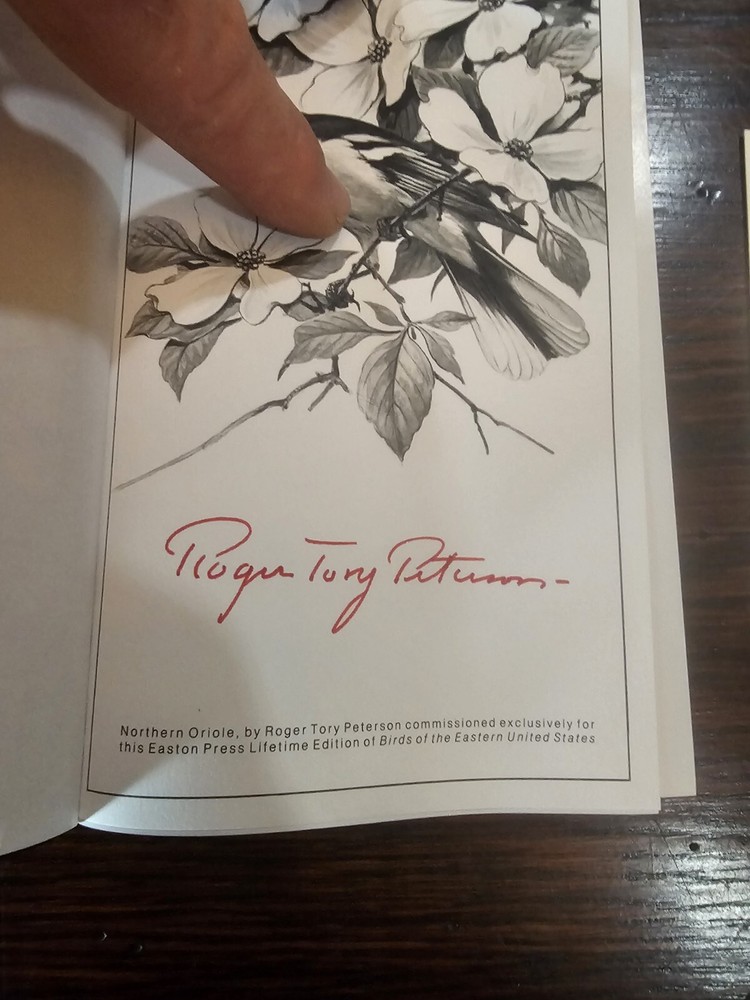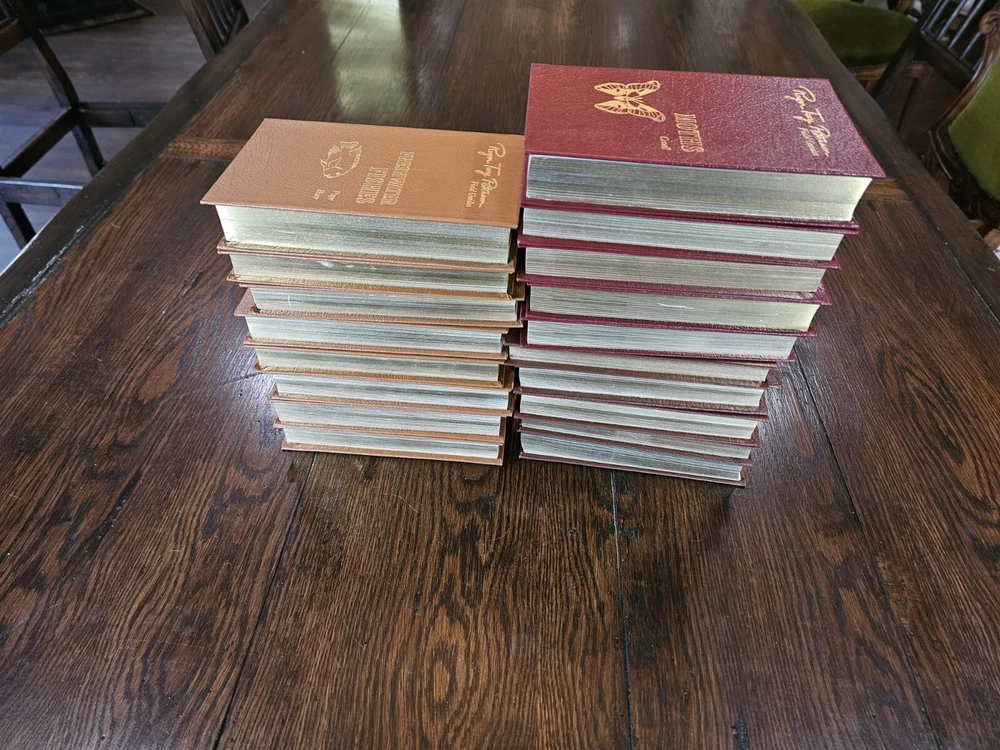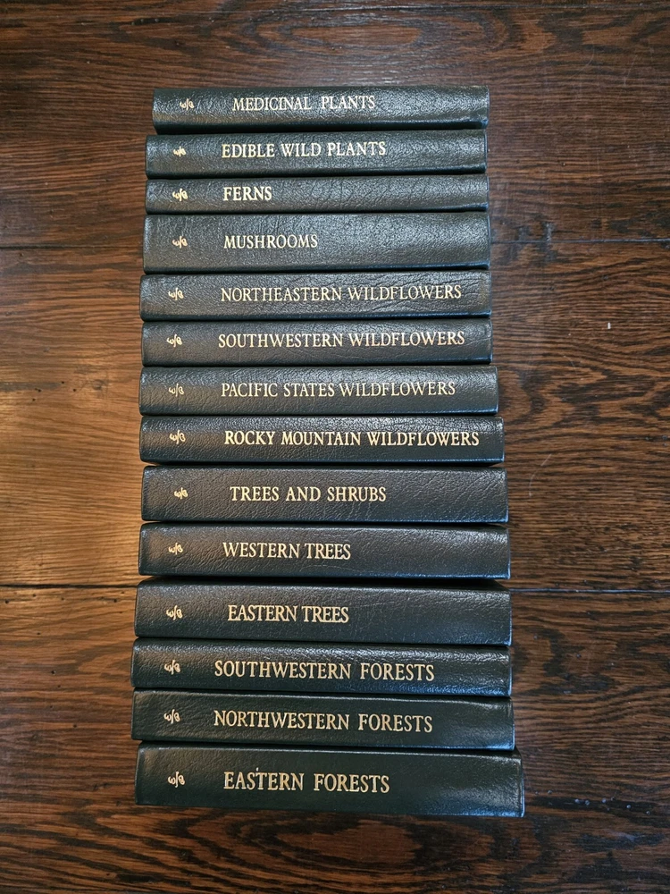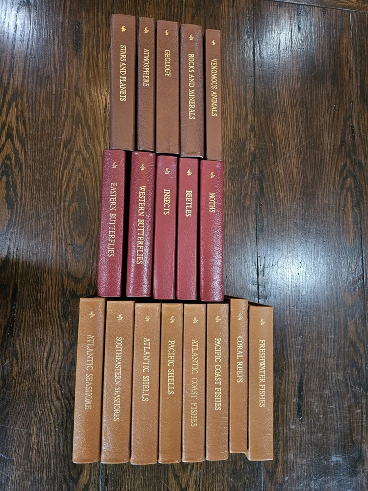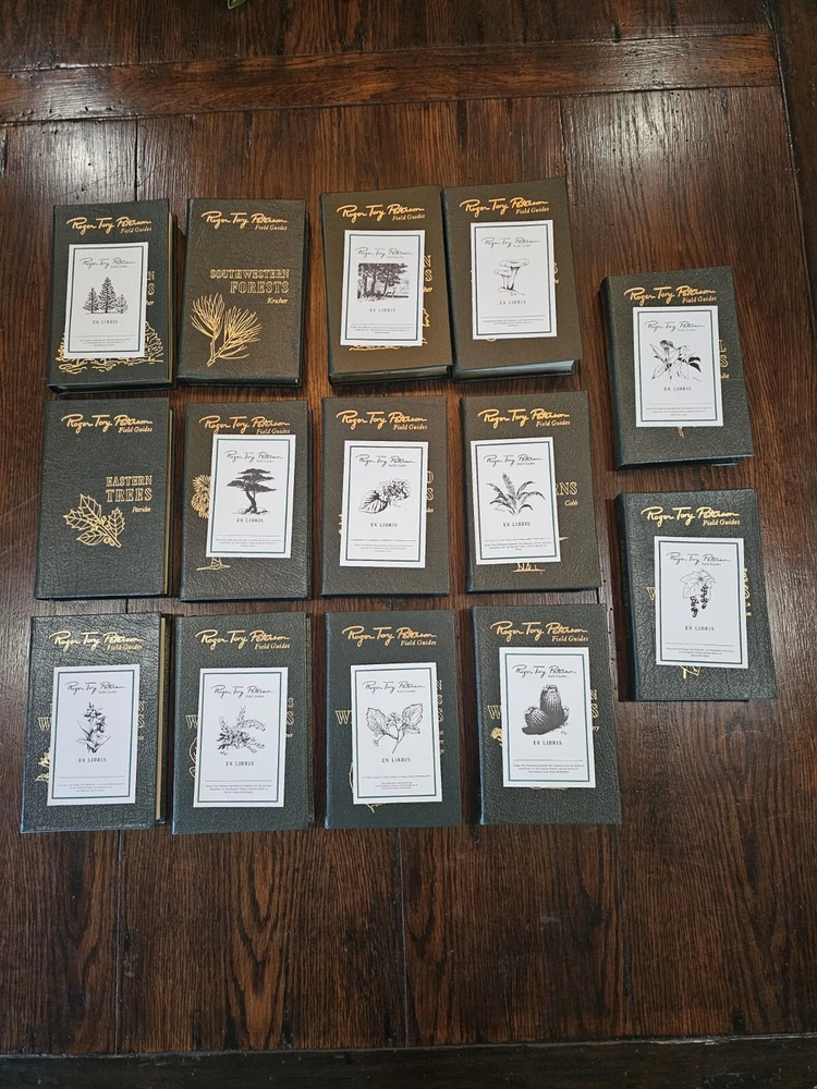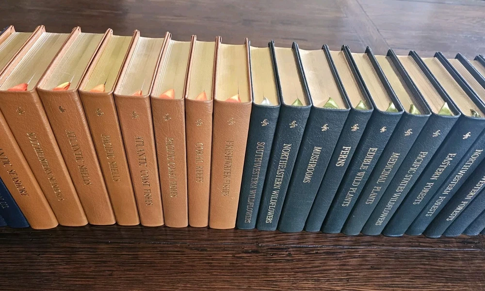 Explore the natural world with this lot of 49 volumes of Roger Tory Peterson's field guides, published by Easton Press. These leather-bound books are in their original state and come in English. The guides cover various topics related to outdoor and nature, making them perfect for collectors and enthusiasts alike. Whether you're an avid birdwatcher or a hiker, these field guides will be a valuable addition to your collection. This set has been stored since purchase. A few book plates are missing. See photos Below is a list of the original 50 volumes. The volume missing is #2 Western Forests 1. Eastern Forests by Kricher 2. WESTERN FORESTS by Kricher MISSING 3. Northwestern Forests by Kricher 4. Southwestern Forests by Kricher 5. Southwestern and Texas Wildflowers by Niehaus and Ripper and Savage 6. Rocky Mountain Wildflowers by Craighead, Craighead and Davis 7. Pacific States Wildflowers by Niehaus and Ripper 8. Northeastern Wildflowers by Peterson and McKenny 9. Eastern Trees by Petrides 10. Western Trees by Petrides 11. Ferns by Cobb 12. Edible Wild Plants by L.A. Peterson 13. Medicinal Plants by Foster and Duke 14. Mushrooms by McKnight 15. Trees and Shrubs by Petrides 16. Advanced Birding by Kaufman 17. Western Birds' Nests by Harrison 18. Eastern Birds' Nests by Harrison 19. Birds of the Caribbean by Bond 20. Birds of the American West by Peterson 21. Birds of Texas by Peterson 22. Birds of Britain and Europe by Peterson and Mountfort and Hollom 23. Birds of the Eastern U.S. by Peterson, personally hand-signed by Roger Tory Peterson 24. Mexican Birds by Peterson and Chalif 25. Hummingbirds by Williamson 26. Hawks by Clark 27. Warblers by Dunn and Garrett 28. Coral Reefs by Kaplan 29. Freshwater Fishes by Page and Burr 30. Pacific Coast Fishes by Eschmeyer and Herald and Hammann 31. Atlantic Coast Fishes by Robins and Ray 32. Pacific Shells by Morris 33. Atlantic Shells by Morris 34. Southeastern and Caribbean Seashores by Kaplan 35. Atlantic Seashore by Gosner 36. Rocks and Minerals by Pough 37. Atmosphere by Schaefer and Day 38. Stars and Planets by Pasachoff 39. Geology by Roberts and Hodsdon 40. Venomous Animals and Poisonous Plants by Foster and Caras 41. Animal Tracks by Murie 42. Eastern Reptiles and Amphibians by Conant 43. Western Reptiles and Amphibians by Stebbins 44. Mammals by Burt and Grossenheider 45. Mammals of Britain and Europe by Van Den Brink 46. Insects by Borror and White 47. Eastern Butterflies by Opler 48. Western Butterflies by Tilden and Smith 49. Moths by Covell 50. Beetles by White