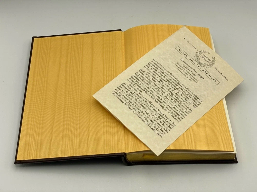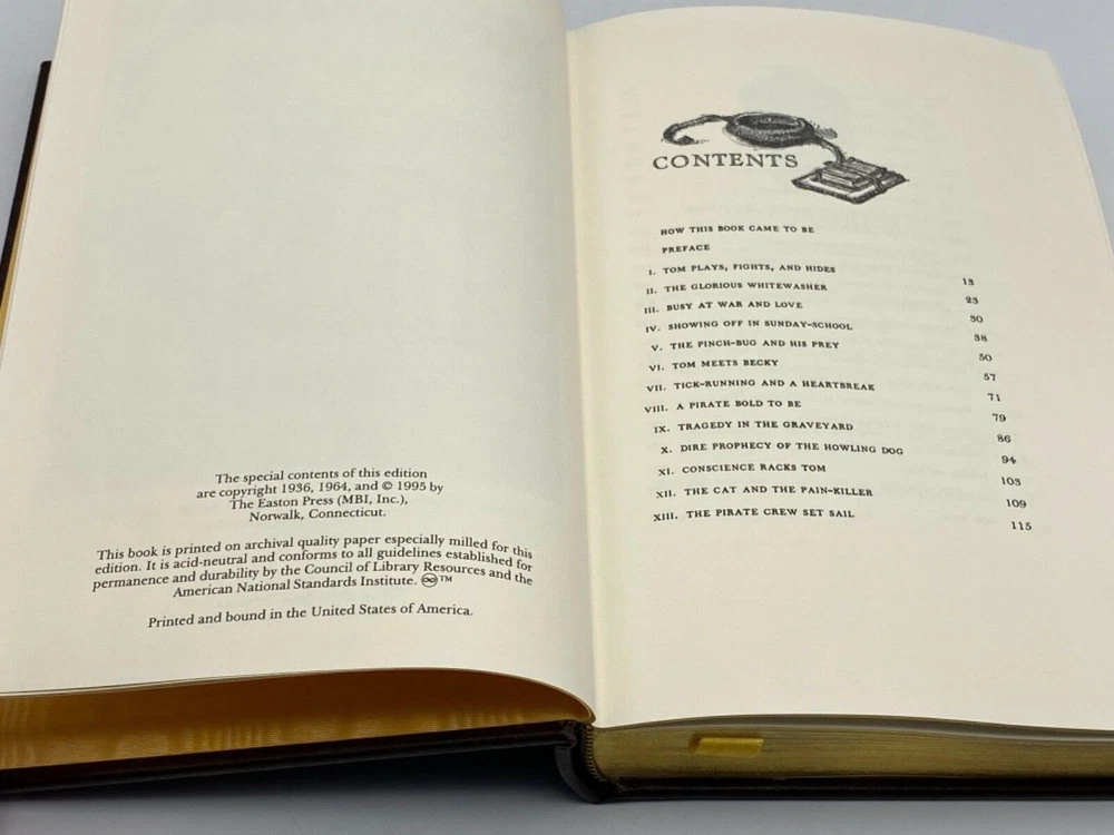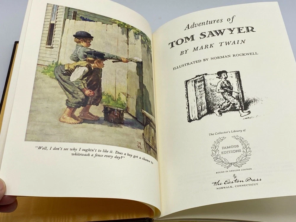 MAKES THE PERFECT GIFT FOR ANY FAN OF MARK TWAIN / THE CLASSICS / AMERICANA ** PLEASE READ : Mahalo for taking the time to look at our listing. We truly appreciate it. We always do our BEST to give you the most accurate description of these beautiful books. If, however, you have any SPECIFIC questions about the SIZE of the book, NUMBER of pages, TYPE of leather, SMELL or FEEL of the book, PLEASE email us through EBay’s mail system BEFORE you bid, and we will be HAPPY to give you more information. We want you to be completely happy with your purchase and keep you as our customers for years to come!** DESCRIPTION: Easton Press’s LONG OUT OF PRINT version of TOM SAWYER, Huckleberry Finn’s Companion. THIS IS A SCARCE, ONE OF THE MOST DIFFICULT TO FIND VINTAGE HEIRLOOM EASTONS WITH LAVISH DEEP GILT IMPRESSIONS TO THE BOARDS & AMAZING ILLUSTRATIONS BY NORMAN ROCKWELL. IT IS ONE OF THE MOST HIGHLY-PRIZED & MOST BEAUTIFUL EDITIONS OF THIS CLASSICS YOU CAN FIND OUT THERE. NOTES FROM THE ARCHIVES ARE INCLUDED. 🍍 NOT INCLUDED... 😊 ABOUT THE BOOK: The Adventures of Tom Sawyer by Mark Twain is an 1876 novel about a young boy growing up along the Mississippi River. The story is set in the fictional town of St. Petersburg, inspired by Hannibal, Missouri, where Twain lived.Tom Sawyer lives with his Aunt Polly and his half-brother Sid. Tom dirties his clothes in a fight and is made to whitewash the fence the next day as punishment. He cleverly persuades his friends to trade him small treasures for the privilege of doing his work. He then trades the treasures for Sunday School tickets which one normally receives for memorizing verses, redeeming them for a Bible, much to the surprise and bewilderment of the superintendent who thought "it was simply preposterous that this boy had warehoused two thousand sheaves of Scriptural wisdom on his premises—a dozen would strain his capacity, without a doubt."Tom falls in love with Becky Thatcher, a new girl in town, and persuades her to get "engaged" by kissing him. But their romance collapses when she learns Tom has been "engaged" previously to Amy Lawrence. Shortly after Becky shuns him, he accompanies Huckleberry Finn to the graveyard at night, where they witness the murder of Dr. Robinson. CONDITION: Book is in LIKE NEW condition for its age with only a few very light rubs to the gilt page ends and an attached blank bookplate, ready for your personalization (SEE PICS FOR FURTHER DETAILS). NO WRITING FROM PREVIOUS OWNER, ETC. It is a SPECTACULAR edition. SHIPPING: FREE TO US ADDRESSES ONLY. INTERNATIONAL $ based on location. WE SHIP PRIORITY MAIL AND PACK VERY WELL. Please check out our other listings of Easton Press, Franklin Library, Limited Editions Club, First Edition Library, Folio Society, Heritage Press, and International Collectors Library editions. WE DO COMBINE SHIPPING IF YOU PURCHASE MORE THAN ONE COPY. Mahalo for looking at our listings! By bidding/purchasing this item, you are helping a very grateful family who sends you our WARMEST ALOHA & MAHALO!