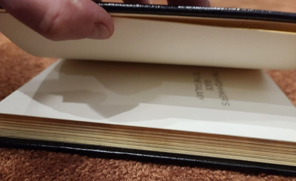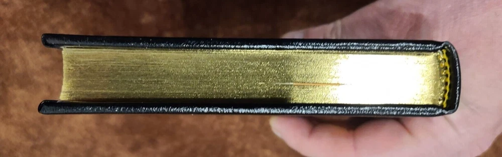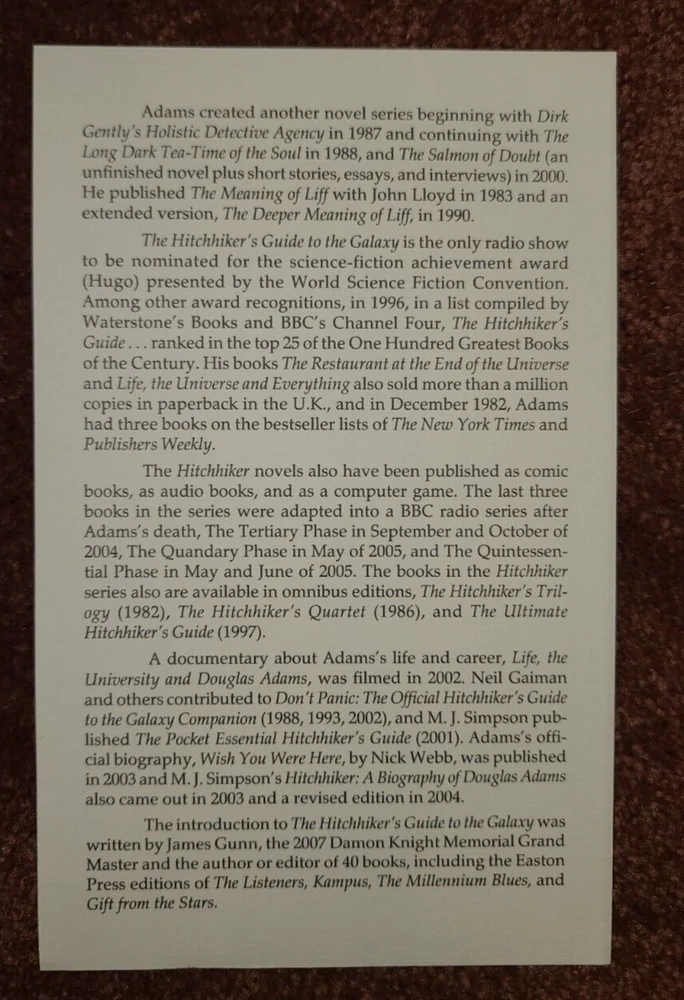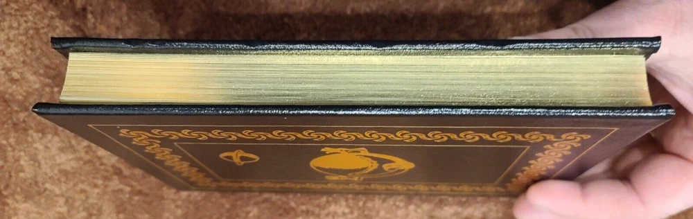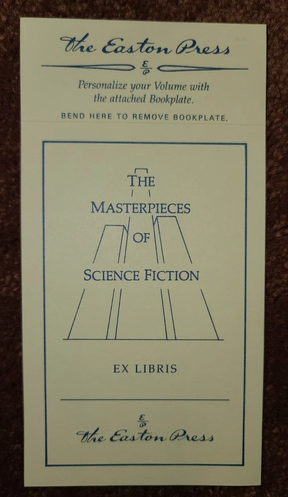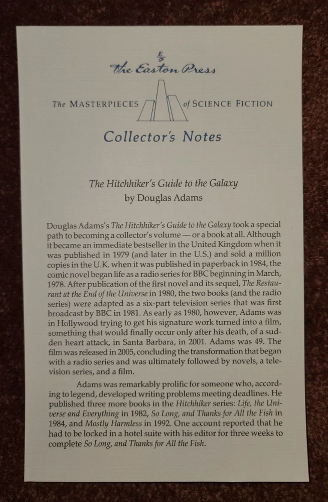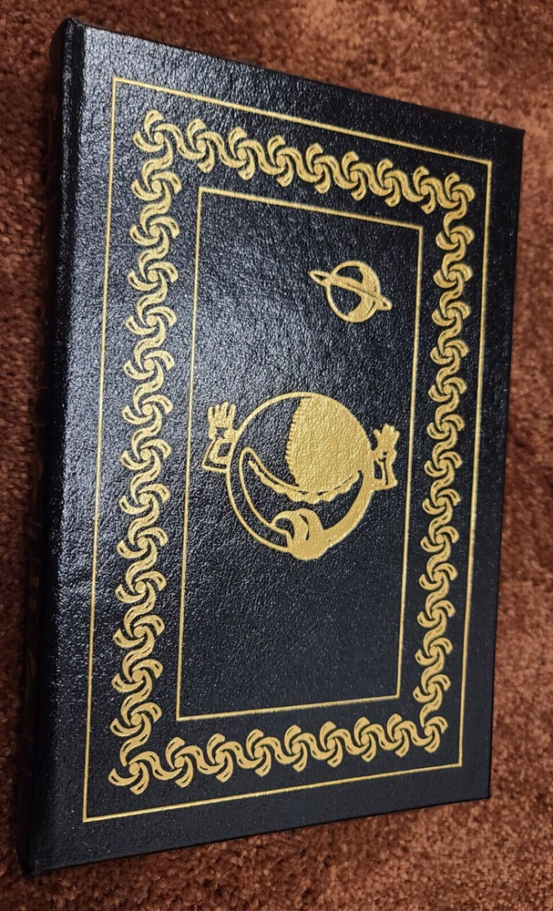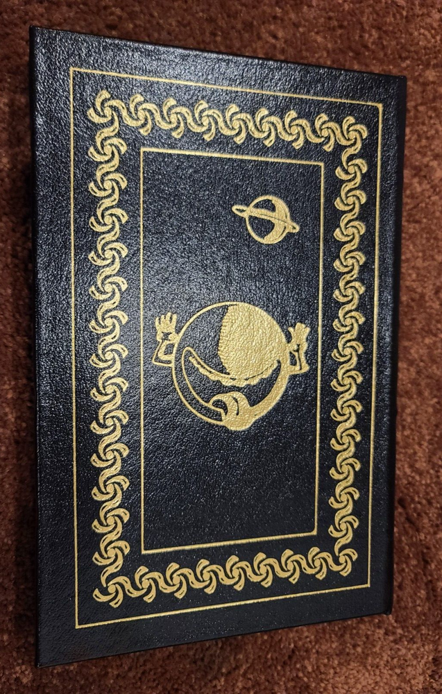 This listing is for my only copy of "The Hitchhiker's Guide To The Galaxy" by Douglas Adams. I started in the masterpieces of science fiction book program by the Easton Press in 1988. Over 3 decades I acquired my collection one book a month. Several of my volumes I was able to get signed by some of the grand masters, now gone. Jack Williamson, L Sprauge DeCamp, Fritz Leiber, Ben Bova, Greg Bear, Poul Anderson, and my favorite, Philip Jose Farmer are just a few of the authors I was able to meet and have my volumes signed before they passed away. Many of my books as such have great meaning to me personally. Douglas Adams passed away in 2001, and this is the only one of his works that saw print in the MSF leather bound book program. This volume of Hitchhiker's Guide To The Galaxy was very short run, and was one of the last of the original program list published. I doubt the print run was even a thousand books, probably as low as five hundred, as they were filling long time subscribers' orders and not necessarily stocking for future subscribers. The Masterpieces Of Science Fiction program was closed out after this book was published as one of the last few new titles. I think it has since been restarted, but with far fewer books, so many in the original run will never be reprinted. My copy is as issued and received from The Easton Press. Unread, with unfolded collector's notes and unattached bookplate. There is no flaking of the gold gilt edges anywhere. The end boards are crisp with no bent edges. The ribbon page marker is in the exact same position as I've never moved it. Shipping will be via USPS well packaged and suitably insured