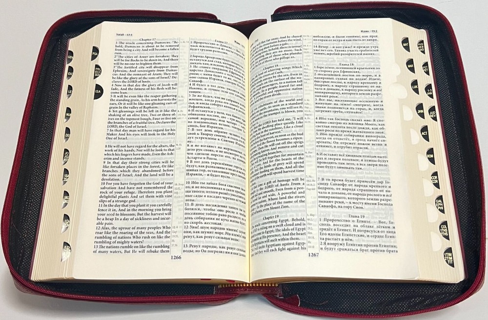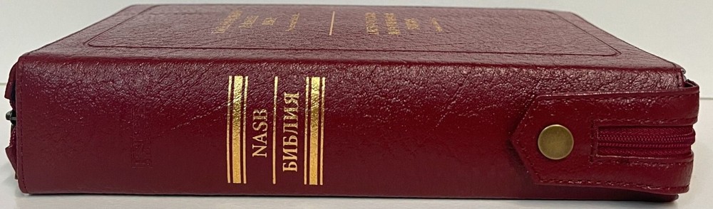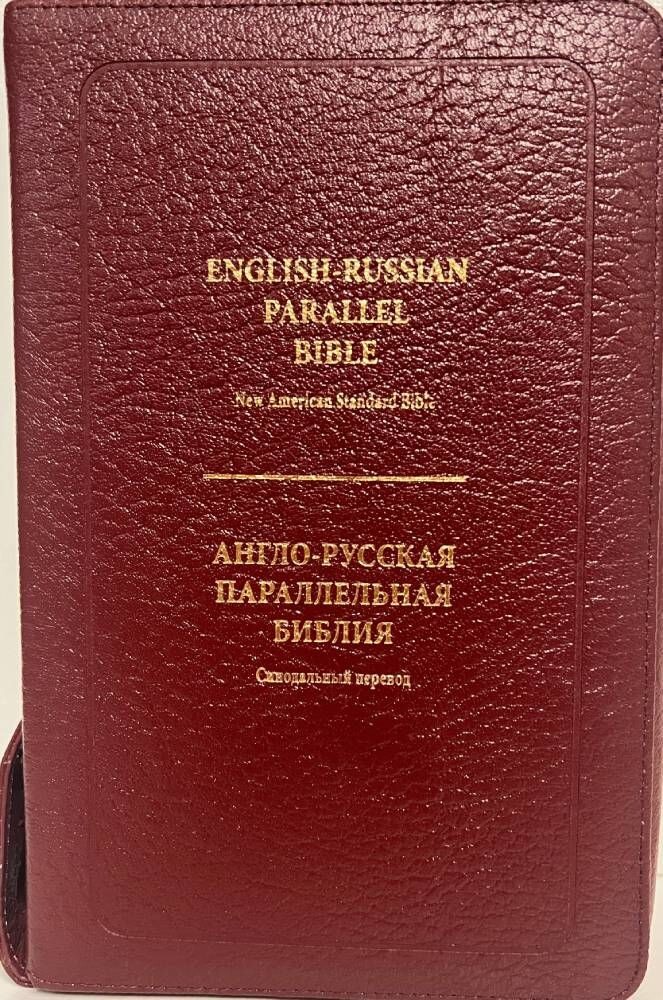 English-Russian Parallel Bible NASB / Synodal Translation. Англо-Русская Параллельная Библия Новый Американский Стандартный Перевод/Синодальный. Кожаный переплет (Genuine leather) Поисковые индексы на английском (Indexes in English). Техт в 2 колонки (Two-column text setting)/ Страницы кремового цвета (Cream-colored Bible paper)/ Паралелльные места на русском (References in Russian)/ 2 закладки (2 ribbons)/ Карты (Maps). Золотой срез (Gold page edges).. На замке и кнопкой на торце (Zipper with side press button) Формат: 5.5 х 9 дюймов (Format: 5.5 x 9 inches)