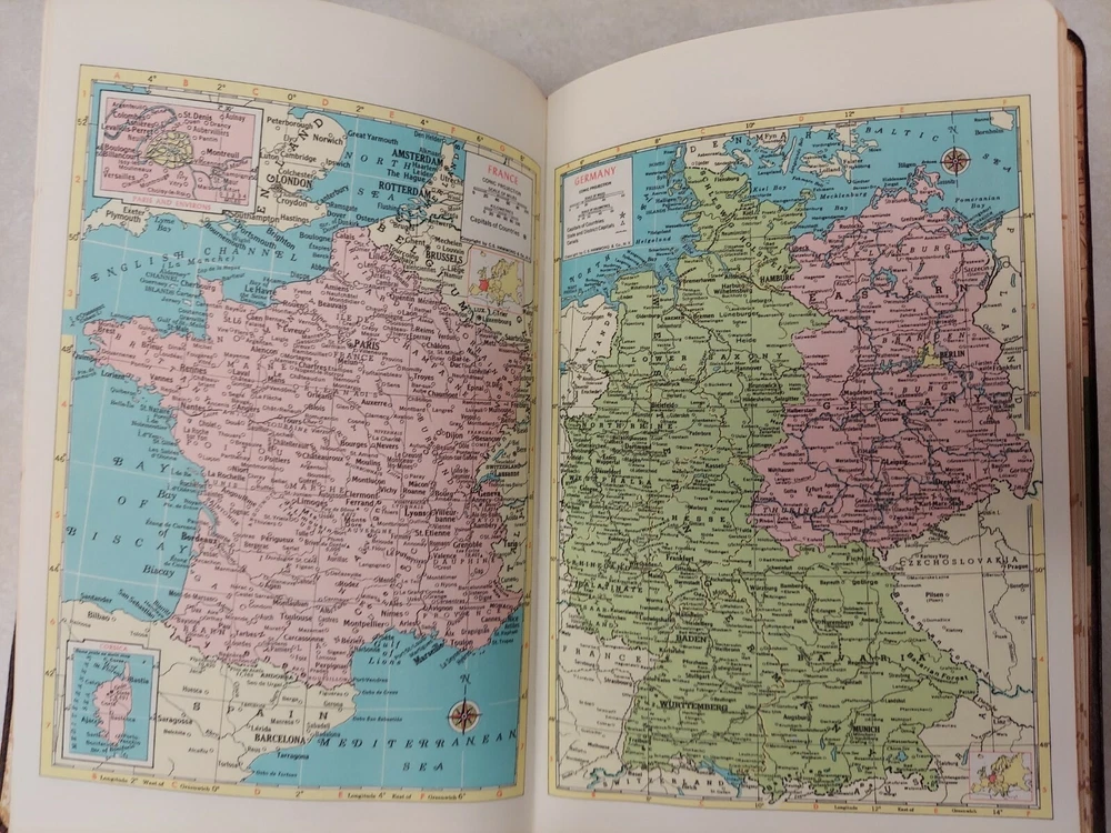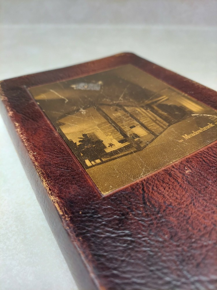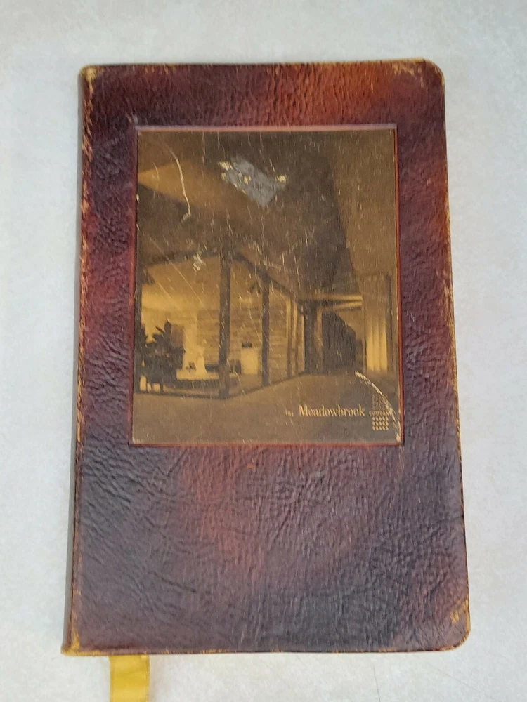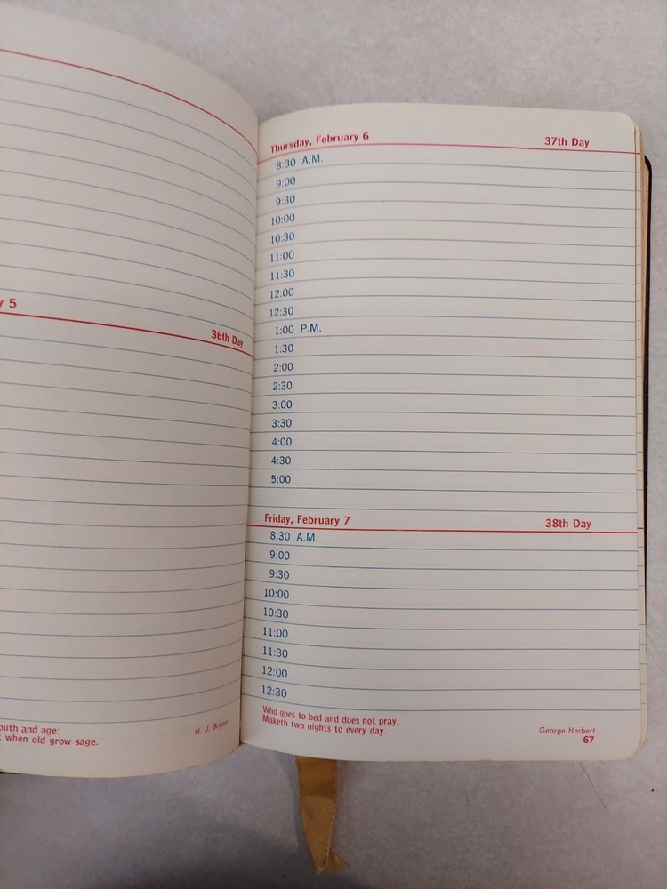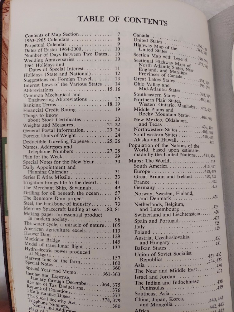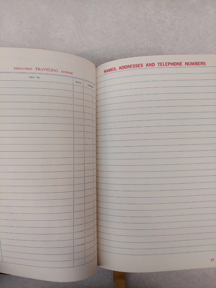 Vintage Worn (yet unused) Leatherbound Notebook 1964 Executive Record and Travel Guide Published by Brown & Bigelow St. Paul Minnesota This is a beautiful executive record keeper. In addition to a 1964 calendar, the journal includes space for: deductible traveling expense, contact information, week planners, hourly planners, color atlas, etc. There is some staining on the golden page edges. A few page corners are bent. Otherwise the book is in good vintage condition.
