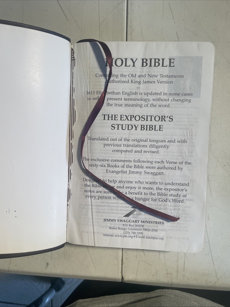 The Expositor's Study Bible Jimmy Swaggart Signature Edition is a valuable resource for anyone interested in religion and biblical commentary. This leather-bound textbook, published by Swaggart Ministries, is written in English and features a burgundy colorway, making it a beautiful addition to any collection. The book includes signatures from the author, Jimmy Swaggart, and is signed by the publisher, making it a unique and collectible item. The book covers the general topic of religion and biblical commentary, and is suitable for adult and further education. This textbook is an excellent choice for anyone interested in studying the Bible in depth. Book is in good condition with some wear. Please see pictures.