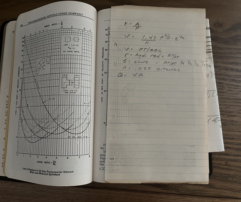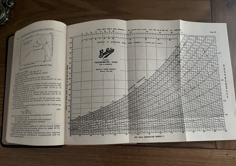 This is a rare and valuable copy of the Fan Engineering Buffalo Forge Company 5th Edition Engineer's Handbook. The beautiful leather bound cover is like new, but the pages are a treasure trove of engineering notes both penciled in and pieces of paper with scribbled math equations. This book was loved and used by two family members. Comes from a smoke free environment. I do combined shipping and ship daily.