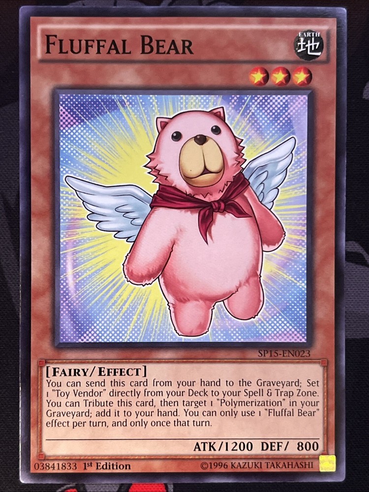 The "Fluffal Bear" card is from the "Star Pack Arc-V" set in the Yu-Gi-Oh! TCG. It is a Fairy-type monster with 1200 Attack and 800 Defense points, belonging to the Earth attribute. This card is a 1st Edition Common / Short Print, featuring an Effect ability, and is in English language. Manufactured by Konami, the card number is SP15-EN023. With its cute design and strategic gameplay potential, "Fluffal Bear" is a sought-after collectible for Yu-Gi-Oh! TCG enthusiasts.