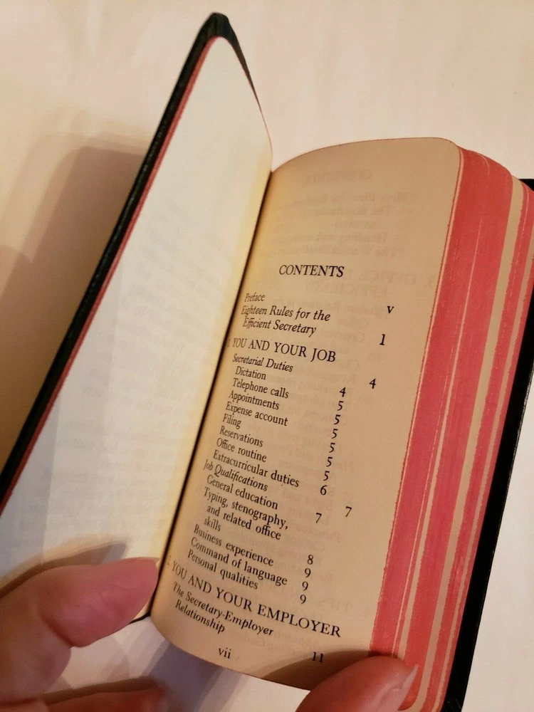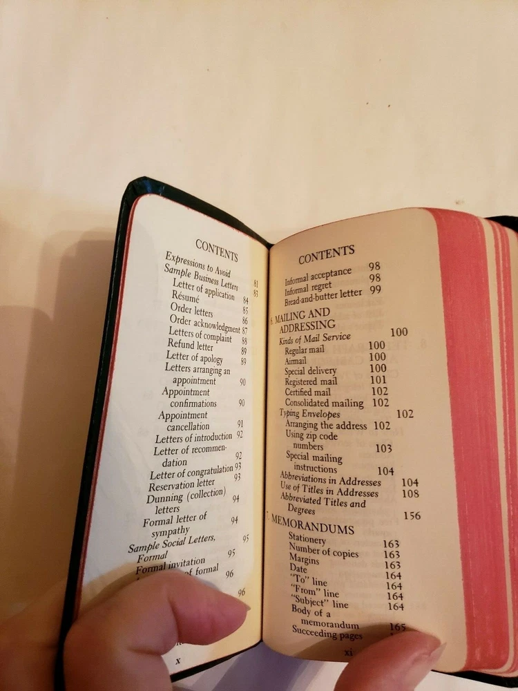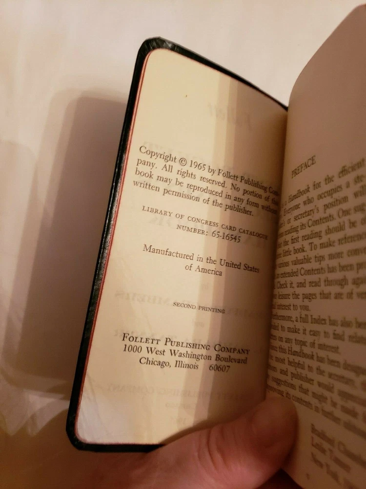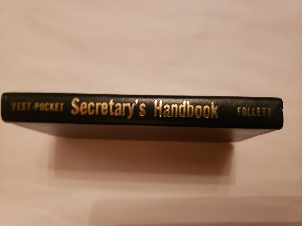 Follett Vest-Pocket Secretary's Handbook Vintage 1965 Free Shipping using Media Mail Publish Date: 1965 Second Printing Length: 332 Pages Color: Forest Green with Gold Lettering Authors: Bradford Chambers and Leslie Barbara Tanner Publisher: Follett Publishing Company Chicago Size: 5-1/2 inches long by 3 inches wide by 3/8 inches thick. Material: Leather Library of Congress Card Catalog Number: 65-16545 Original price is reflected in a gold circle $1.95 on front cover. Condition – Like new. Binding is tight. Book does not appear to have been read or used. No writing, underlining or marks of any kind. Some shelf wear. Price tag looks as if it was in the process of being removed. Please see pictures. Stored in a climate controlled, smoke and mold free location. I tems must be returned in same condition and in original packaging to receive refund. We strive to provide the most accurate measurements and descriptions possible, in some cases measurements may be approximate.
