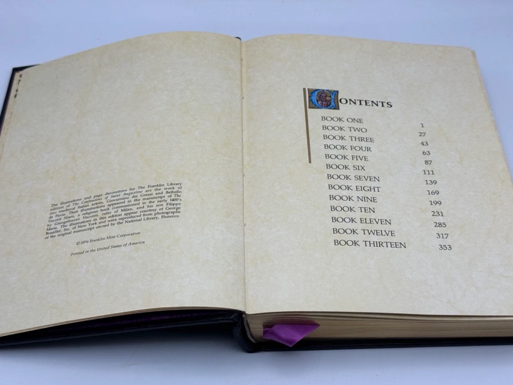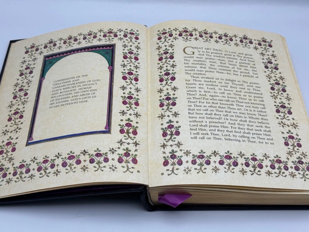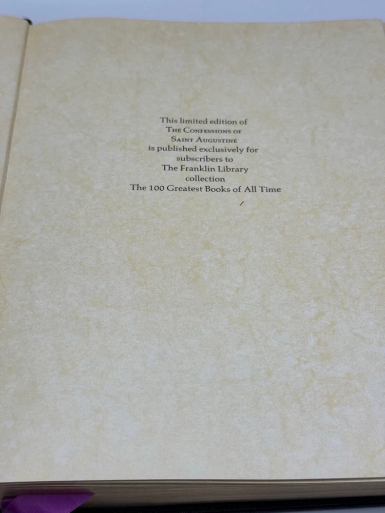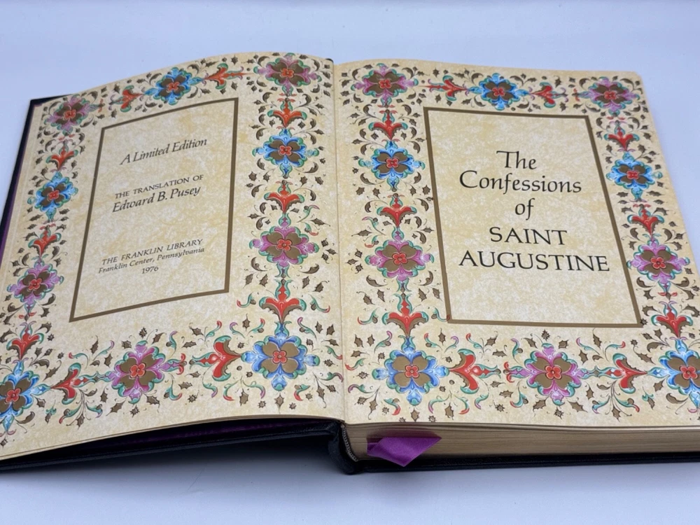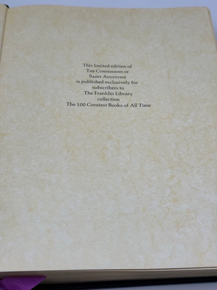 MAKES THE PERFECT GIFT FOR ANY FAN OF THE CLASSICS / VINTAGE COLLECTIBLE LEATHER BOUND BOOKS ON CHRISTIANITY / CATHOLICISM ** PLEASE READ : Mahalo for taking the time to look at our listing. We truly appreciate it. We always do our BEST to give you the most accurate description of these beautiful books. If, however, you have any SPECIFIC questions about the SIZE of the book, NUMBER of pages, TYPE of leather, SMELL or FEEL of the book, PLEASE email us through EBay’s mail system BEFORE you bid, and we will be HAPPY to give you more information. We want you to be completely happy with your purchase and keep you as our customers for years to come!** DESCRIPTION: Franklin Library’s LONG OUT OF PRINT version of the CONFESSIONS OF SAINT AUGUSTINE. THIS IS A VINTAGE HEIRLOOM FRANKLIN WITH LAVISH DEEP GILT IMPRESSIONS TO THE BOARDS AND SPINE with INCREDIBLE VINTAGE ILLUSTRATIONS & DONE IN THE MOST AMAZING FULL-LEATHER BINDING . IT IS ONE OF THE MOST HIGHLY-PRIZED EDITIONS & MOST BEAUTIFUL EDITIONS OF THIS MASTERPIECE YOU CAN FIND. 🍍 NOT INCLUDED... 😊 ABOUT THE BOOK: Heartfelt, incisive, and timeless, The Confessions of Saint Augustine has captivated readers for more than fifteen hundred years. Retelling the story of his long struggle with faith and ultimate conversion -- the first such spiritual memoir ever recorded -- Saint Augustine traces a story of sin, regret, and redemption that is both deeply personal and, at the same time, universal. Starting with his early life, education, and youthful indiscretions, and following his ascent to influence as a teacher of rhetoric in Hippo, Rome, and Milan, Augustine is brutally honest about his proud and ambitious youth. In time, his early loves grow cold and the luster of wordly success fades, leaving him filled with a sense of inner absence, until a movement toward Christian faith takes hold, eventually leading to conversion and the flourishing of a new life. Philosophically and theologically brilliant, sincere in its feeling, and both grounded in history and strikingly contemporary in its resonance, The Confessions of Saint Augustine is a timeless classic that will persist as long as humanity continues to long for meaning in life and peace of soul. CONDITION: Book is in LIKE NEW condition for its age with a faint rubs to the gilt page ends (SEE PICS FOR BETTER DETAILS). NO ATTACHED BOOKPLATES, WRITING FROM PREVIOUS OWNER, ETC. It is a GORGEOUS edition. SHIPPING: FREE TO US ADDRESSES ONLY. INTERNATIONAL $ based on location. WE SHIP PRIORITY MAIL AND PACK VERY WELL. Please check out our other listings of Easton Press, Franklin Library, Limited Editions Club, First Edition Library, Folio Society, Heritage Press, and International Collectors Library editions. WE DO COMBINE SHIPPING IF YOU PURCHASE MORE THAN ONE COPY. Mahalo for looking at our listings! By bidding/purchasing this item, you are helping a very grateful family who sends you our WARMEST ALOHA & MAHALO!
