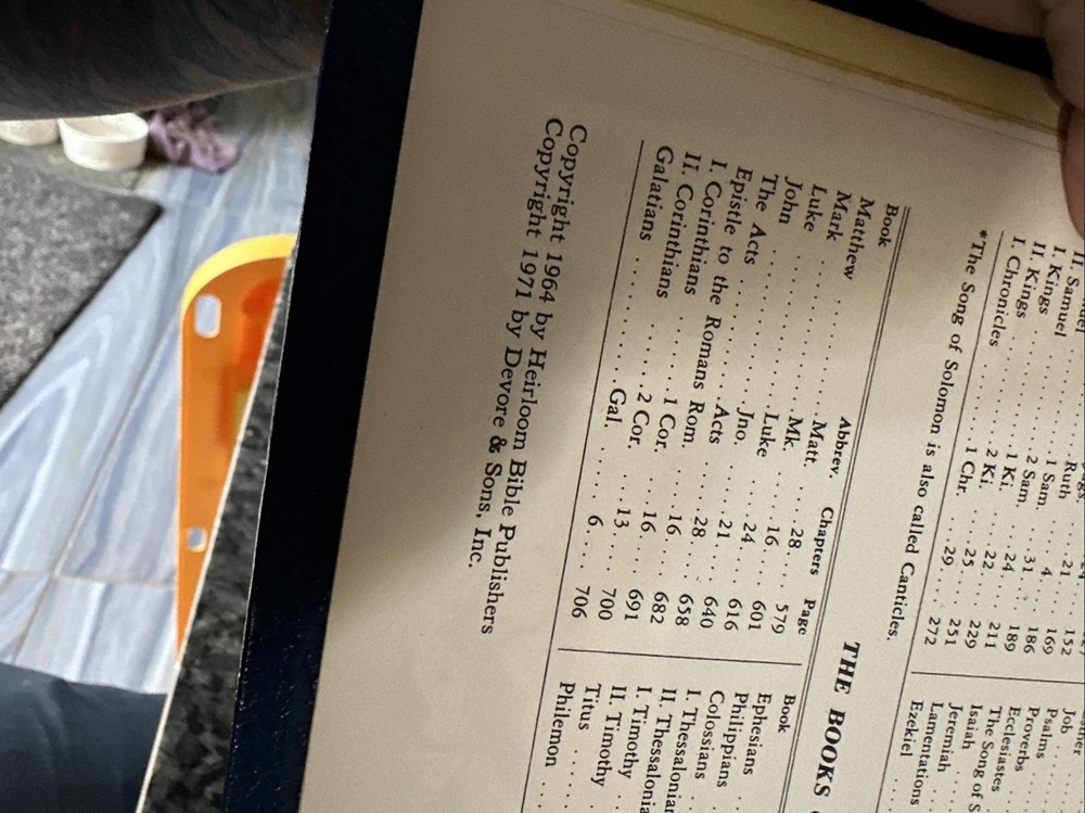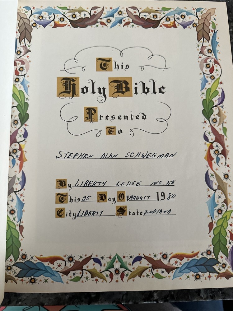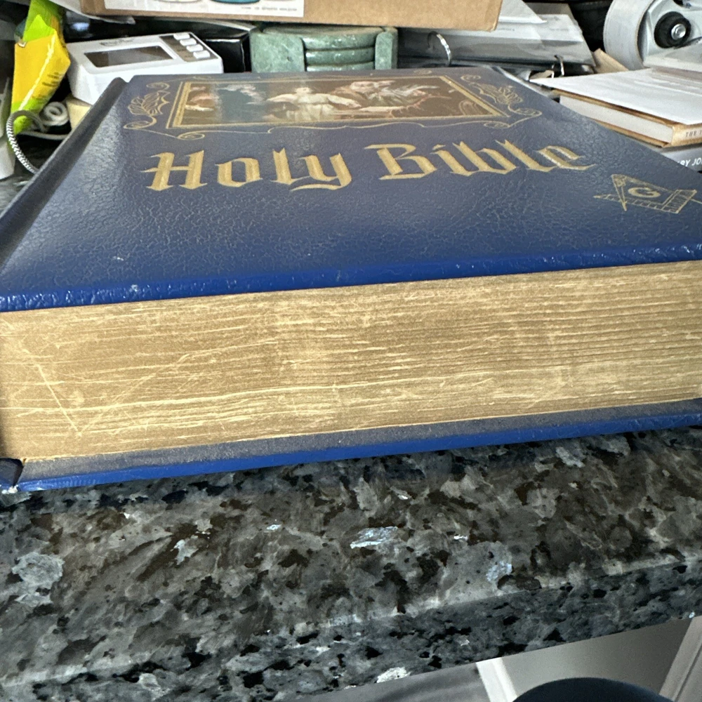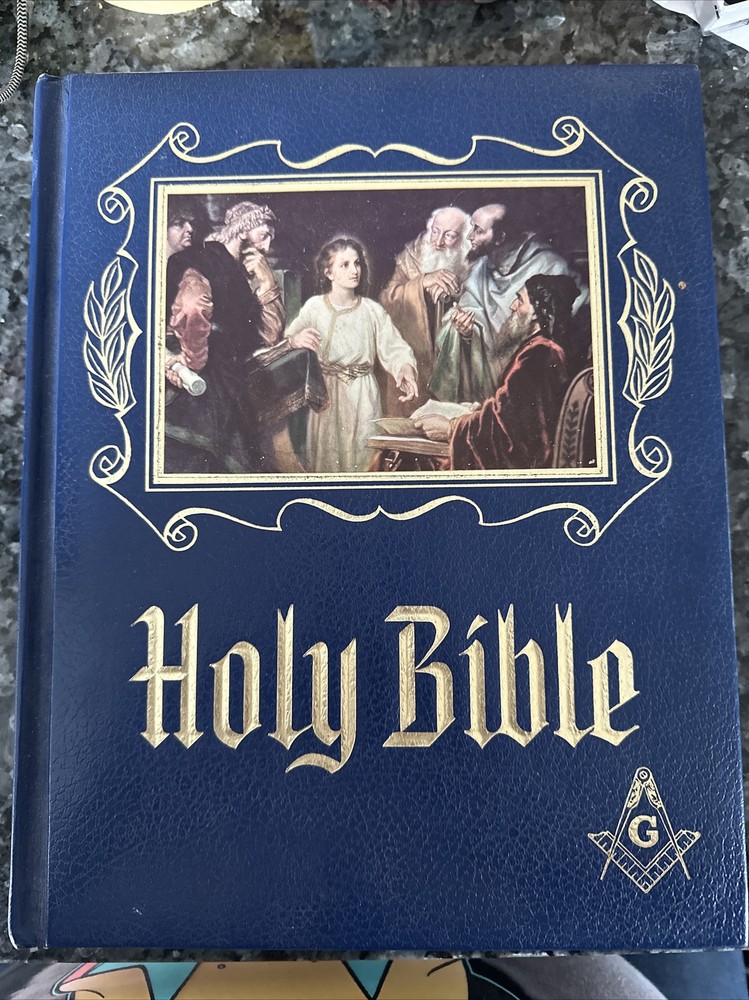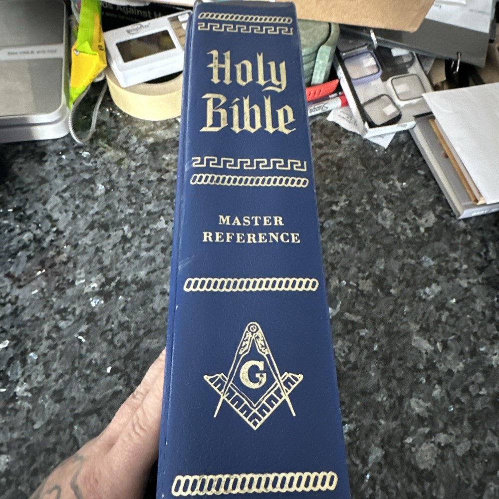 This is a special edition of the Holy Bible, adorned with Masonic symbolism and intended for adults interested in spiritual books. It features a beautiful faux leather binding, Biblical maps, and over 900 pages of King James Version text. The book is inscribed and signed by fellow Freemasons and includes a Biblical index to Freemasonry, a Masonic beliefs and creed section, and questions and answers on Freemasonry. Published in 1971, this vintage Bible is a valuable addition to any collection and a perfect heirloom for Masonic families.