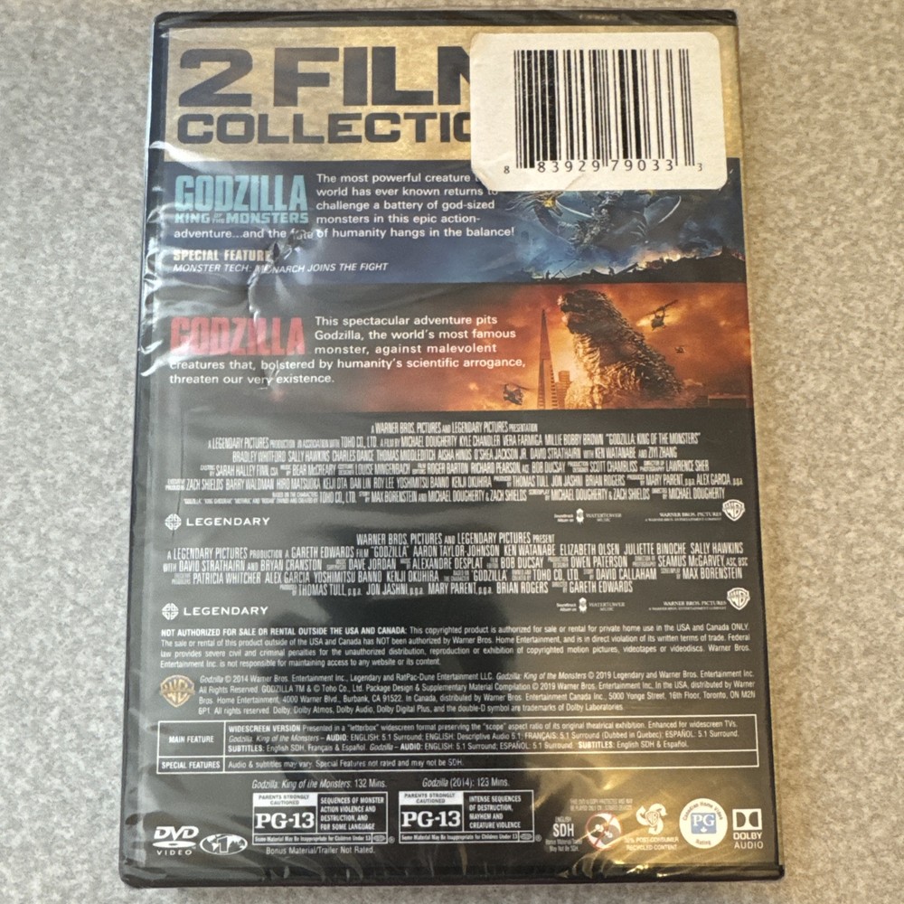 Immerse yourself in the thrill of cinematic destruction with the "Godzilla 2 Film Collection: Godzilla / King of the Monsters." This set features two epic films that bring to life the monster mayhem in stunning high definition. Relive the action and adventure as Godzilla and other iconic creatures battle it out for supremacy. The films are presented in the universally compatible NTSC format, ensuring a seamless viewing experience on DVD players in North America. The collection comes in a sleek tall DVD case, making it a standout addition to any film aficionado's library. Both films are offered in English with subtitles available in the same language, catering to a broad audience. Rated NR, this set from Warner Home Video is perfect for fans of horror and action who appreciate the chilling excitement that only Godzilla can deliver.