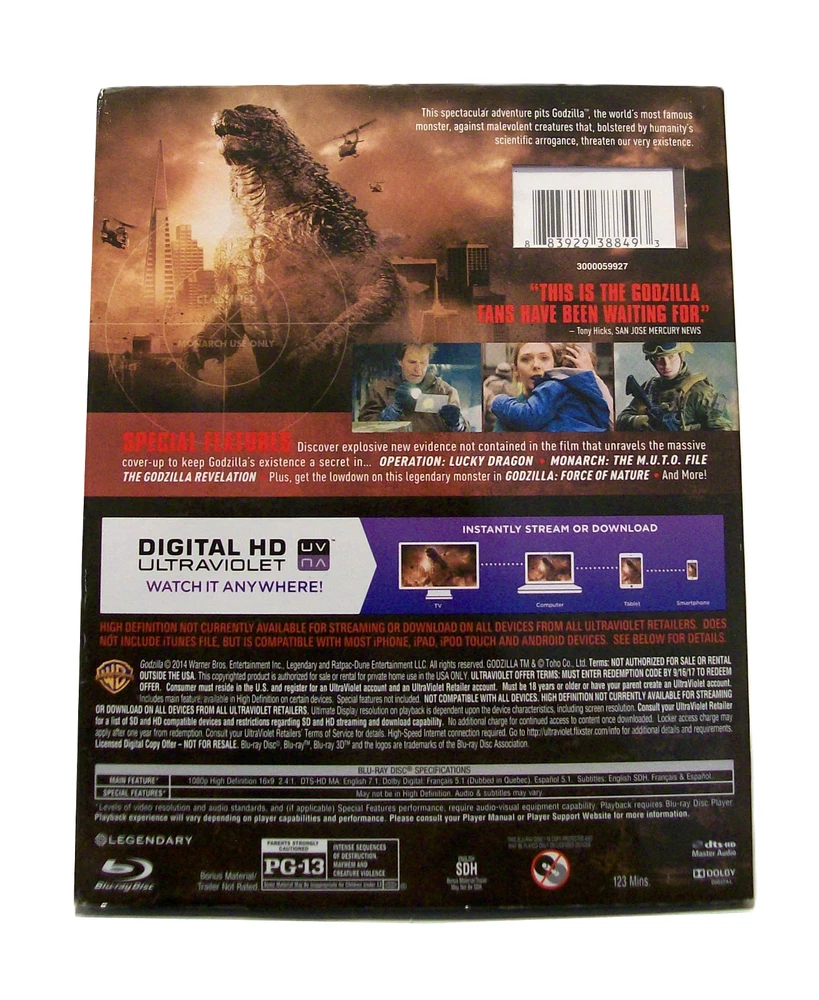 LEGENDARY PICTURES, WARNER BROTHERS HOME ENTERTAINMENT BLU-RAY + DVD GODZILLA BLU-RAY + DVD + **DIGITAL HD released in 2014 Movie released in 2014 **(DIGITAL HD subject to expiration after 9/16/2017) REGION A (BLU-RAY) REGION 1 (DVD) New, sealed (see item description), Widescreen English, French, Spanish language English SDH, French, Spanish subtitles Includes featurettes and more Blu-ray slipcover included (wear and tear evident) Directed by GARETH EDWARDS Starring BRYAN CRANSTON, AARON TAYLOR-JOHNSON PLOT SYNOPSIS: The world's most revered monster is reborn as visionary new director Gareth Edwards (Monsters) unleashes the epic action-adventure GODZILLA. Starring an international ensemble cast led by Aaron Taylor-Johnson, Ken Watanabe (The Last Samurai, Inception), Elizabeth Olsen, Juliette Binoche (The English Patient) and Sally Hawkins (Blue Jasmine) with David Strathairn (Good Night, and Good Luck.) and Breaking Bad's Bryan Cranston. GODZILLA is a powerful story of human courage and reconciliation in the face of titanic forces of nature -- when the awe-inspiring creature rises to restore balance as humanity stands defenseless. This spectacular adventure pits the world's most famous monster against malevolent creatures that, bolstered by humanity's scientific arrogance, threaten our very existence. Check out our other listings! IMPORTANT!!!! Please read the following: WE GLADLY COMBINE SHIPPING COSTS ON ALL E-BAY PURCHASES. PLEASE E-MAIL WITH ANY QUESTIONS. ANY AND ALL INTERNATIONAL BIDDERS MUST E-MAIL BEFORE AUCTION'S END REGARDING SHIPPING COSTS OUTSIDE OF THE UNITED STATES, AS SHIPPING RATES WILL VARY. Due to people not leaving feedback! we will be leaving feedback only upon receipt of feedback. Sorry for this action and thanks for your understanding. Thank you for looking. Any and all eBay auction sales to be paid for in full within SEVEN days of the auction's end. Other arrangements regarding payment to be authorized by the seller (that's me!) only after e-mail notification and at my discretion. I gladly combine shipping costs for multiple auctions wins and will ship worldwide. Shipping costs outside of the U.S. to be provided after the auction's end and/or after the buyer has contacted me via e-mail. I value positive feedback regarding all transactions and leave FEEDBACK after every sale. I expect the buyer to do the same. Bidding on any item on EBAY constitutes a contract to buy that item, so only serious buyers are encouraged. If for any reason payment is not made for the final sale and/or in a timely fashion agreed upon, I as the seller reserve the right to relist the item, and feedback for the transaction will reflect that fact. Thank you, and Happy eBaying!!!