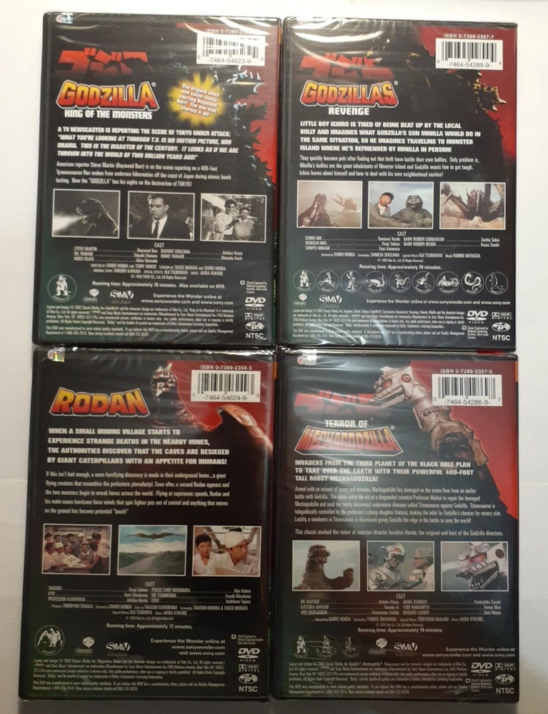 GODZILLA 4 DVD LOT Godzilla - King Of The Monsters Godzilla's Revenge Rodan Terror of Mechagodzilla Brand new sealed and in perfect condition! Packaged with lots of care!