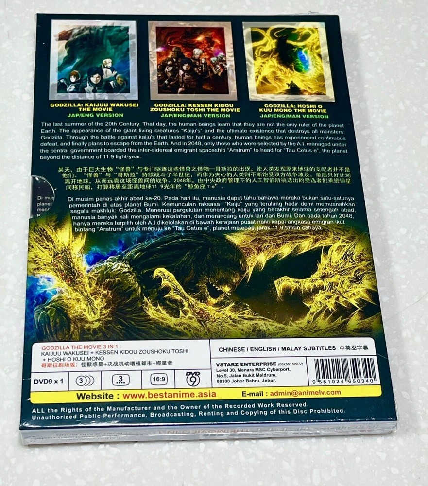 We only sell original DVD and our product come from licensed Publisher in Malaysia. All our product come with original seal Authentication from Malaysia government and authorized by National Film Development Corporation Malaysia. Item Title: Movie 1: Planet of the Monsters Movie 2: City on the Edge of Battle Movie 3: The Planet Eater Number of Episode: 3 Movie Number of Disc: 1 DVD Language: English / Japanese Language Subtitle: English / Chinese Subtitle Region Code: All Region DVD Format: NTSC Item Condition: Brand New & Factory Seal Synopsis: Shipping & Handling: For international deliveries within worldwide we are offer Quantium Solution / Singpost (Register Airmail with tracking number) . About d elivery time will be taken 7 - 21 working days for process and delivered the destination country. Item will be shipped ONLY after clearing of payment. All order will process 2-3 working days (Not include weekend or public holiday) after received the payment. We only ship to confirm address on "Ebay Invoice Order Detail". International buyer will responsible for any import duties and taxes. We do not ship country to North Korea. Payment Method: Payment is required within 7 days of purchase. If for any reason you are unable to pay within 7 days, please contact us prior to bidding/buying. We are flexible with our payment terms for people who contact us first. We only accept the "PayPal" payment methods. Returns Policy: "If buyer have received the incorrect item please contact us as soon as possible and provide photo's which incorrect item status can clearly be show. We will resolve the problem quickly and after confirm we will replace the correct item to buyer as soon as possible." Each customer must contact us prior to any return. Returns and/or exchanges of merchandise must take place within 21 working days of receipt of product. All products to be returned must be in unused original condition, including packaging, documentation, warranty cards, manuals, accessories, etc. The product's original factory seal must be intact. All item must be shipped back with a tracking number for inspection and processing prior to refund. If an item is shipped back to us without a tracking and is not received there will be no way to verify if the item was ever shipped to us. If the order qualified for free shipping we will with hold and not refund the shipping and handling costs incurred by us. We reserve the right to decline any return or exchange where the product is not in acceptable condition. In order to continue to offer the lowest prices of the internet, we cannot provide refunds for opened products that are not defective nor can we refund freight or handling charges. The terms of our return policy may change without notice. Please DO NOT PURCHASE this item if you have 0 FEEDBACK unless you have contacted us before, otherwise we have NO OBLIGATION to sell the item and the case will be reported to e b a y accordingly