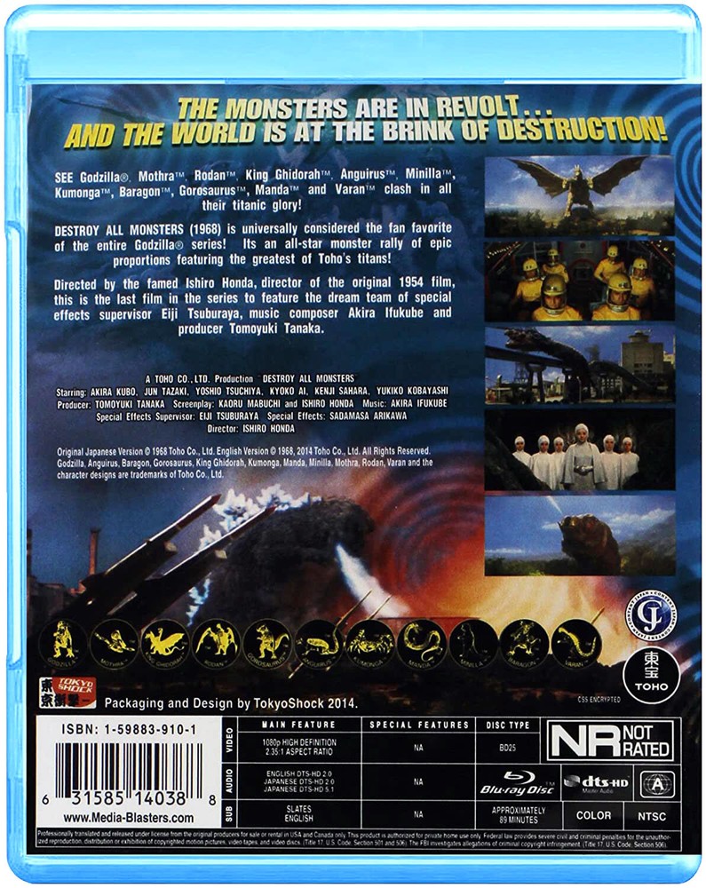 Product Description See Godzilla, Mothra, Rodan, King Ghidorah, Anguirus, Minilla, Kumonga, Baragon, Gorosaurus, Manda and Varan clash in all their titanic glory! DESTROY ALL MONSTERS! is universally considered the fan favorite of the entire Godzilla series! It's an all-star monster rally of epic proportions featuring the greatest of Toho's titans! Directed by Ishiro Honda, director of the original Godzilla, this is the last in the series to feature the dream team of special effects supervisor Eiji Tsuburaya, music composer Akira Ifukube and producer Tomoyuki Tanaka. Product details Is Discontinued By Manufacturer : No MPAA rating : PG (Parental Guidance Suggested) Product Dimensions : 7 x 5.25 x 0.5 inches; 2.4 Ounces Director : Ishiro Honda Media Format : Multiple Formats, Blu-ray, Widescreen Run time : 1 hour and 29 minutes Release date : August 26, 2014 Actors : Akira Kubo Subtitles: : English Language : ENGLISH (DTS-HD 2.0), JAPANESE (Dolby Digital 5.1) Studio : Tokyo Shock ASIN : B00JQYUZSS Number of discs : 1 ALL original ART-WORK and original studio blu ray in New condition sold as is / all sales are final / NO Refunds and NO Returns thank you happy biding and buying