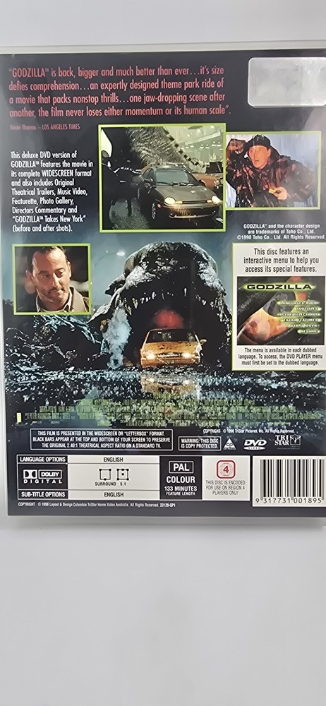 Get your hands on the "Godzilla" DVD from 1998, featuring Hank Azaria in this action-packed adventure film. This Standard Edition DVD is in PAL format with a 16:9 aspect ratio, perfect for fans of drama and adventure genres. The DVD includes English language with subtitles, making it a must-have for movie enthusiasts. Don't miss out on this Warner Bros production, suitable for Region 4 (AU, NZ, Latin America), and enjoy free shipping with this purchase.